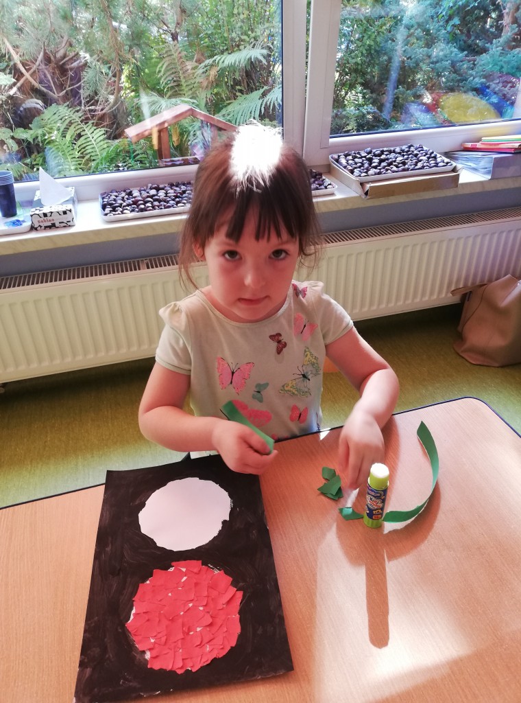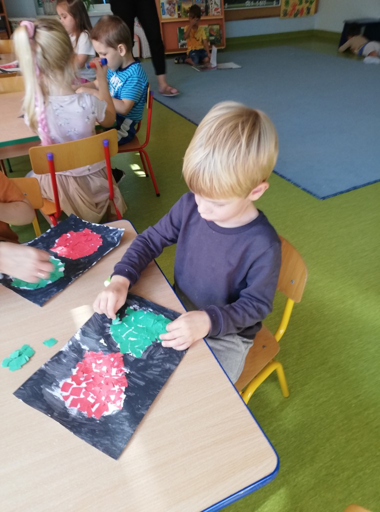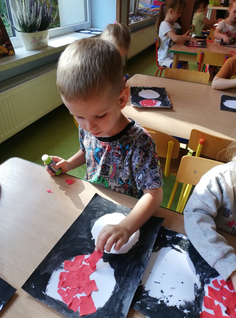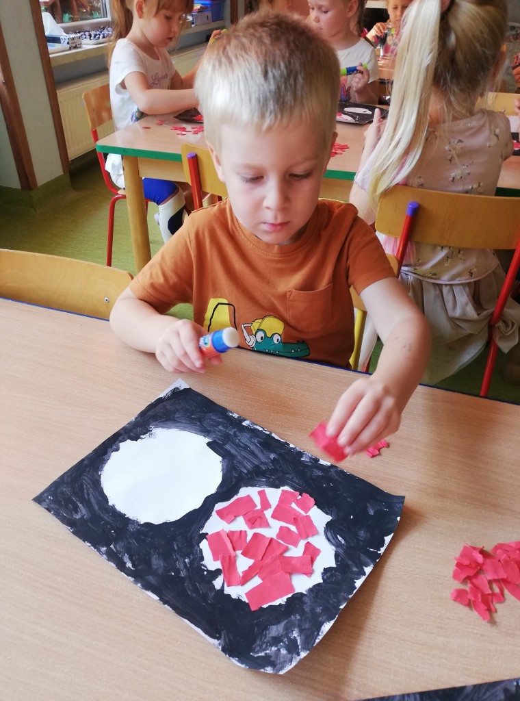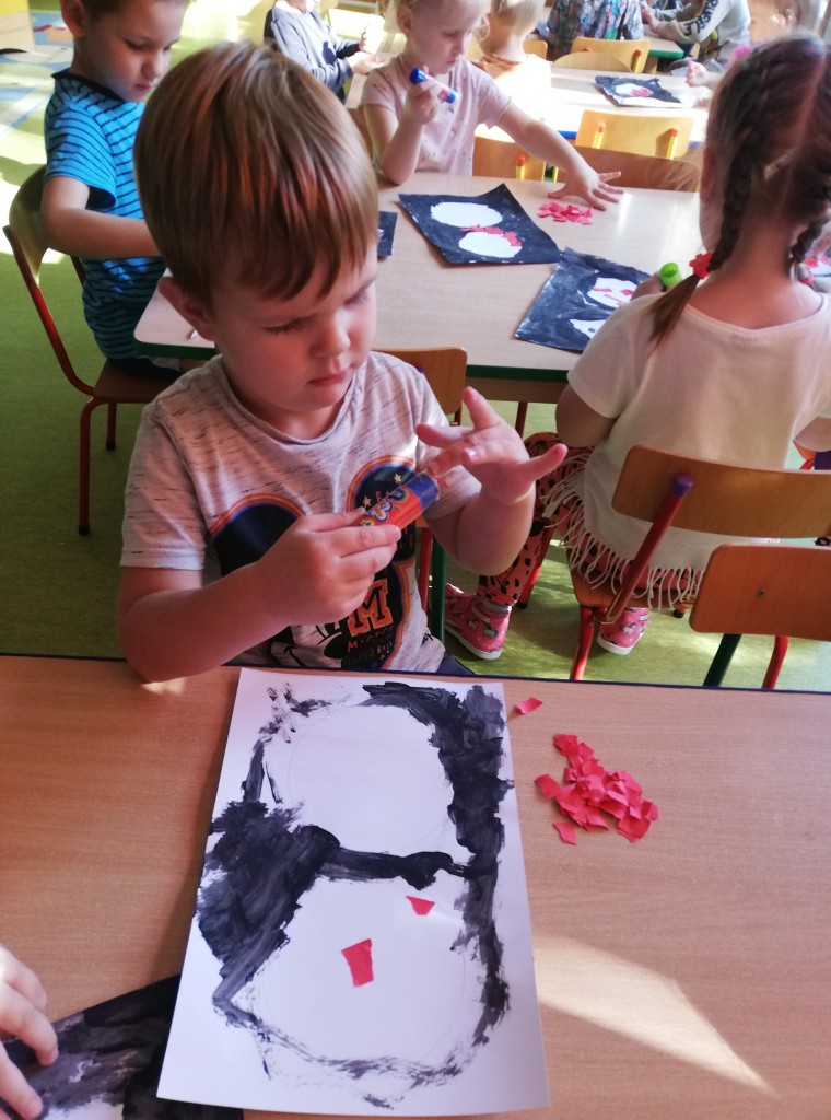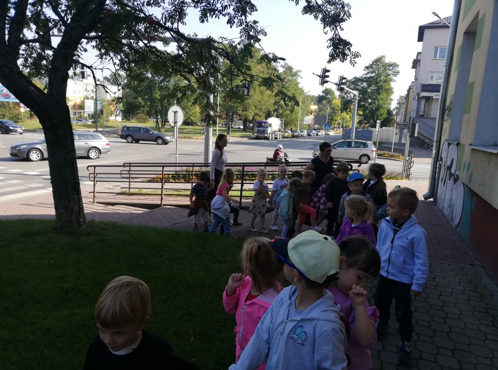 W ostatnim tygodniu września w ramach tematyki „Bezpieczna droga do przedszkola”, poznaliśmy zasady bezpiecznego zachowania się w ruchu drogowym. W czasie wyjścia na największe w pobliżu przedszkola skrzyżowanie, obserwowaliśmy ruch uliczny, zmieniające się kolory światła sygnalizatora, ćwiczyliśmy umiejętności poruszania się w pobliżu jezdni oraz prawidłowego przechodzenia przez pasy. Po dokonanych obserwacjach, samodzielnie wykonaliśmy sygnalizator świetlny. Zwieńczeniem tygodnia pełnego wyzwań, było ciekawe i pouczające spotkanie z policjantami.