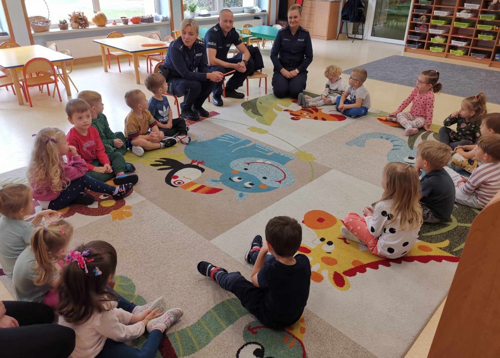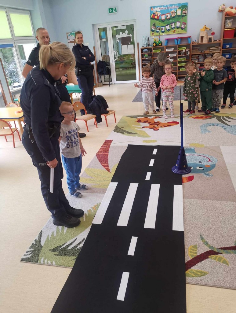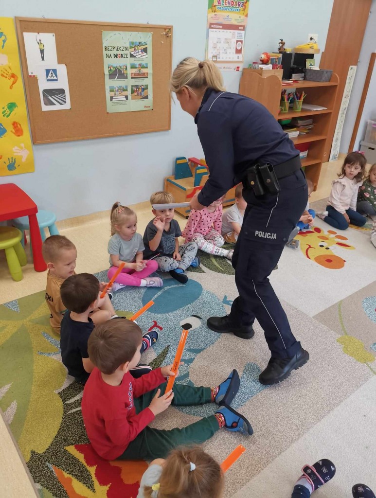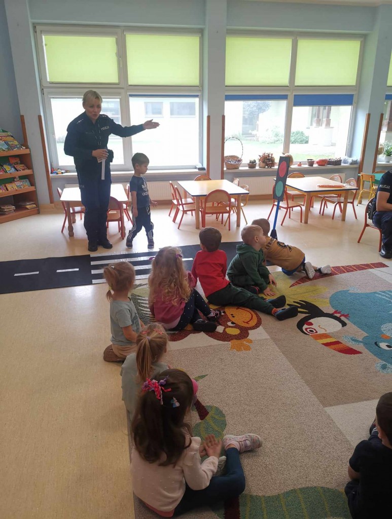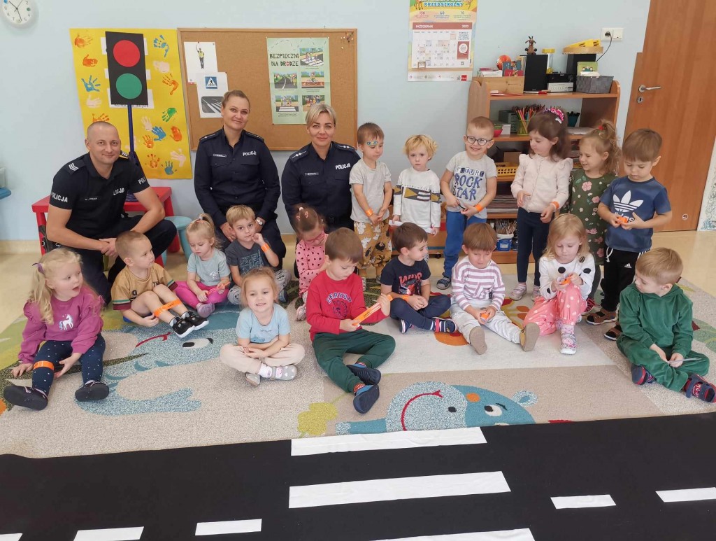 W tygodniu pt.: „ Bezpieczny przedszkolak” mieliśmy przyjemność gościć Panią aspirant Renatę Burdach wraz ze współpracownikami z Komendy Miejskiej Policji w Białej Podlaskiej. Dzięki spotkaniu dowiedzieliśmy się na czym polega praca policjanta. Wiemy, na jakim świetle i w jakim miejscu możemy przechodzić przez ulicę oraz jak ważne jest, abyśmy nie oddalali się od osoby dorosłej. Poznaliśmy również zasady bezpiecznego poruszania się po chodniku podczas spacerów. Na koniec spotkania zostaliśmy obdarowani odblaskami, które mają przypominać nam jak ważne jest nasza widoczność na drodze.