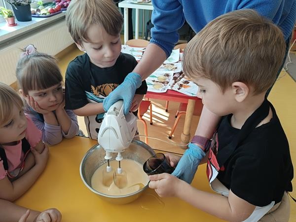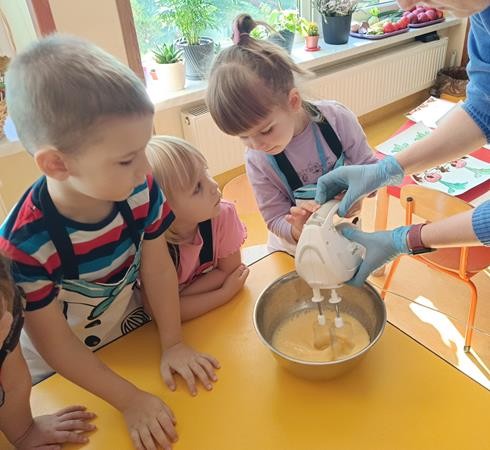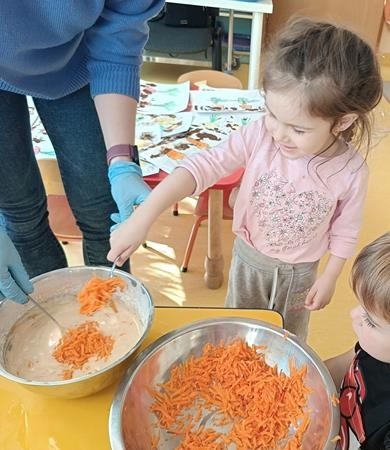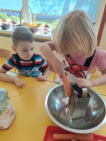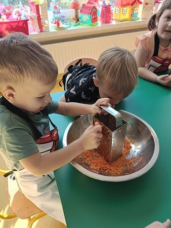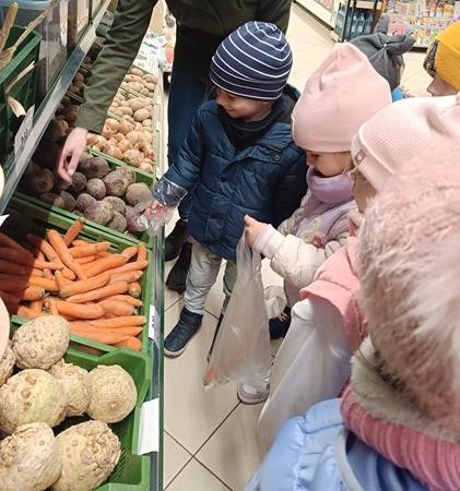Dzieci z naszej grupy w ramach realizacji bloku tematycznego o jesiennych warzywach wybrały się do pobliskiego sklepu po przepyszną marcheweczkę z której zrobiły ciasto marchewkowe.