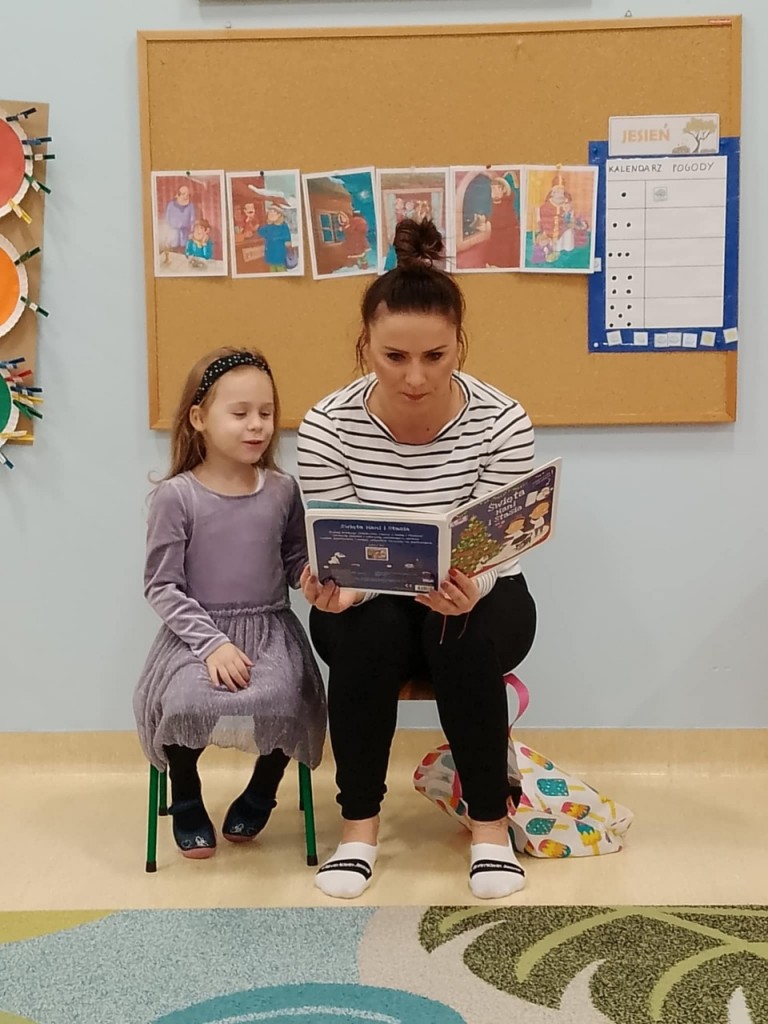 W pierwszym tygodniu grudnia mieliśmy przyjemność gościć panią Martę- mamę Marysi S., która przeczytała nam książkę pt. „ Święta Hani i Stasia”- wprowadzając nas w klimat świąt Bożego Narodzenia.