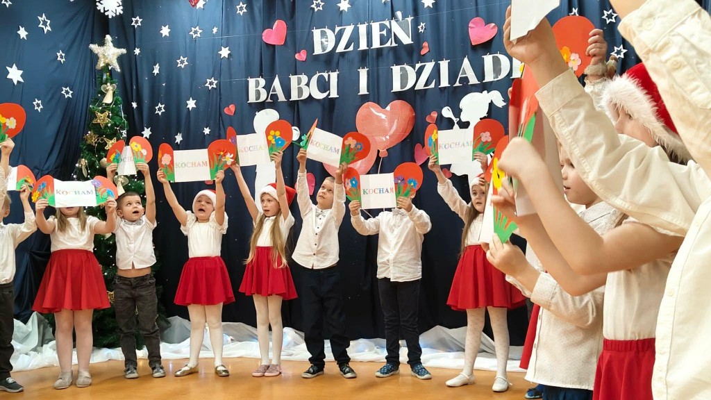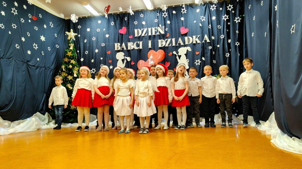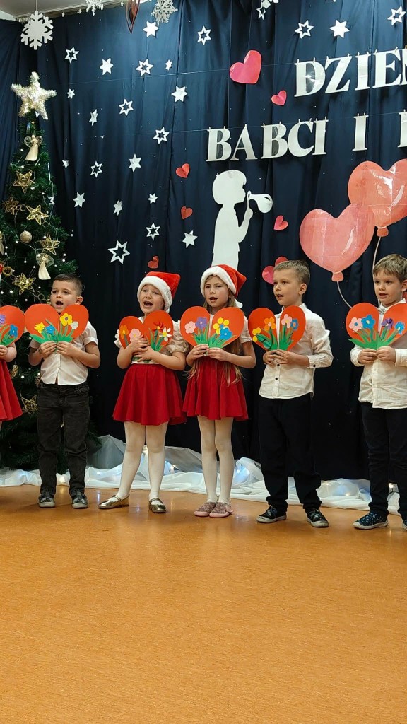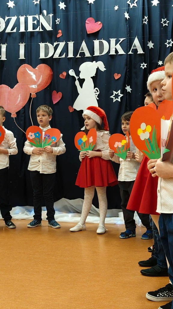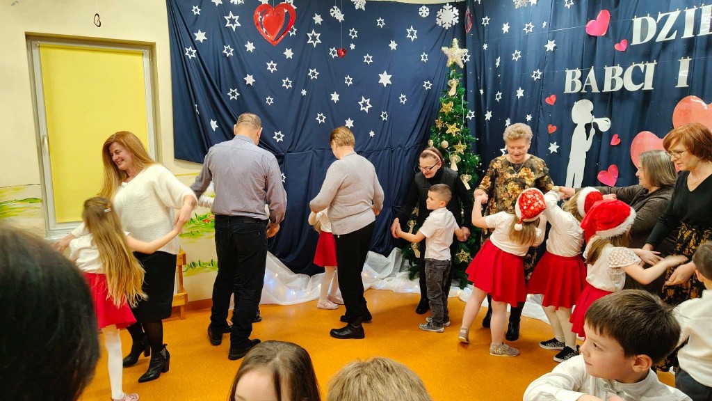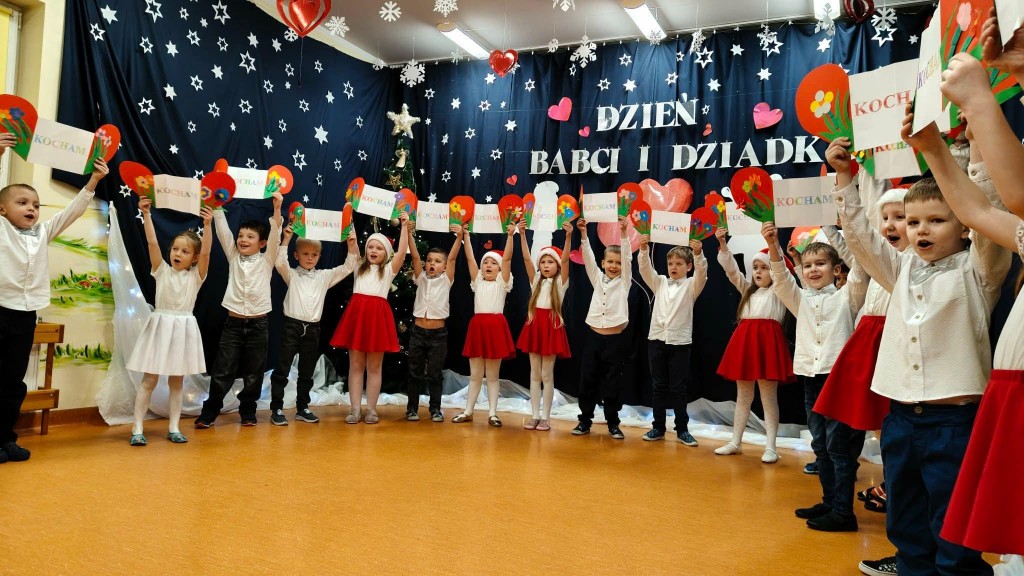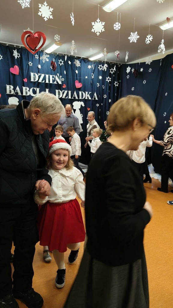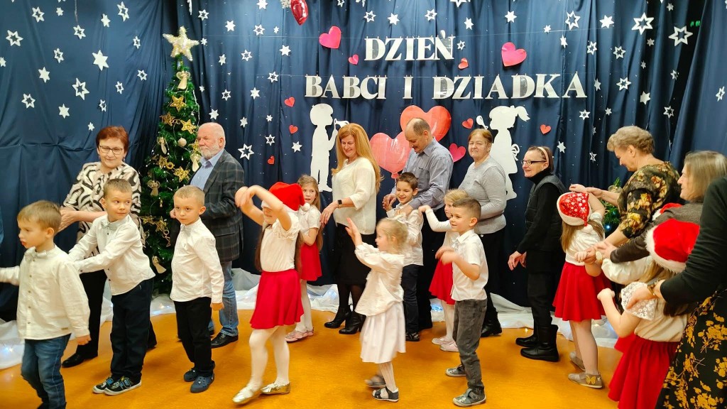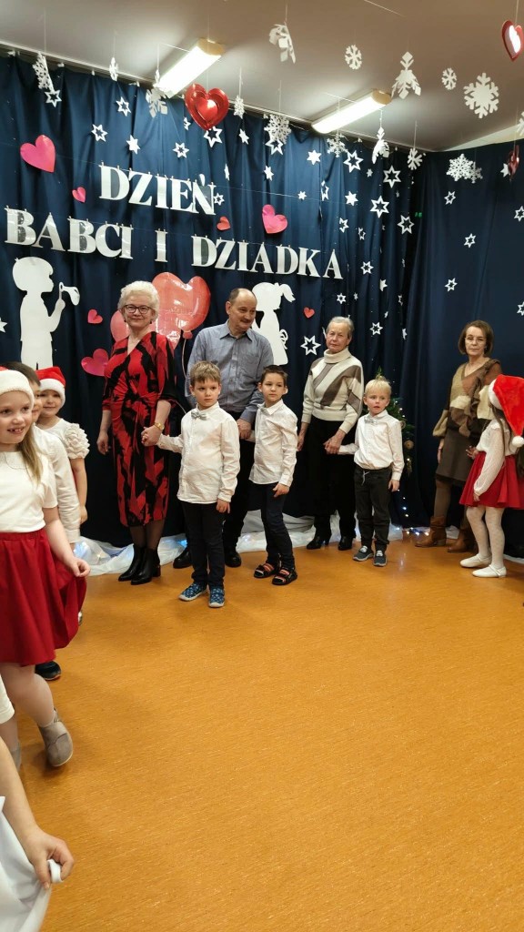 26 stycznia w naszej grupie odbyła się uroczystość z okazji Dnia Babci i Dziadka. Zaproszeni goście mieli okazję podziwiać swoje wnuki w specjalnie dla nich przygotowanym programie artystycznym. Wszyscy z dumą patrzyli na swoje wnuczęta, które włożyły wiele wysiłku w to, aby jak najlepiej wyrazić swoją miłość i szacunek oraz podziękować Dziadkom za cierpliwość, zrozumienie i opiekę, a przede wszystkim za czas, który zawsze mają dla swoich wnuków. Niejednej Babci i Dziadkowi łezka kręciła się w oku, a na ustach można było zobaczyć uśmiech. Publiczność nie żałowała również pochwał dla swoich wnuków i nagrodziła ich gromkimi brawami. Na koniec tych wyjątkowych występów dzieci wręczyły swoim ukochanym Babciom i Dziadkom własnoręcznie przygotowane kubeczki. Zwieńczeniem naszego spotkania był słodki poczęstunek przygotowany przez rodziców oraz wspólne tańce z Dziadkami, którym towarzyszyła radość ze wspólnej zabawy z wnukami.