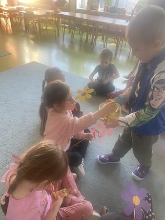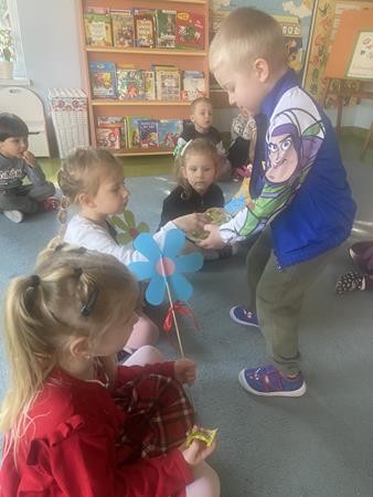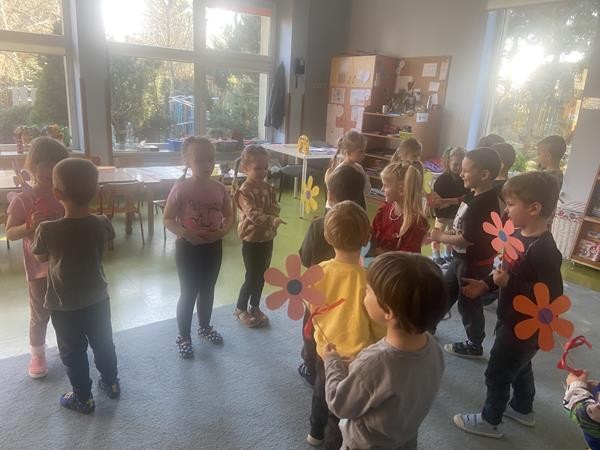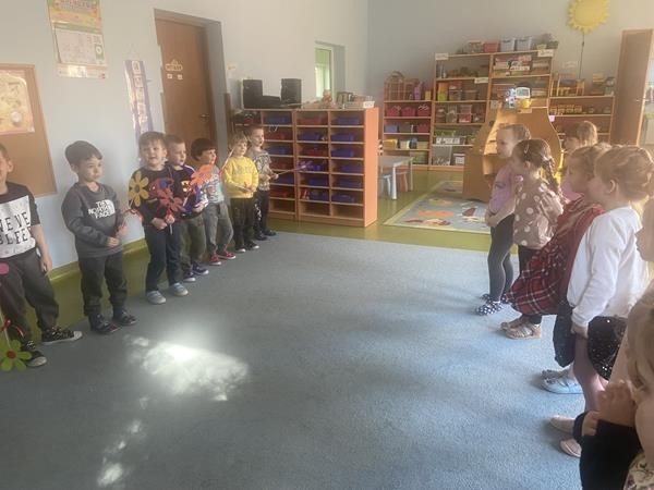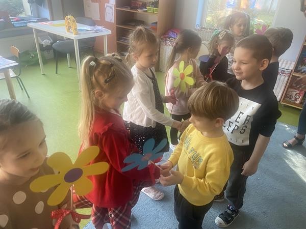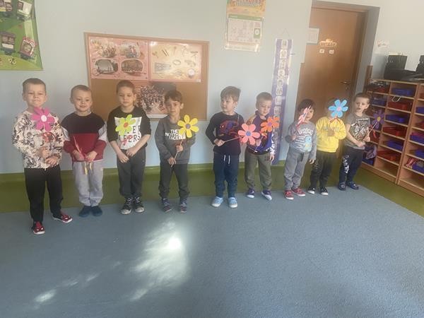 8 Marca świętowalismy w naszej grupie Dzień Kobiet. Wszyscy chłopcy złozyli dziewczynkom życzenia, wręczyli kwiatki oraz słodki upominek.