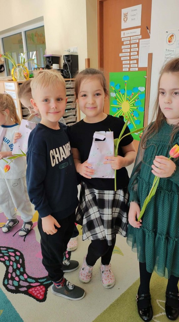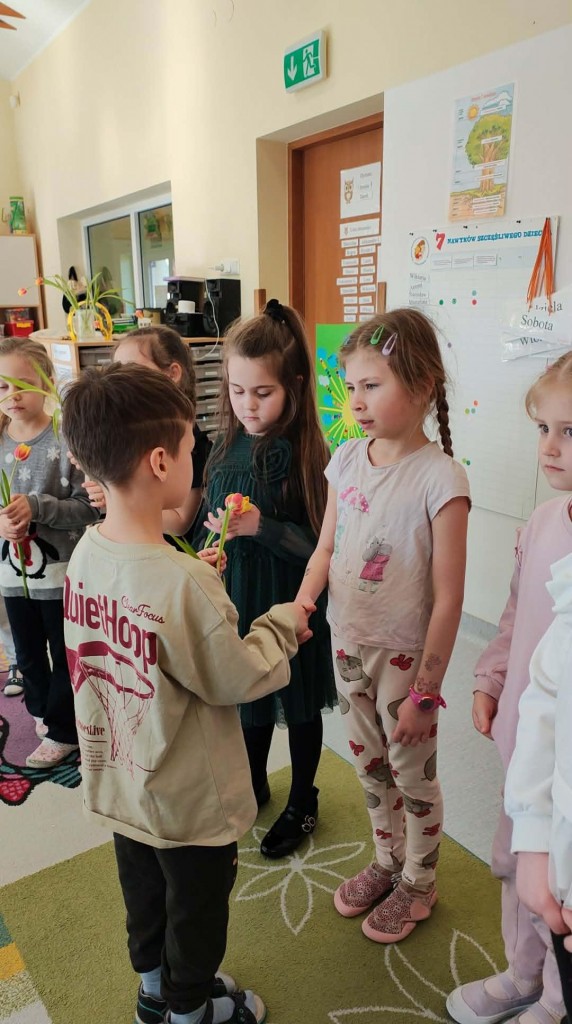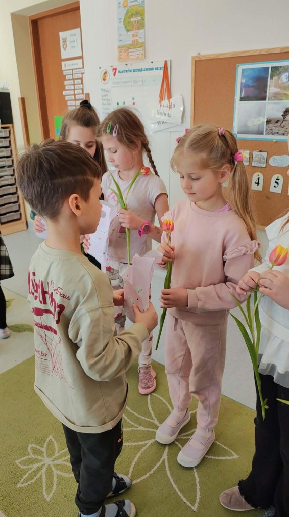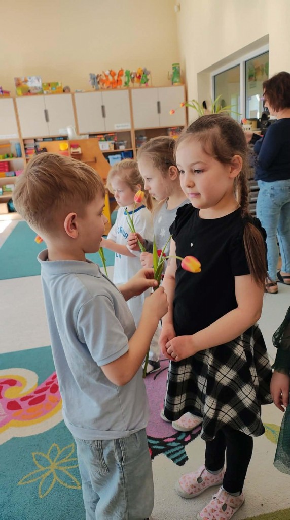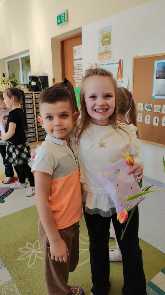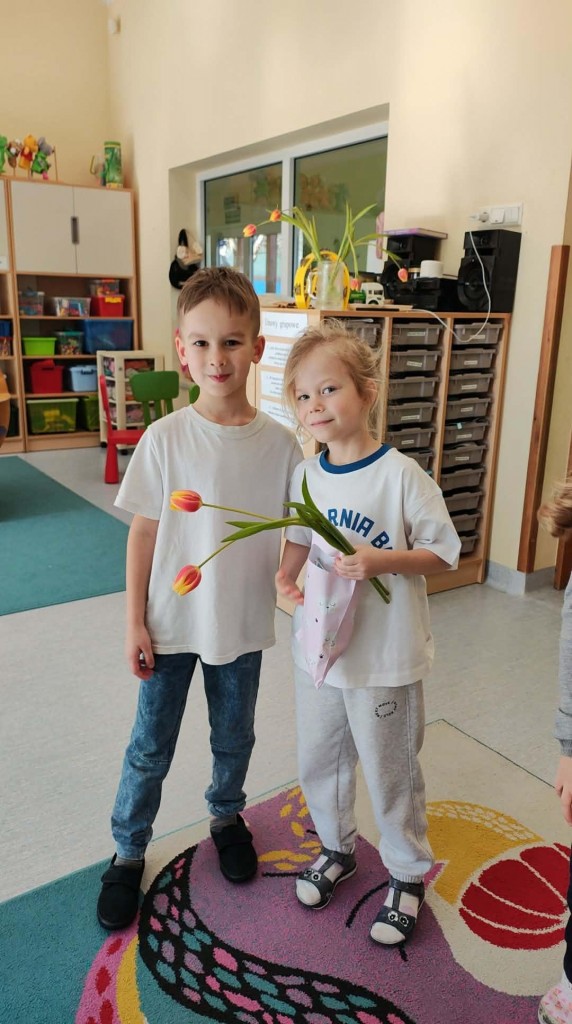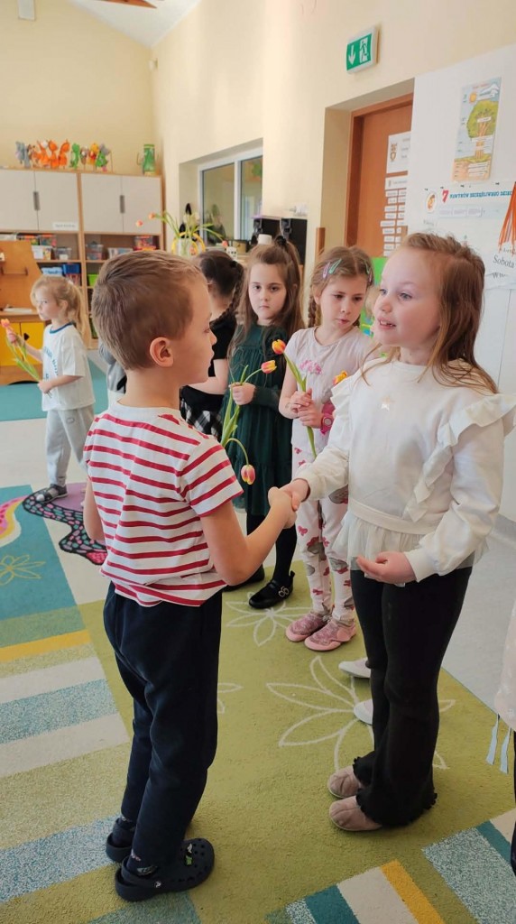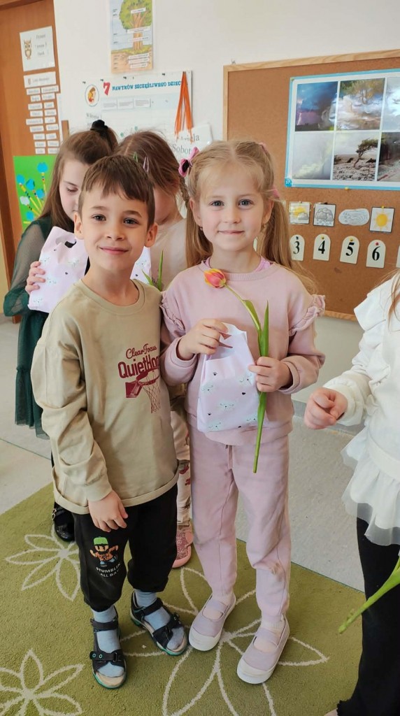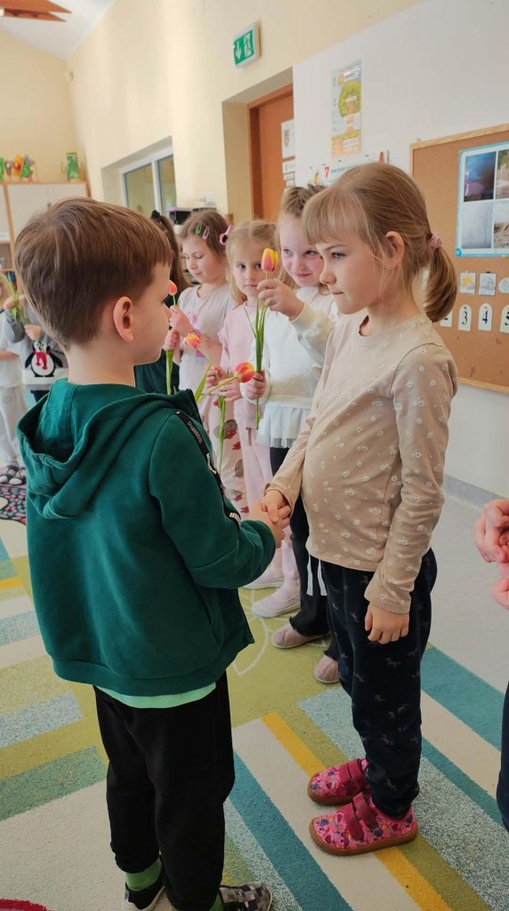 Dzień Kobiet w grupie sześciolatków upłynął w radosnej i serdecznej atmosferze. Chłopcy złożyli dziewczynkom piękne życzenia, a następnie wręczyli im drobne upominki, przygotowane specjalnie na tę okazję. Dzieci celebrowały święto wspólnie, ucząc się okazywania życzliwości, szacunku i wdzięczności. To był pełen uśmiechów, ciepłych gestów i miłych słów dzień, który na długo pozostanie w pamięci grupy.