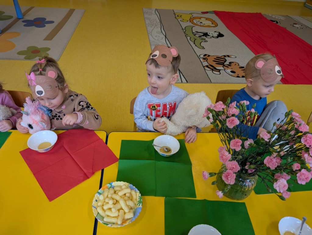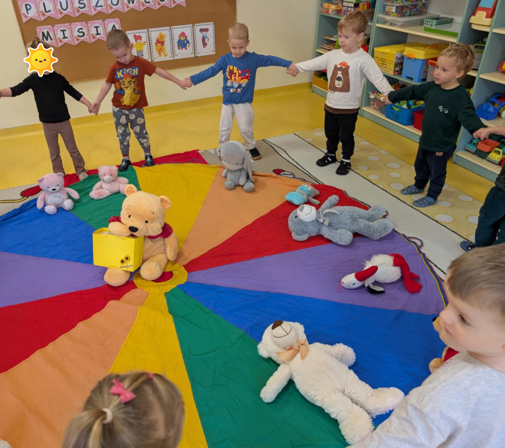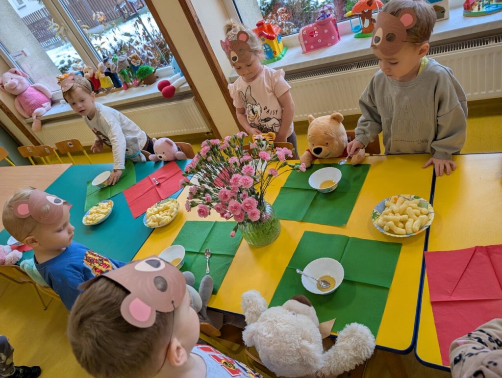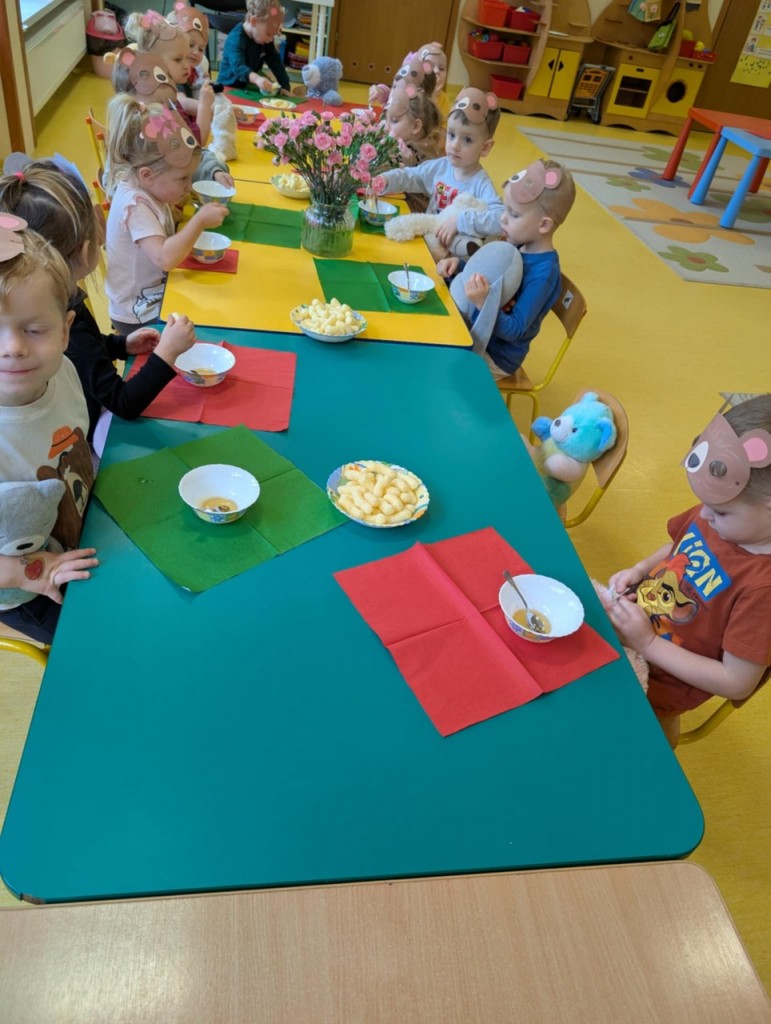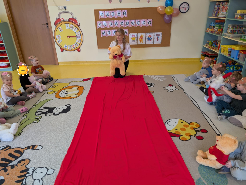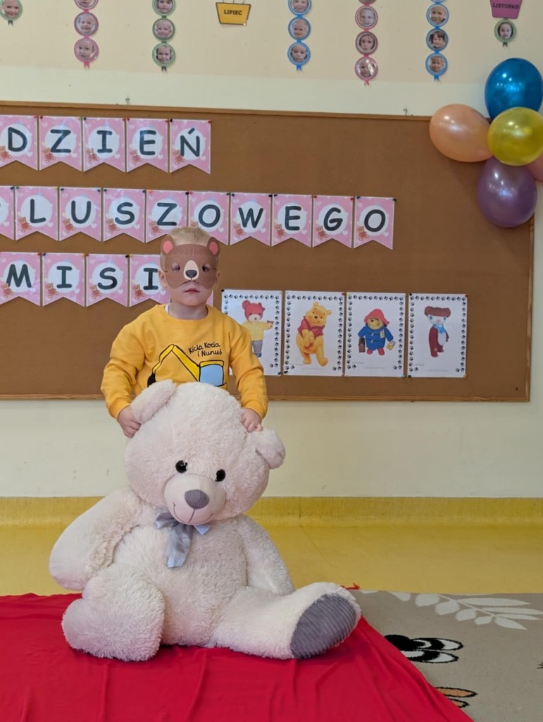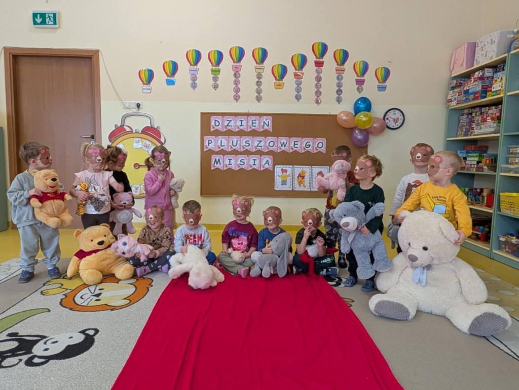 Dnia 25 listopada swoje święto obchodzi najmilsza zabawka, najlepszy przyjaciel dzieci i niezastąpiona przytulanka przy zasypianiu – Pluszowy Miś. W naszej grupie Święto Pluszowego Misia obchodziliśmy bardzo szczególnie. Tego dnia każdy przyniósł do przedszkola swojego pluszowego przyjaciela a naszą uroczystość zaczęliśmy od przywitania ulubionego misia – Kubusia Puchatka, który przybył do nas z niespodzianką. Był przemarsz i prezentacja misiów na czerwonym dywanie, zabawy ze śpiewem a na koniec degustacja misiowego przysmaku – miodu. Spotkanie z misiami było również inspiracją naszych działań plastycznych. To wielkie, misiowe przyjęcie zostanie w naszych wspomnieniach na długi czas.