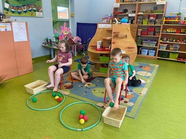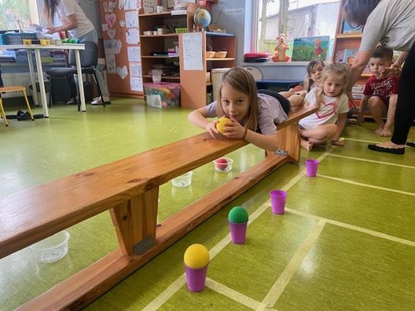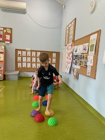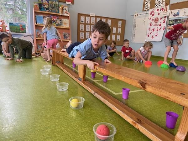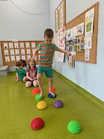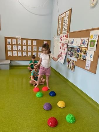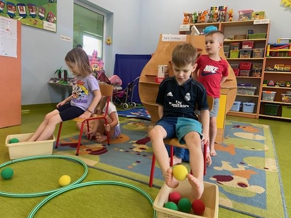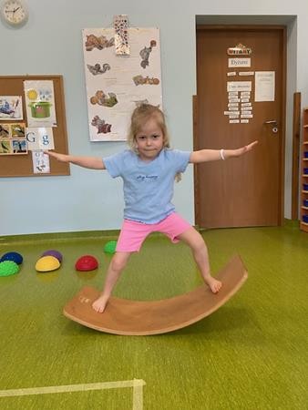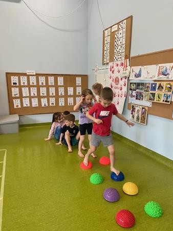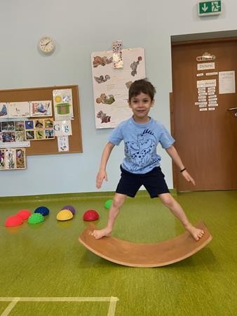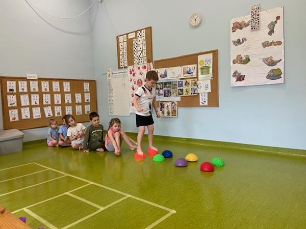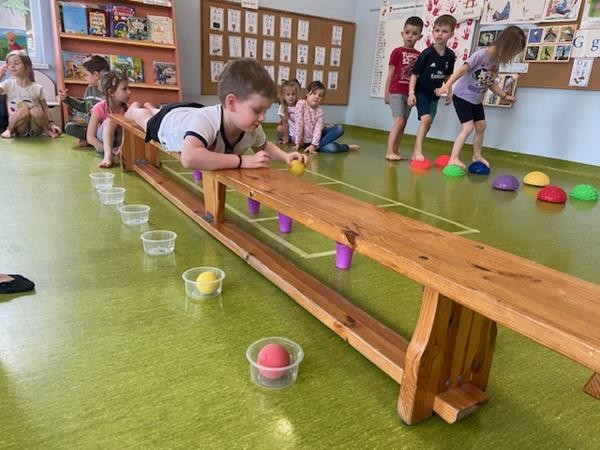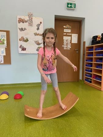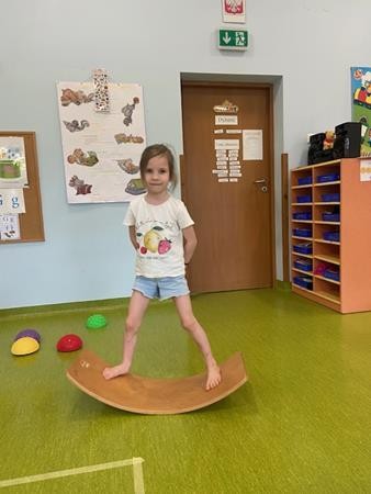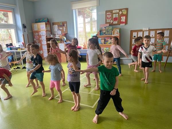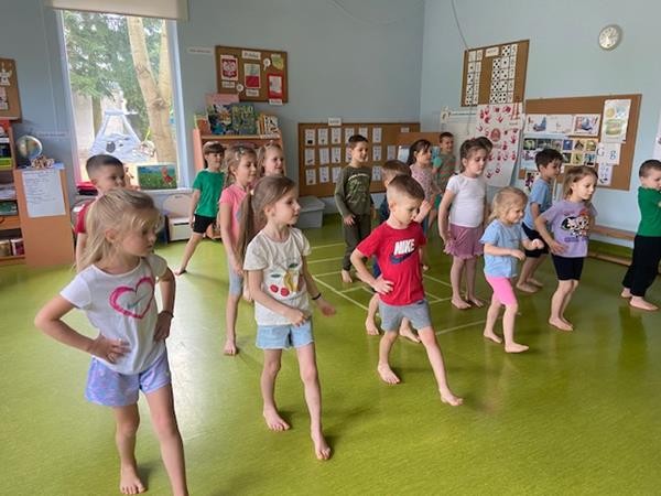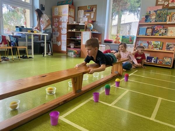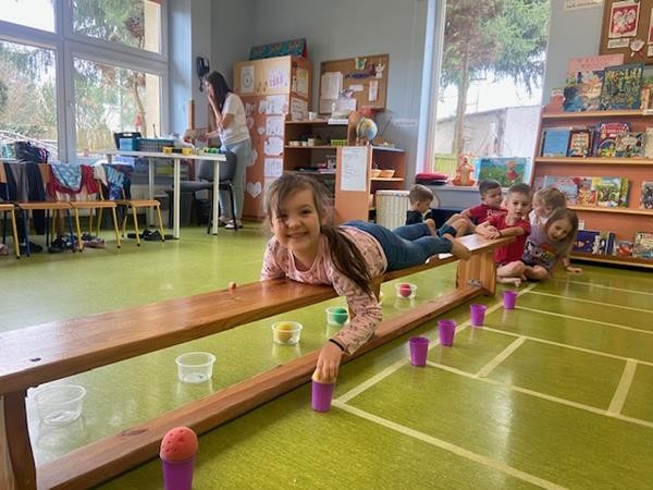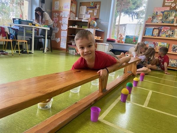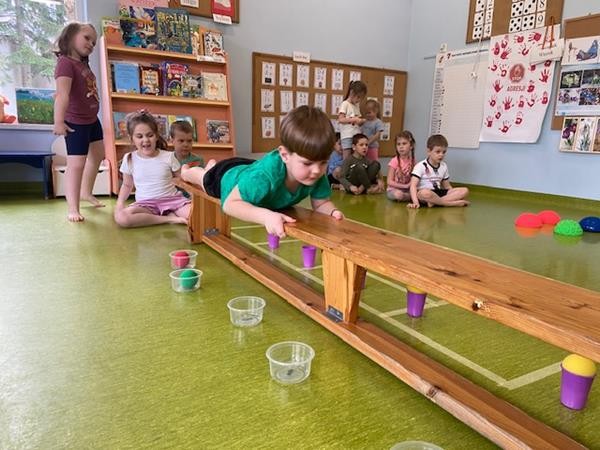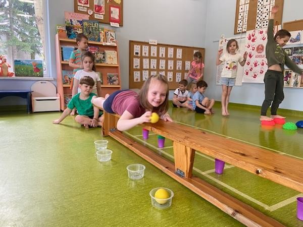 Gimnastyka to zabawa, to dla dzieci fajna sprawa i dla naszych 5 latków również. Zajęcia ruchowe z wykorzystaniem różnych przyborów gimnastycznych zachęcają dzieci do wspólnej zabawy, rozwijając ich sprawność fizyczną oraz kształtując prawidłową postawę.