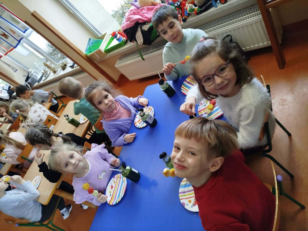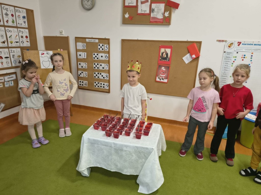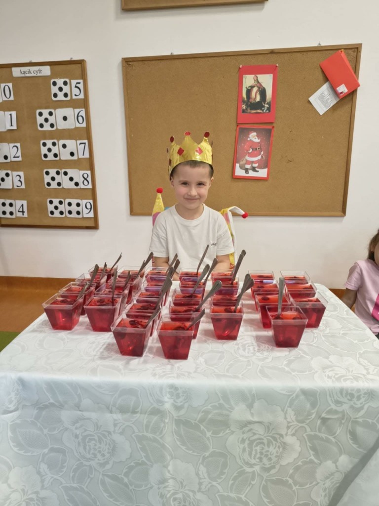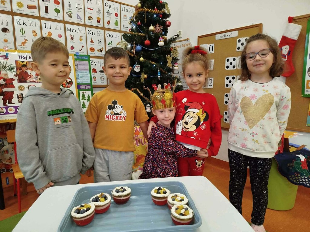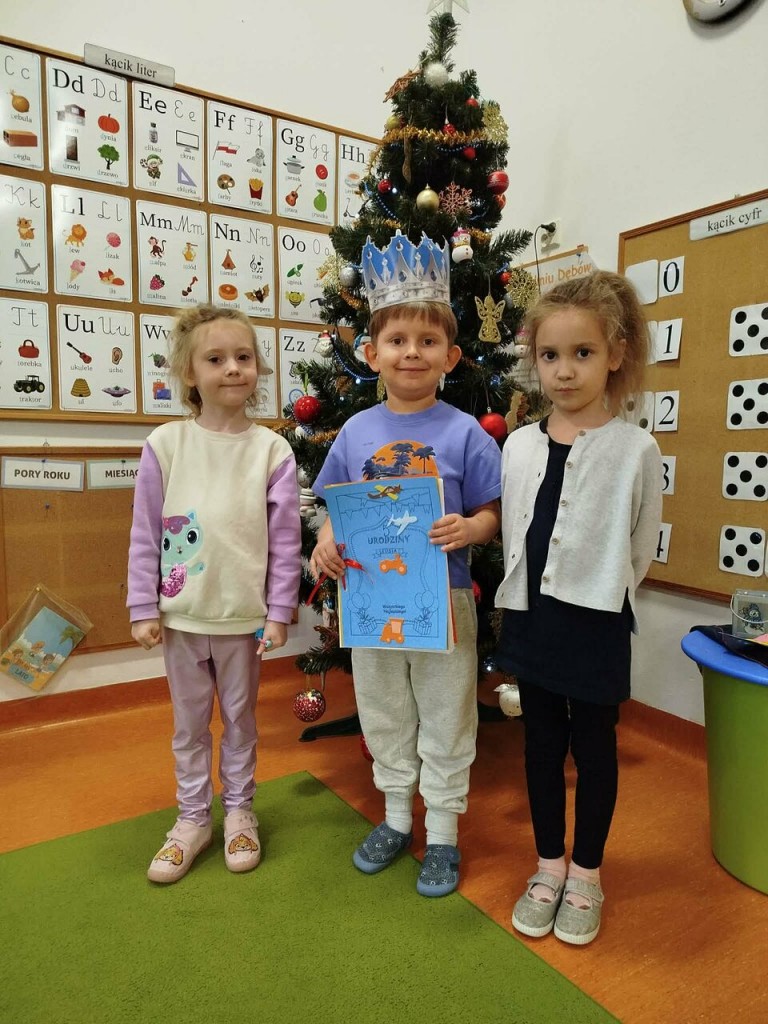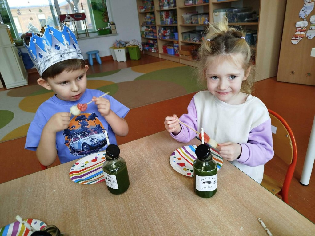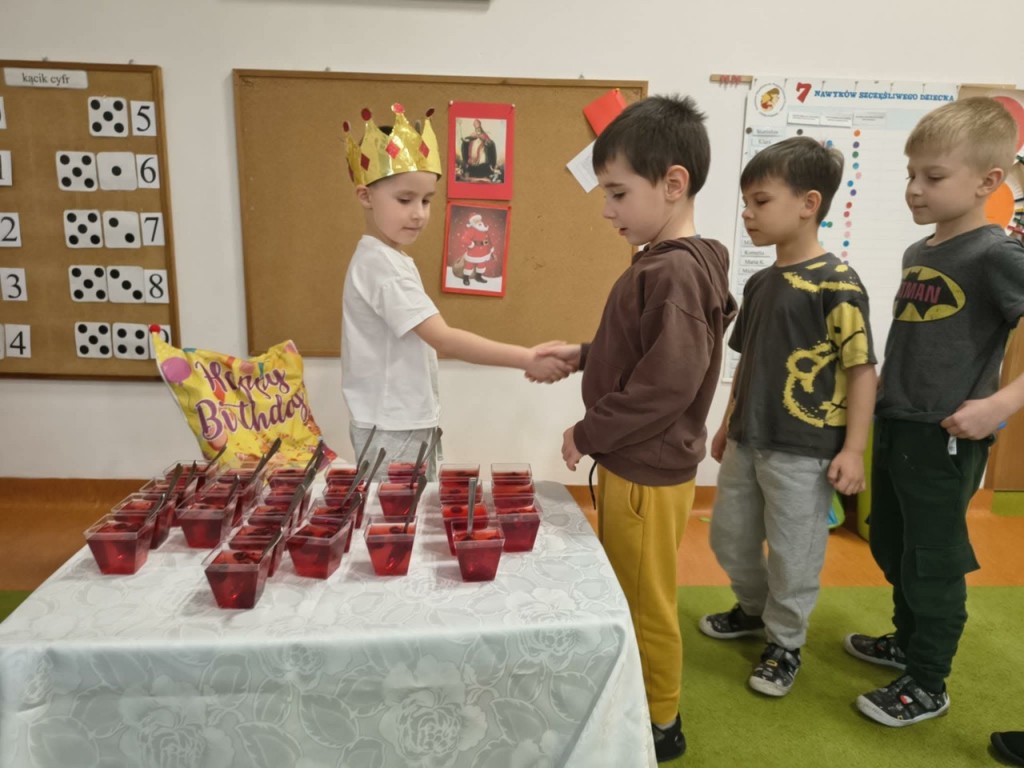 W naszej grupie w grudniu świętowaliśmy piąte urodziny Gai, Stasia i Leosia. Był to wyjątkowy czas pełen radości oraz wspólnej zabawy. Zamiast tradycyjnych słodyczy pojawiły się zdrowe przekąski przygotowane z myślą o właściwym odżywianiu. Nie zabrakło także urodzinowych życzeń, śpiewania „Sto lat” oraz starannie wykonanych pamiątkowych albumów.