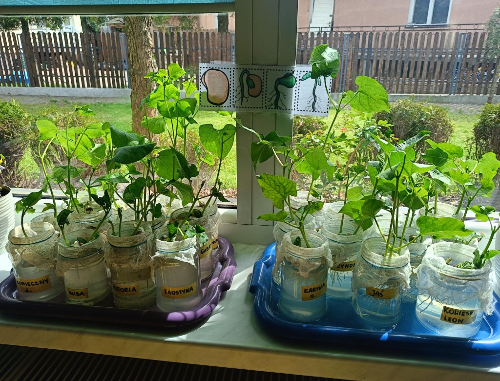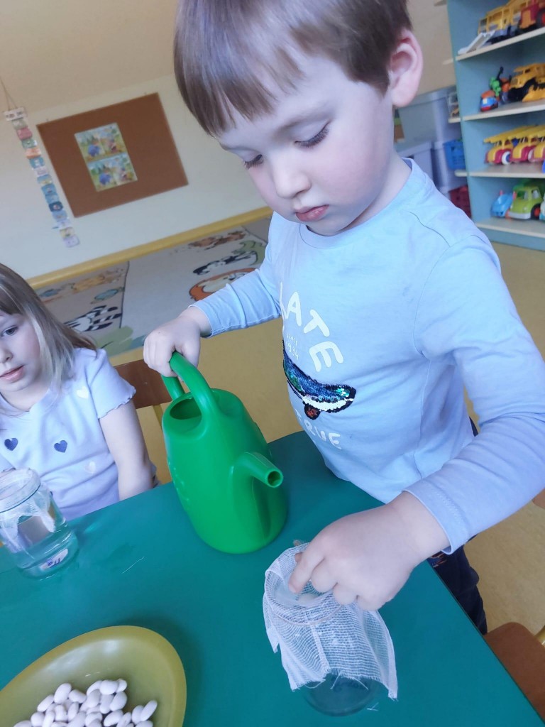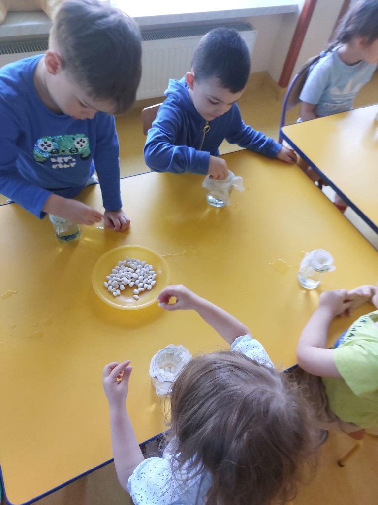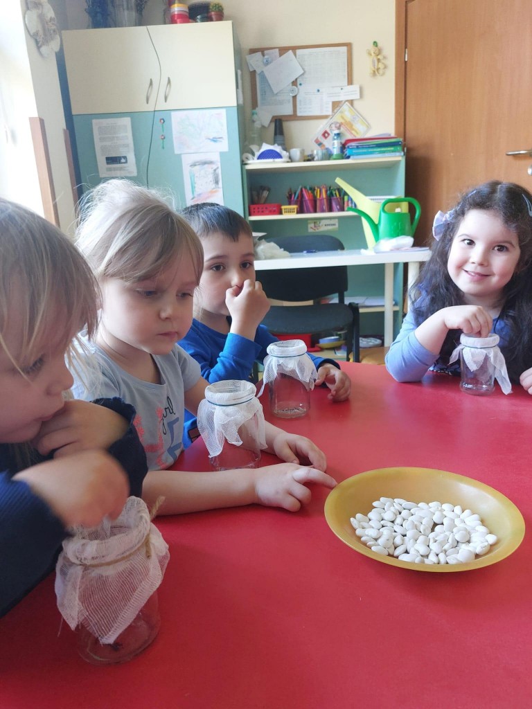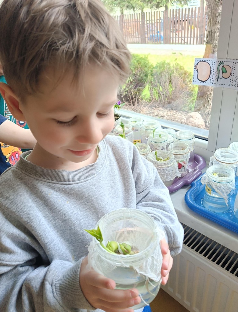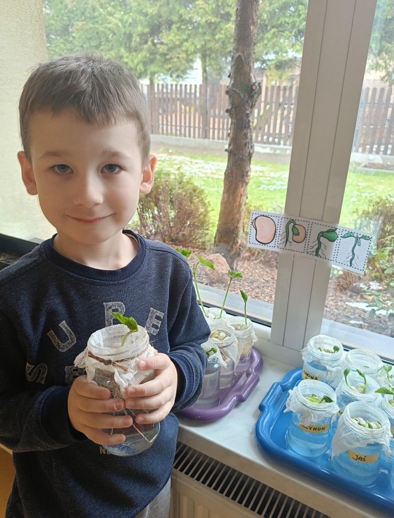 Przedszkolaki wykonały prawdziwie wiosenne zadanie - założyliśmy hodowlę fasoli! Najpierw przygotowaliśmy dla fasolek odpowiednie miejsce - na słoiczki przyniesione przez dzieci nałożyliśmy gazę, przymocowaliśmy ją gumkami, nalaliśmy wody i gotowe! Pozostało umieścić na gazie fasolki i ... czekać :) Przy okazji dowiedzieliśmy się czego potrzebują rośliny aby mogły rosnąć. Dzieci z uwagą obserwowały rozwój swoich fasolek, oraz sumiennie pilnowały aby nie brakowało im wody.