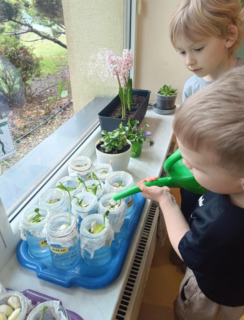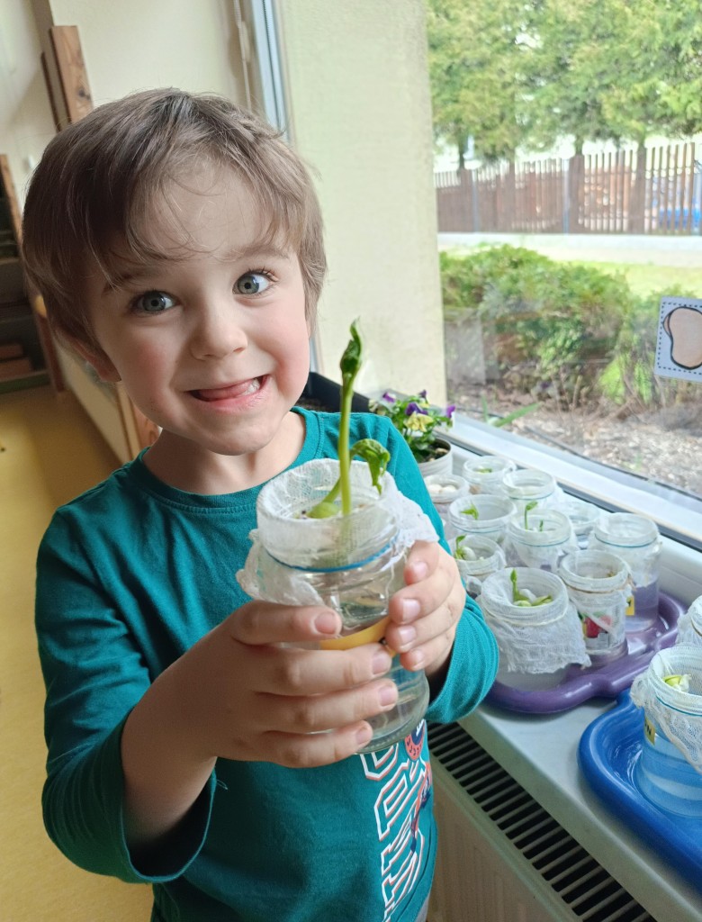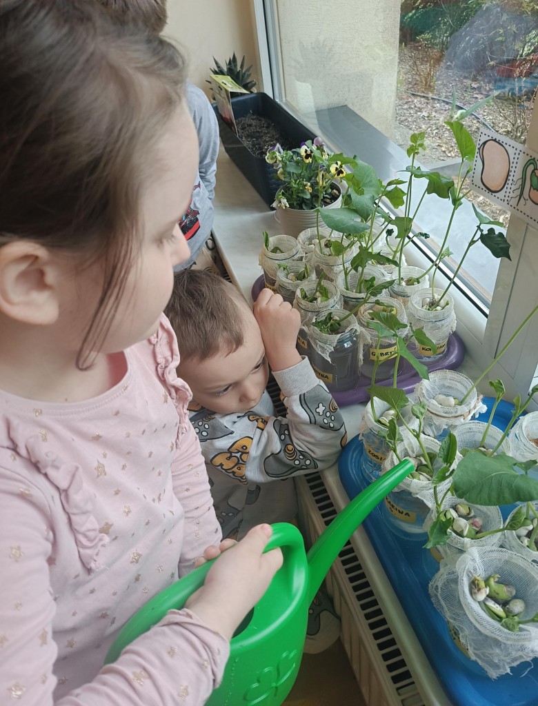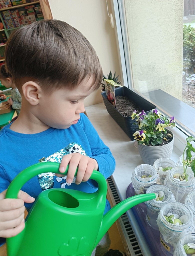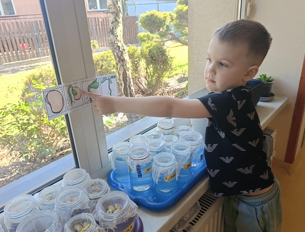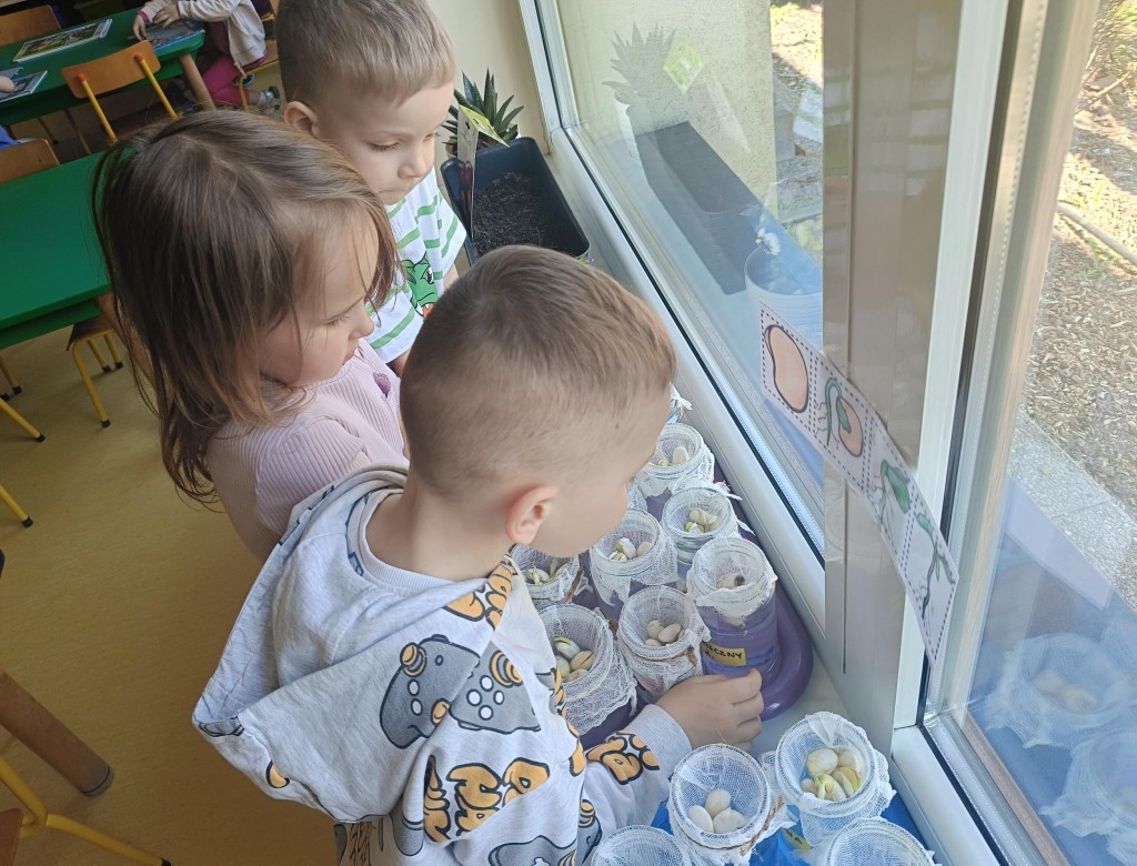 Przedszkolaki wykonały prawdziwie wiosenne zadanie - założyliśmy hodowlę fasoli! Najpierw przygotowaliśmy dla fasolek odpowiednie miejsce - na słoiczki przyniesione przez dzieci nałożyliśmy gazę, przymocowaliśmy ją gumkami, nalaliśmy wody i gotowe! Pozostało umieścić na gazie fasolki i ... czekać :) Przy okazji dowiedzieliśmy się czego potrzebują rośliny aby mogły rosnąć. Dzieci z uwagą obserwowały rozwój swoich fasolek, oraz sumiennie pilnowały aby nie brakowało im wody.
