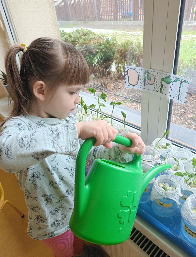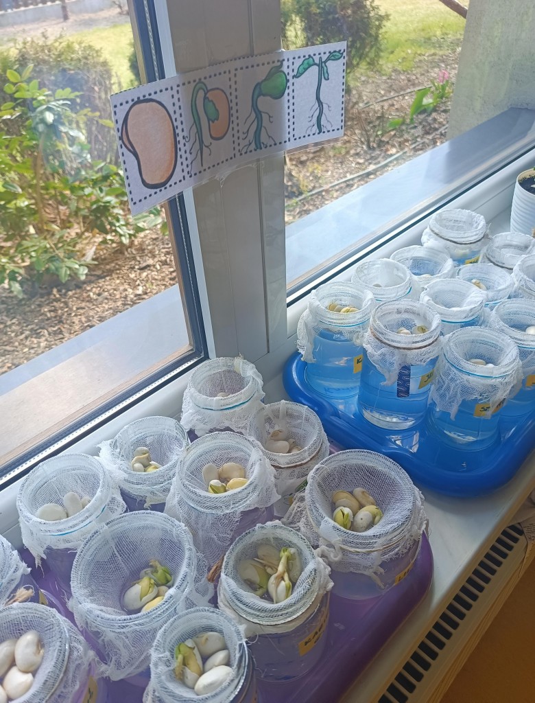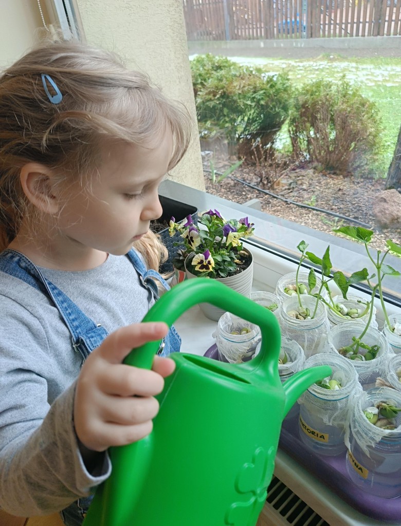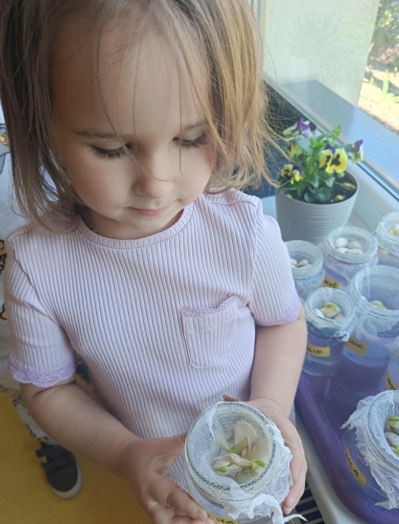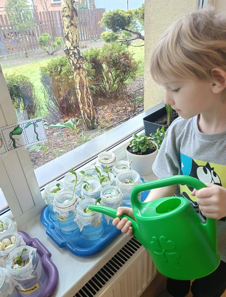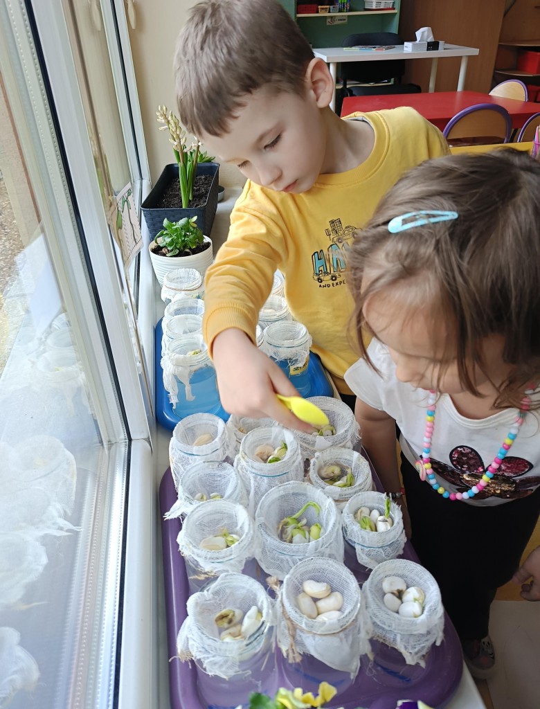 Przedszkolaki wykonały prawdziwie wiosenne zadanie - założyliśmy hodowlę fasoli! Najpierw przygotowaliśmy dla fasolek odpowiednie miejsce - na słoiczki przyniesione przez dzieci nałożyliśmy gazę, przymocowaliśmy ją gumkami, nalaliśmy wody i gotowe! Pozostało umieścić na gazie fasolki i ... czekać :) Przy okazji dowiedzieliśmy się czego potrzebują rośliny aby mogły rosnąć. Dzieci z uwagą obserwowały rozwój swoich fasolek, oraz sumiennie pilnowały aby nie brakowało im wody.