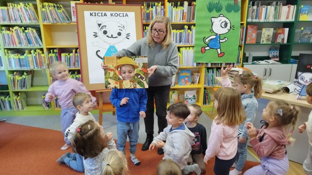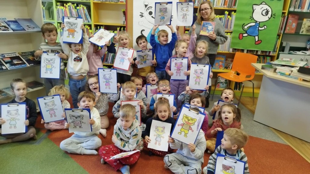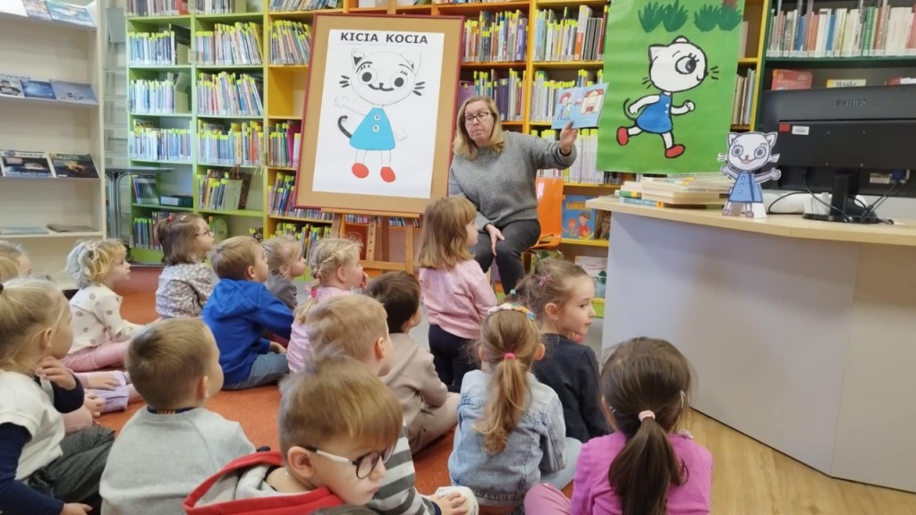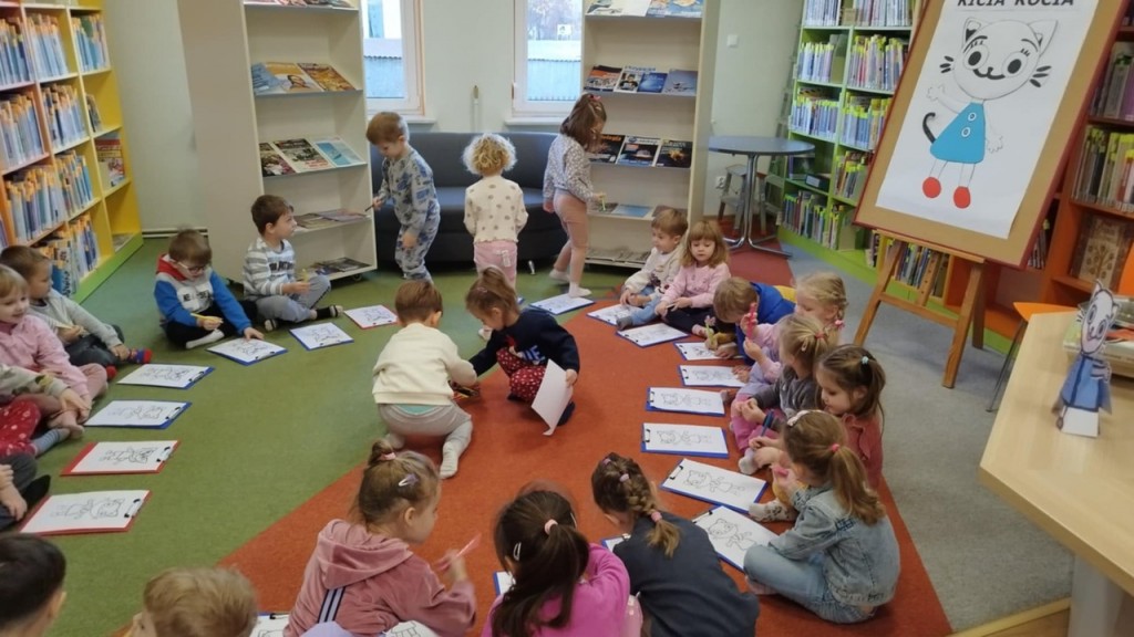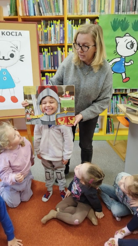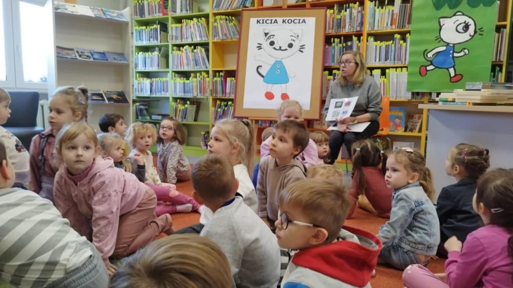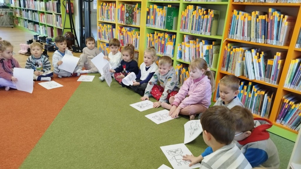 Dnia 26 listopada wybraliśmy się na zajęcia biblioteczne do Biblioteki Pedagogicznej. Byliśmy bardzo ciekawi jak to miejsce wygląda i co będziemy tam robić. Już przy wejściu przywitała nas Pani bibliotekarka i zaprosiła do czytelni gdzie przeczytała nam książkę z jedną z naszych ulubionych bohaterek- Kicia Kocia. Tym razem bohaterka tak jak my udała się pierwszy raz do biblioteki. Następnie kolorowaliśmy kolorowanki z naszymi ulubionymi bohaterami bajek i oglądaliśmy wybrane książki. Teraz już wiemy jak się należy zachowywać w bibliotece i w jaki sposób korzystać z jej zbiorów: książek, czasopism, nagrań bajek a także i gier planszowych. Dziękujemy, na pewno jeszcze nie raz się tam wybierzemy.