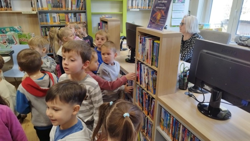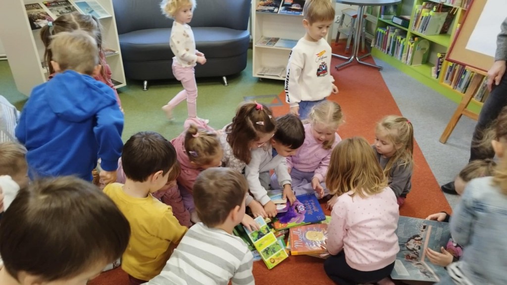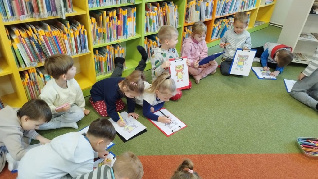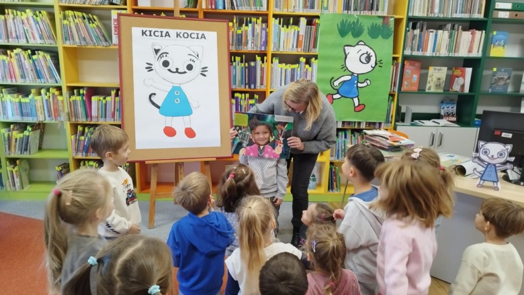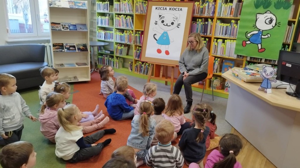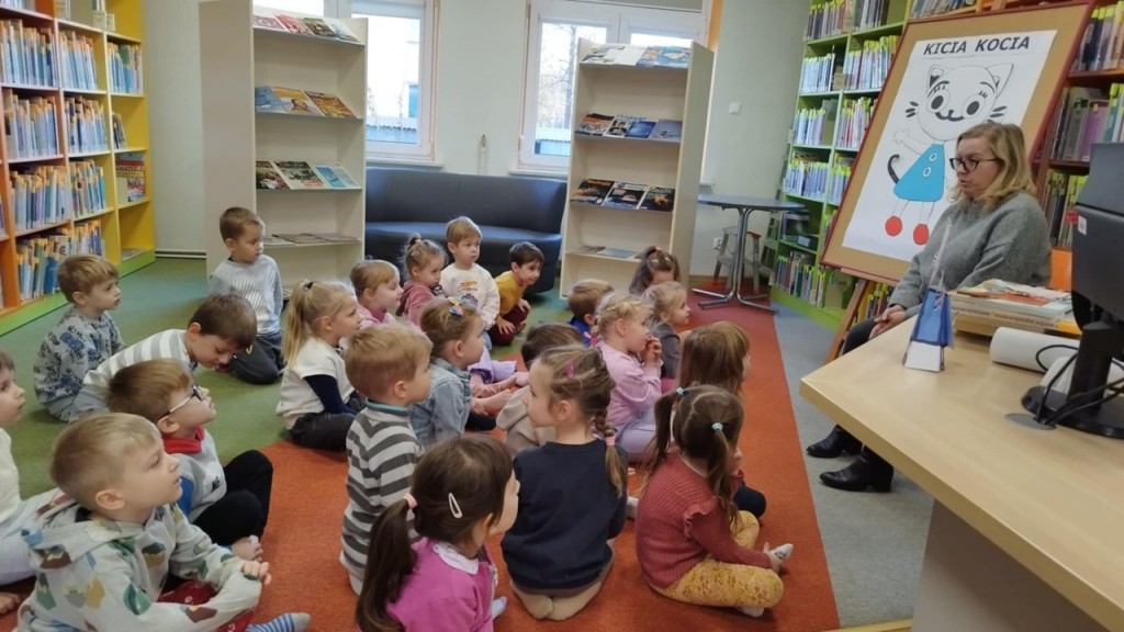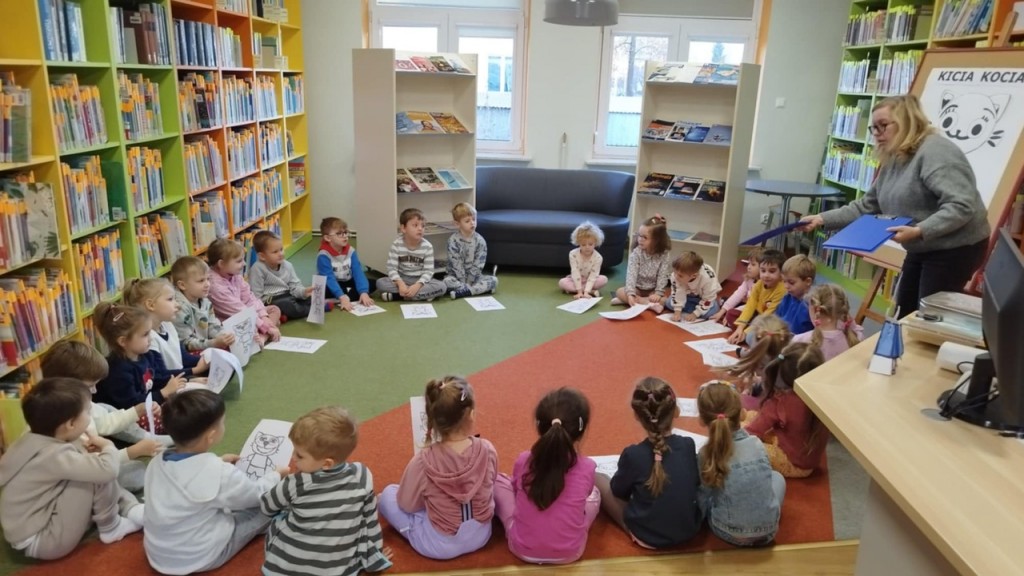 Dnia 26 listopada wybraliśmy się na zajęcia biblioteczne do Biblioteki Pedagogicznej. Byliśmy bardzo ciekawi jak to miejsce wygląda i co będziemy tam robić. Już przy wejściu przywitała nas Pani bibliotekarka i zaprosiła do czytelni gdzie przeczytała nam książkę z jedną z naszych ulubionych bohaterek- Kicia Kocia. Tym razem bohaterka tak jak my udała się pierwszy raz do biblioteki. Następnie kolorowaliśmy kolorowanki z naszymi ulubionymi bohaterami bajek i oglądaliśmy wybrane książki. Teraz już wiemy jak się należy zachowywać w bibliotece i w jaki sposób korzystać z jej zbiorów: książek, czasopism, nagrań bajek a także i gier planszowych. Dziękujemy, na pewno jeszcze nie raz się tam wybierzemy.