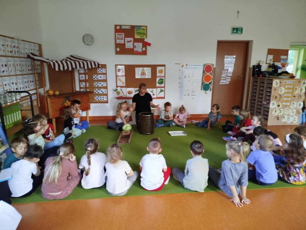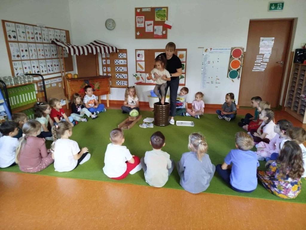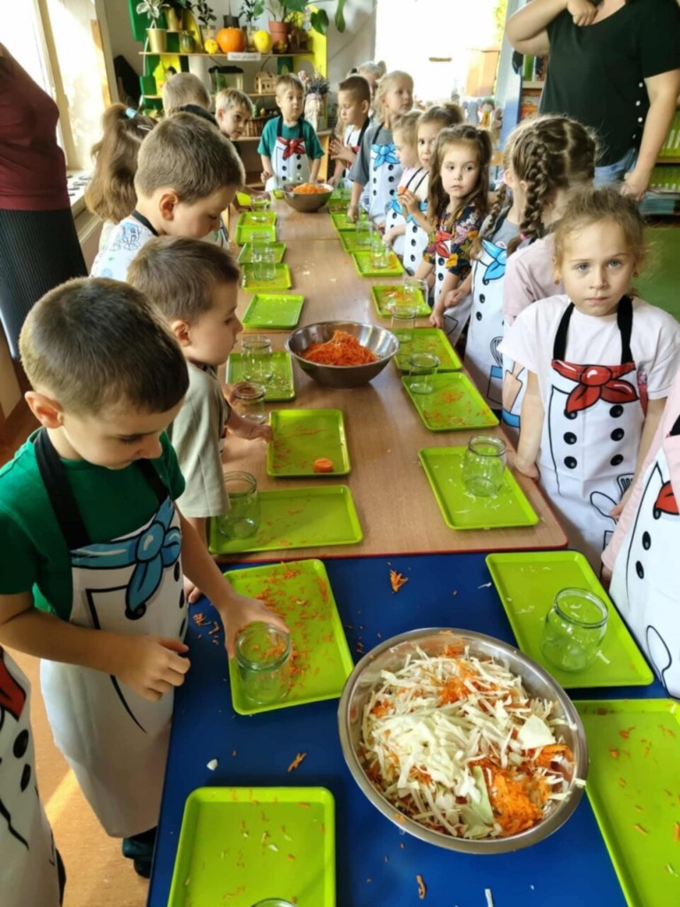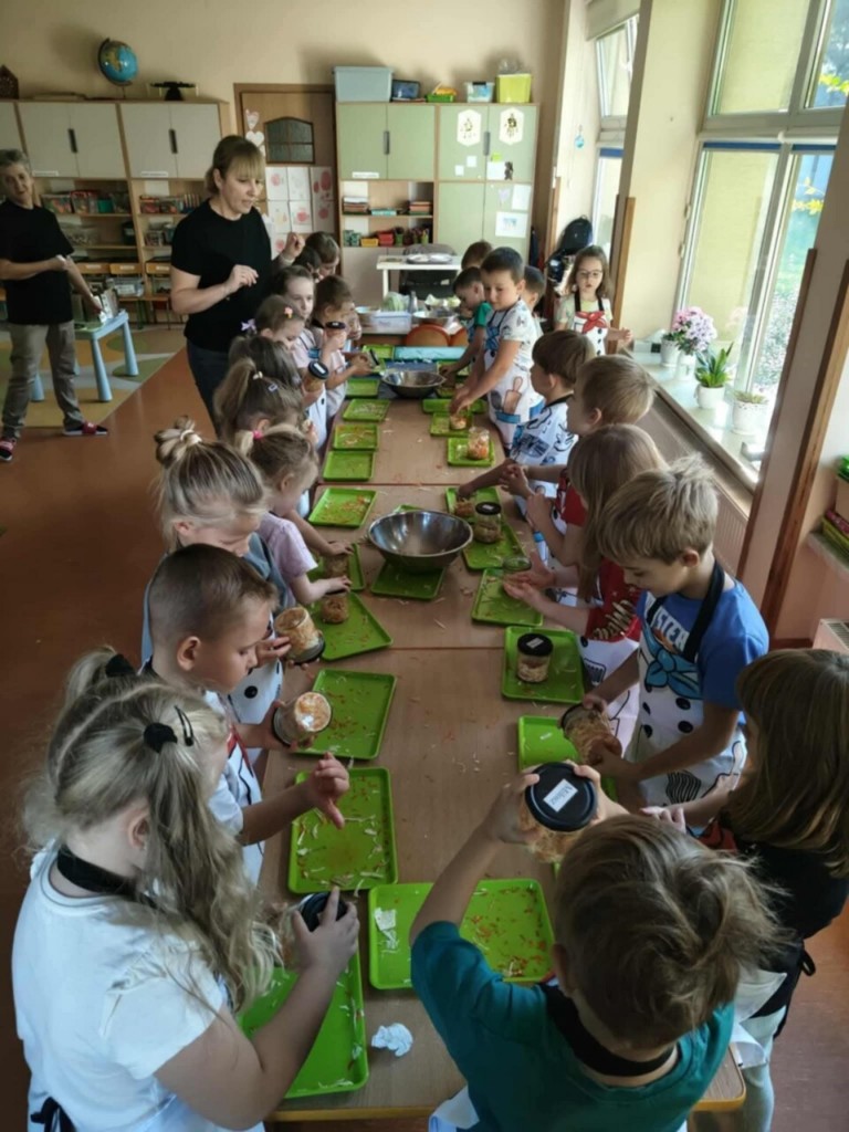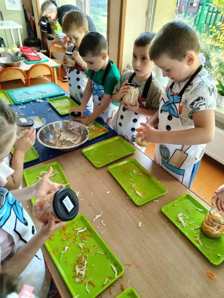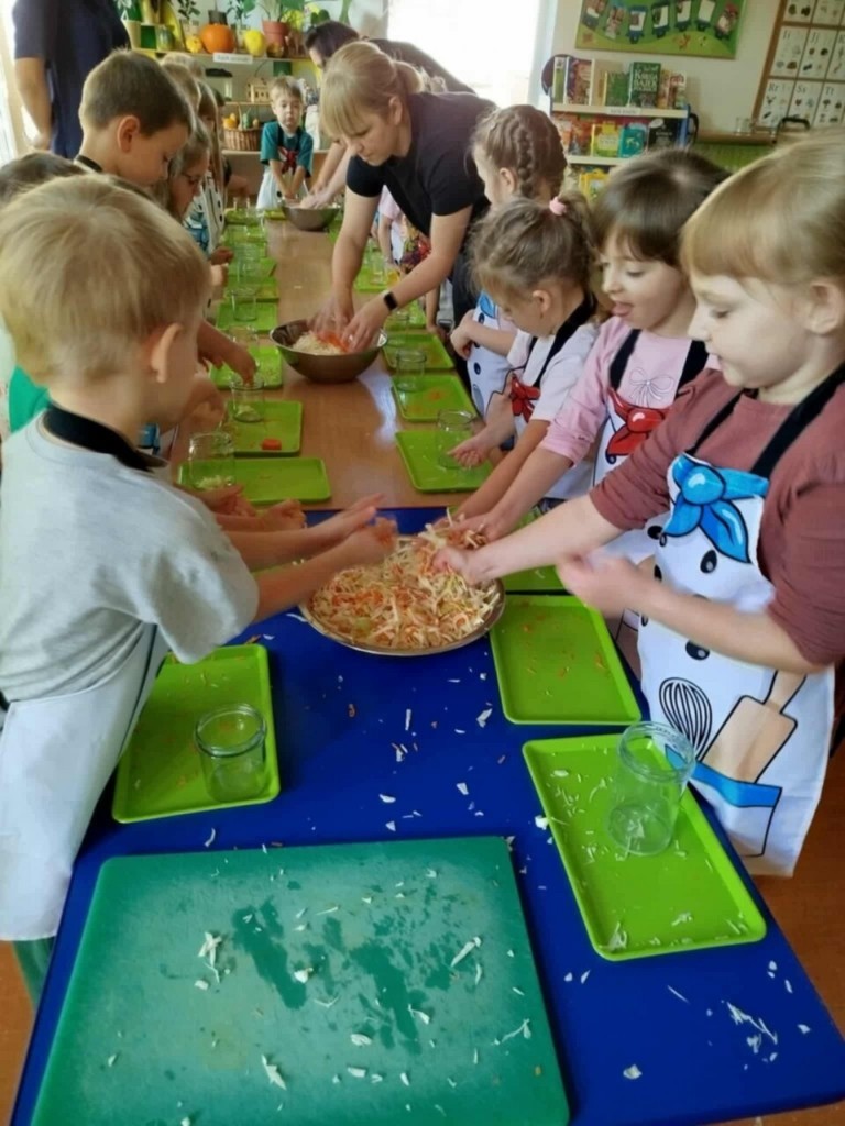 Zima tuż więc czas najwyższy zacząć robić zapasy. Zaczniemy od kiszenia kapusty. Na początku próbowaliśmy ją, ocenialiśmy smak, wygląd, ciężar, kolor. Poznaliśmy dawne zwyczaje związane z kiszeniem kapusty a następnie szczegółowy przepis. Wtedy właśnie przystąpiliśmy do pracy. My już wiemy, co trzeba zrobić, aby kapustka się ukisiła. To była wspaniała praca, a raczej zabawa. Każdy mógł spróbować kroić kapustę, tarkować marchewkę, a przede wszystkim ugniatać i wkładać do słoików. Teraz stoi sobie w kąciku i wszyscy czekamy aby ją schrupać "na kwaśno" bo wiemy że jest bardzo zdrowa.