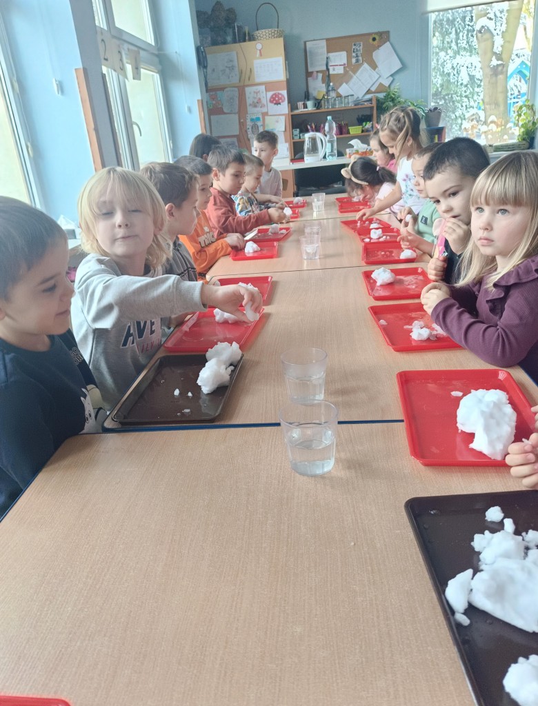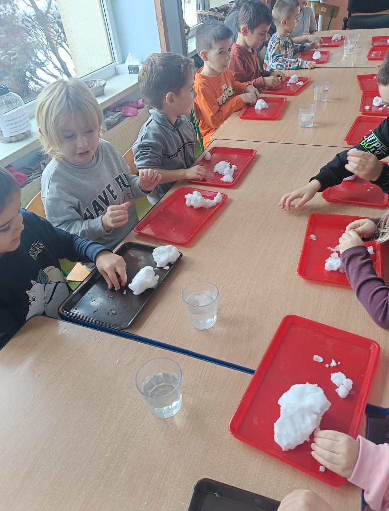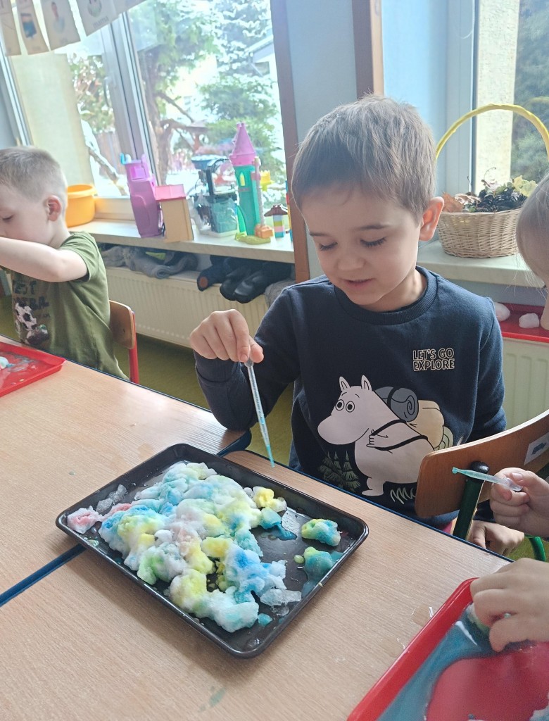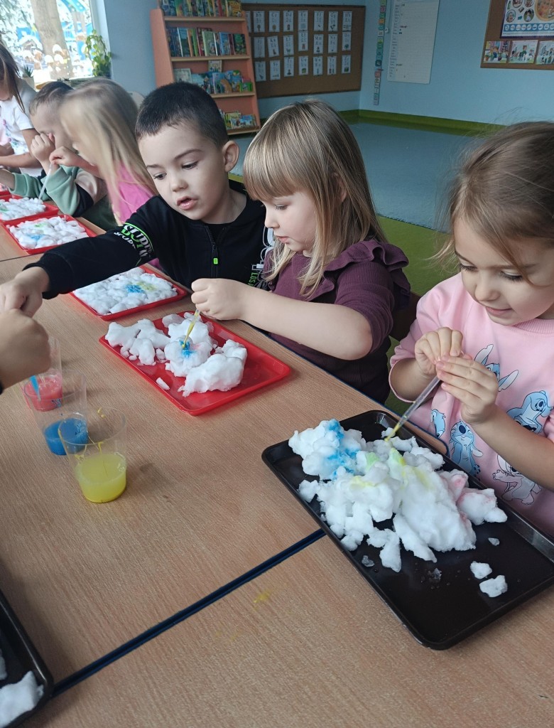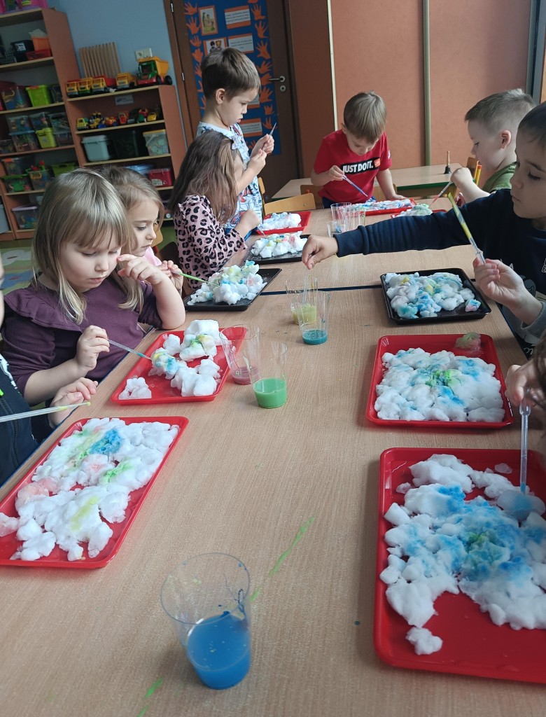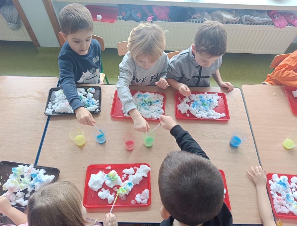 Choć w kalendarzu jeszcze jesień, to pogoda ostatnim czasem nas rozpieściła i spadł pierwszy śnieg. Ile było radości...my już mamy za sobą pierwsze zabawy ze śniegiem. Postanowiliśmy przynieść śnieg do naszej sali i go...pomalować. Wystarczyły kolorowe farby rozmieszane z odrobiną wody i pipety,żeby rozbudzić dziecięcą ciekawość. Przenikanie farby przez struktury śniegu, wzajemne oddziaływania wody i śniegu… to tylko niektóre zjawiska, które dzieci mogły obserwować podczas swojej pracy artystycznej.