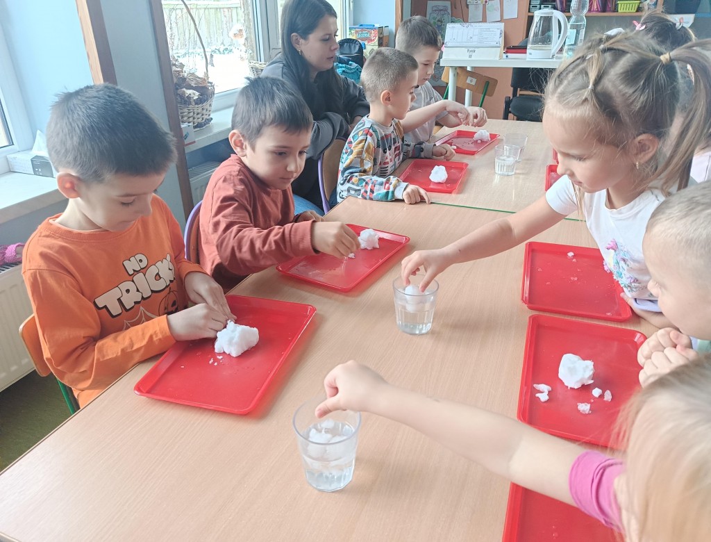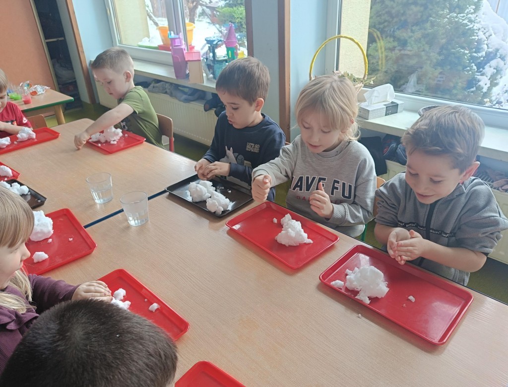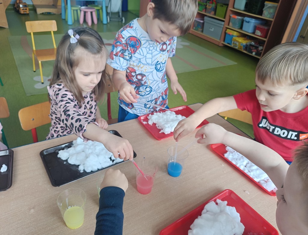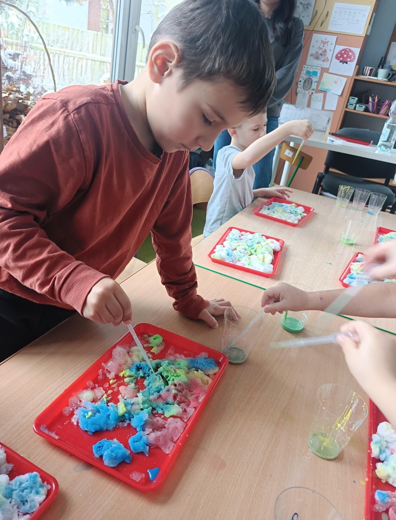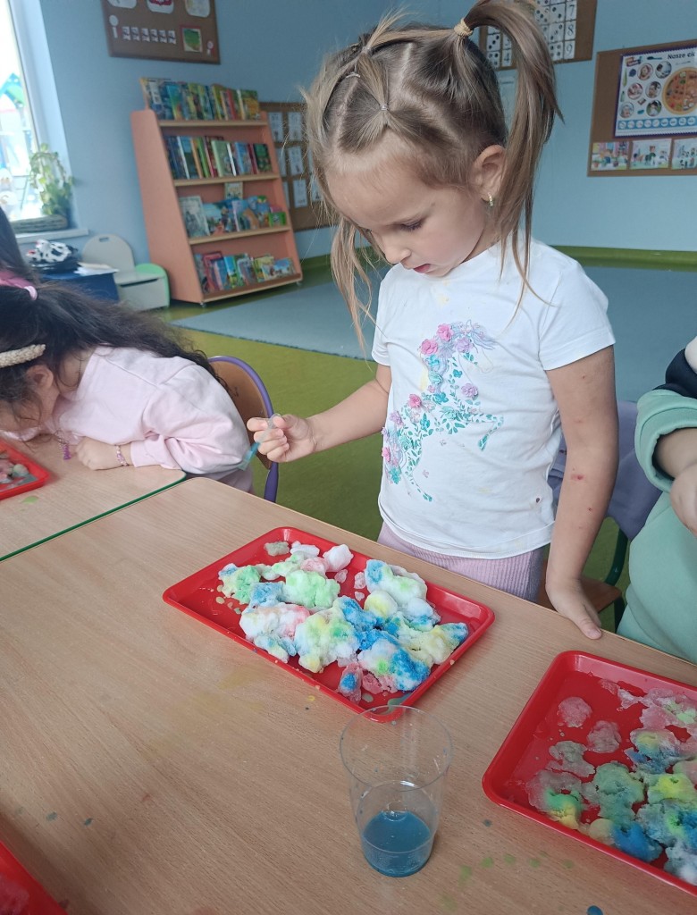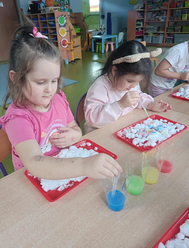 Choć w kalendarzu jeszcze jesień, to pogoda ostatnim czasem nas rozpieściła i spadł pierwszy śnieg. Ile było radości...my już mamy za sobą pierwsze zabawy ze śniegiem. Postanowiliśmy przynieść śnieg do naszej sali i go...pomalować. Wystarczyły kolorowe farby rozmieszane z odrobiną wody i pipety,żeby rozbudzić dziecięcą ciekawość. Przenikanie farby przez struktury śniegu, wzajemne oddziaływania wody i śniegu… to tylko niektóre zjawiska, które dzieci mogły obserwować podczas swojej pracy artystycznej.