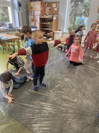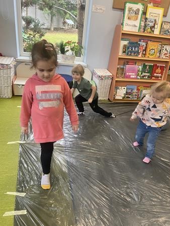 Gdy zimowa pogoda płata nam figle, zawsze można znaleźć pomysł na dobrą zabawę... w lodowisko! Tak było w naszej grupie, gdy naśladowaliśmy jazdę na łyżwach po folii malarskiej. To była świetna zabawa stymulująca wiele zmysłów.