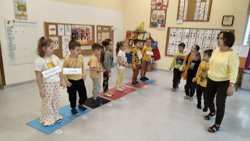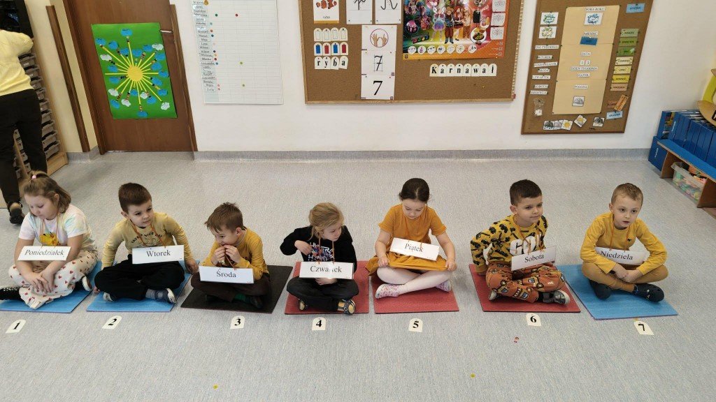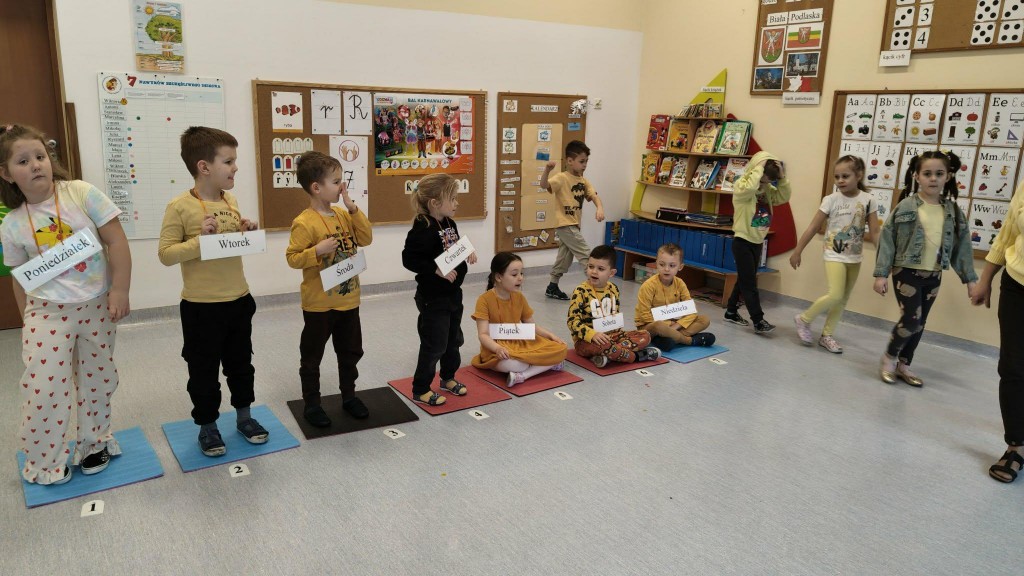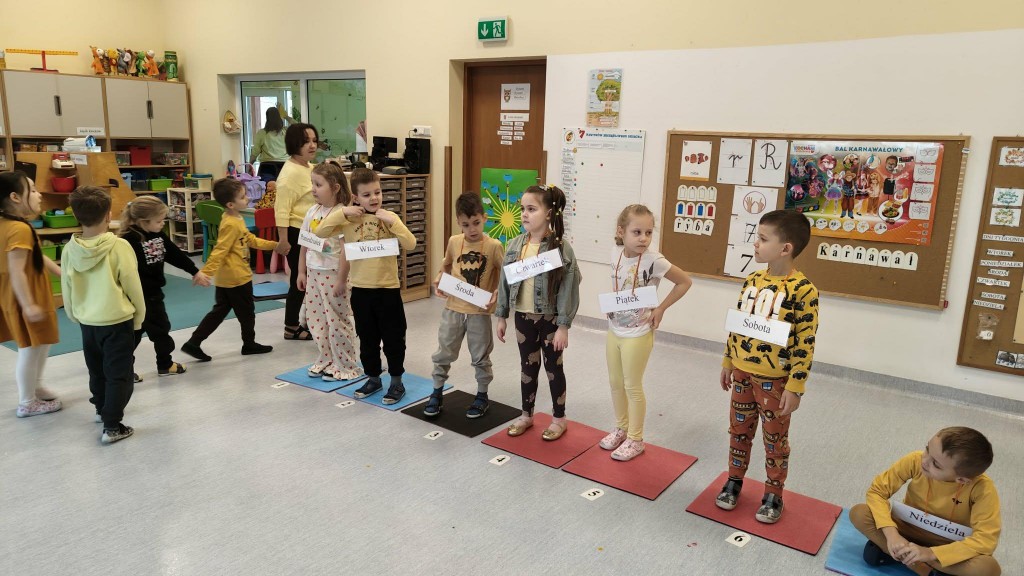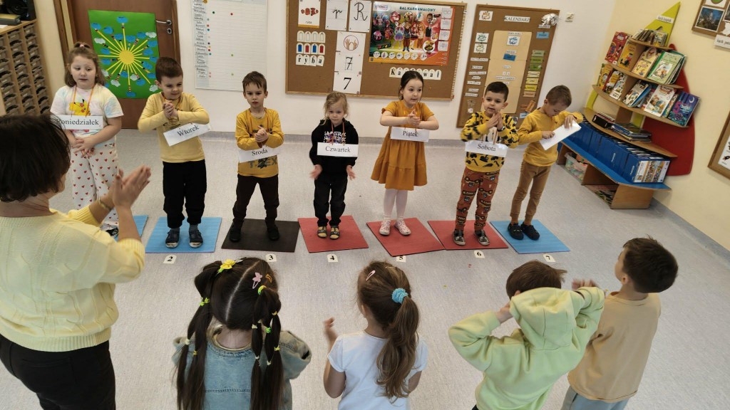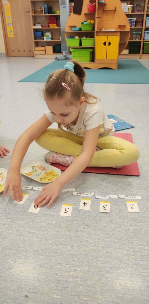 W ostatnim czasie nasze 6latki często utrwalają znajomość dni tygodnia oraz ćwiczymą liczenie i rozpoznawanie cyfr. Z duzym zaangazowaniem dzieci uczestniczyły w zabawach ruchowych, rytmicznych i matematycznych, pokazując jak wiele juz potrafią. Każdy dzień przynosi nam nowe małe sukcesy i wielką radość ze wspólnego odkrywania świata liczb i kalendarza.