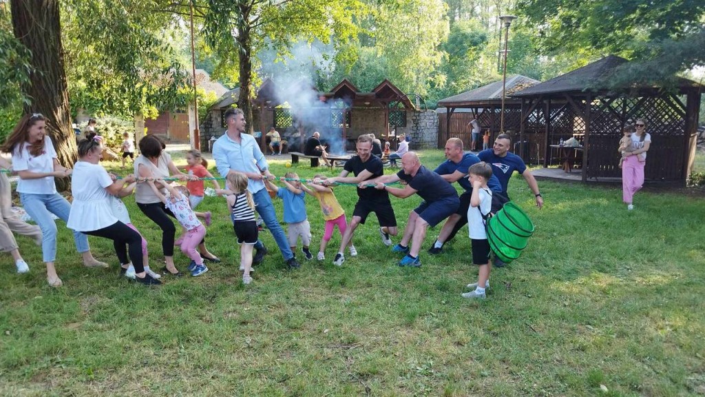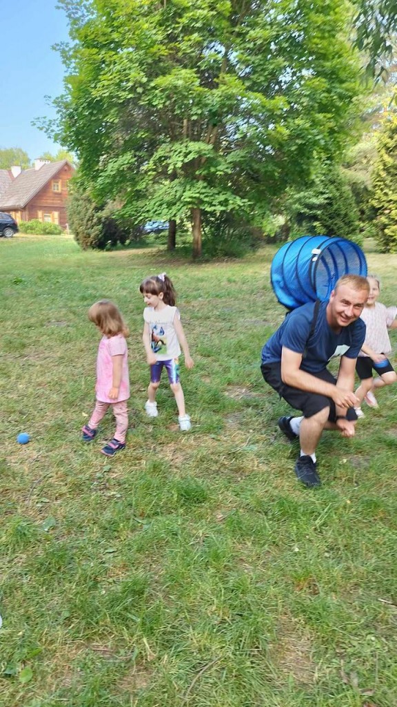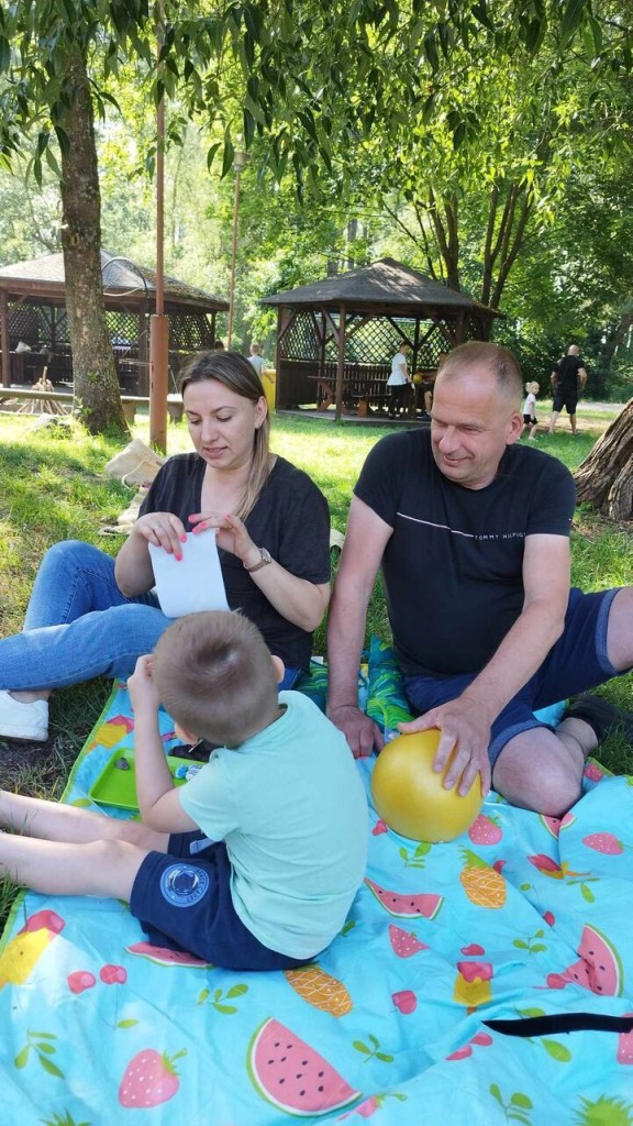Dnia 3 czerwca świętowaliśmy Dzień Rodziny podczas wspólnego pikniku w Roskoszy. To pierwszy nasz wyjazd i byliśmy bardzo podekscytowani i pełni radości, że możemy ten czas spędzić z naszymi najbliższymi. Dla mamy i taty przygotowaliśmy wiele niespodzianek. Na początku powitaliśmy ich piosenką i zaprosiliśmy do obejrzenia naszego występu. „Kiedy byłam jak kropelka” to pierwsza piosenka skierowana do naszych kochanych mam w podziękowaniu za ich miłość opiekę i troskę następnie zaśpiewaliśmy „Tata jest potrzebny” i wszyscy wiedzą do czego potrzebny jest tata....aby przybić gwóźdź i na spacer pójść. Na zakończenie wręczyliśmy upominki przez nas wykonane: dla mamy- lustereczko, aby zawsze pamiętała, że jest wyjątkowa i piękna, a dla taty breloczek do kluczyków, aby wracał do domu bezpiecznie. To nie koniec wrażeń, czekało jeszcze na nas zadanie z zakresu edukacji matematycznej – w oparciu o Dziecięcą matematykę E. Gruszczyk- Kolczyńska i E. Zielińska. Wspólnie z rodzicami odnajdywaliśmy przedmioty- kamyki a następnie liczyliśmy, nasi rodzice dbali, abyśmy robili to prawidłowo według zawartych wskazówek. W nagrodę za dobrze wykonane zadanie były cukierki, które oczywiście też musieliśmy policzyć przed zjedzeniem. A potem wspólne zabawy: w tunel, przeciąganie liny czy przy muzyce sprawiły, że bardzo miło spędziliśmy ten czas. Oczywiście, nie zabrakło też kiełbasek i innych przekąsek przyniesionych prze naszych rodziców.