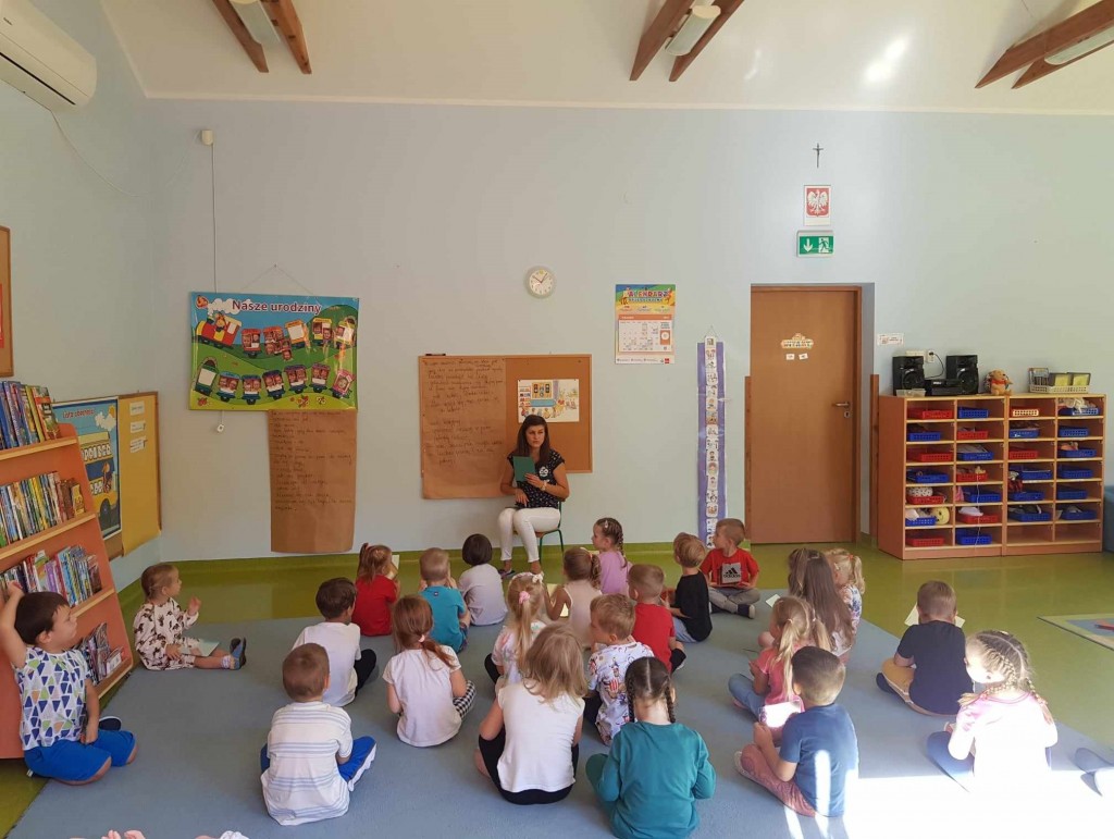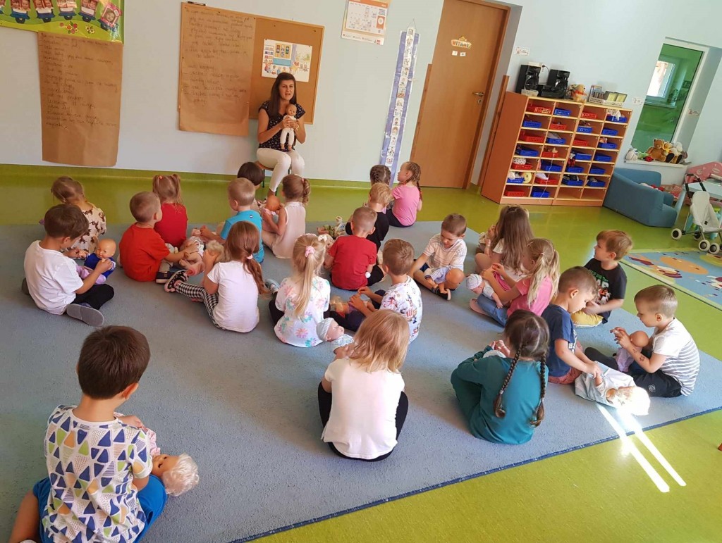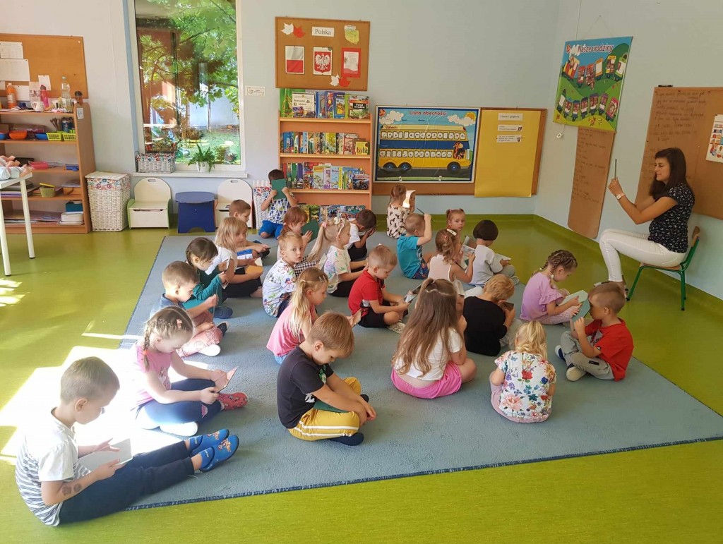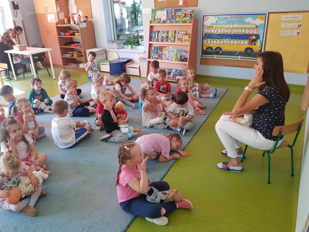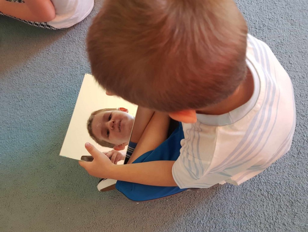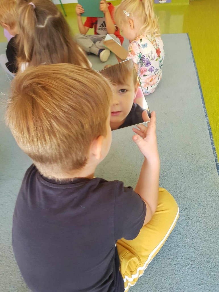 We wrześniu w ramach kształtowania pojęć matematycznych poznawaliśmy siebie. Podczas zabaw z zakresu dziecięcej matematyki wg koncepcji prof. Edyty Gruszczyk-Kolczyńskiej, poznaliśmy swoje ciało, wygląd głowy, sylwetki, próbowaliśmy zapamiętać kolor swoich oczu i włosów. Uczyliśmy się przedstawiać i opisywać swój wygląd na forum grupy oraz porównywaliśmy swój wygląd do wyglądu lalki i misia. Wiele radości sprawiła nam zabawa polegająca na robieniu różnych min do luster oraz pojedynek na najśmieszniejszą minę. Na zakończenie zabaw z tego zakresu dziecięcej matematyki narysowaliśmy postać człowieka.