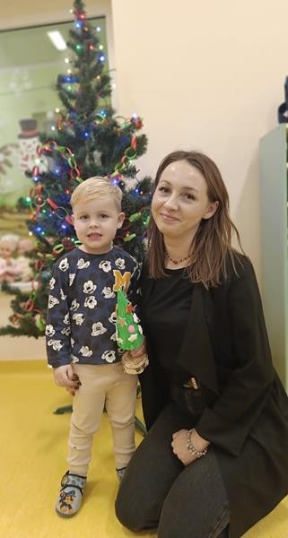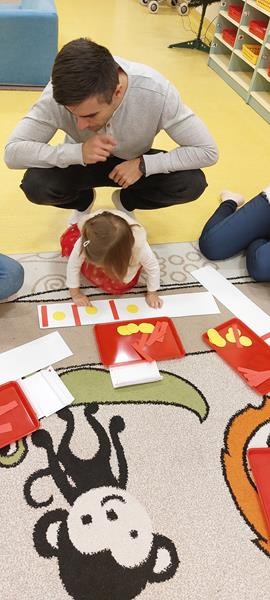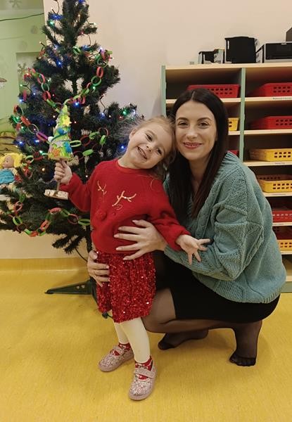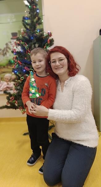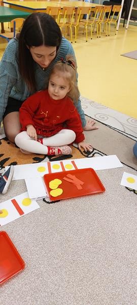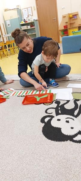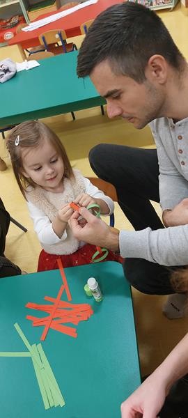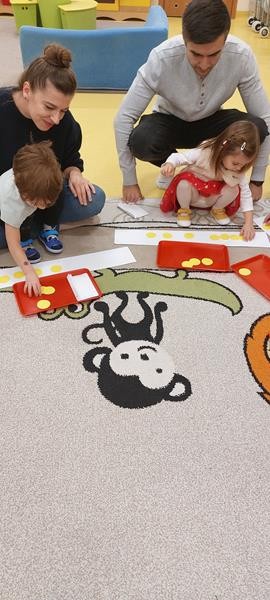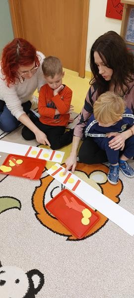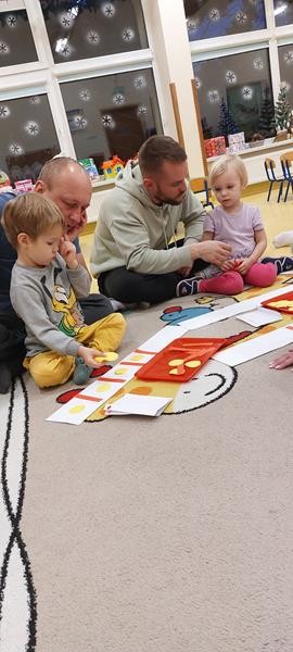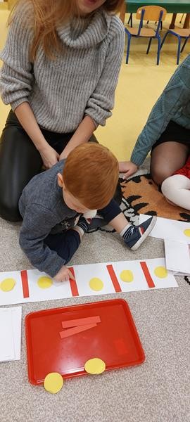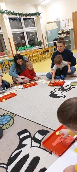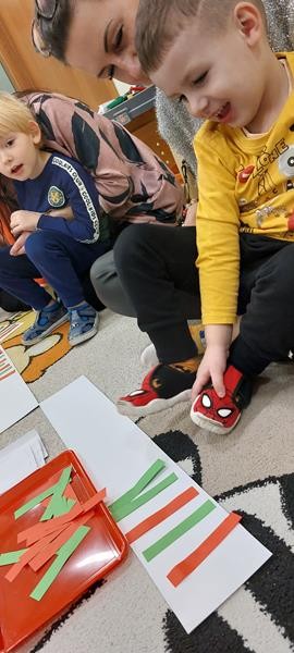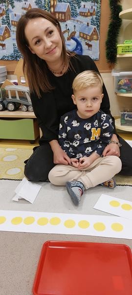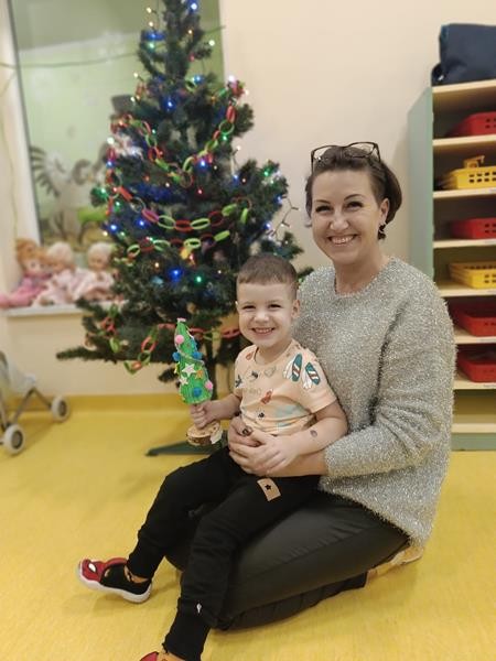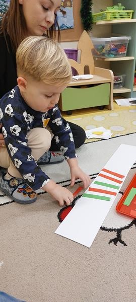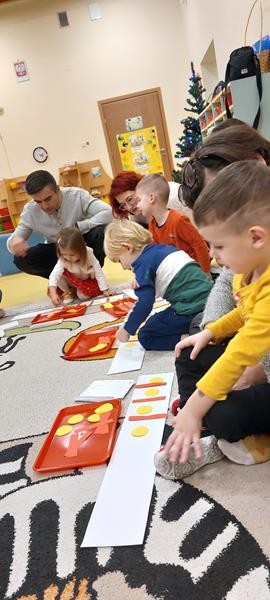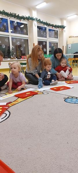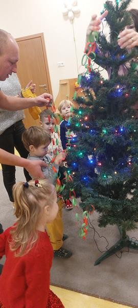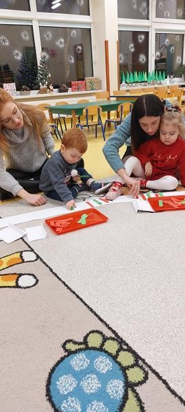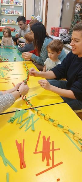 Podczas zajęć z zakresu ,, Dziecięcej matematyki " maluszki wraz z rodzicami doskonaliły rytmy. Efektem finalnym wspólnych działań matematycznych był łańcuch choinkowy, który zawisł na grupowej choince. Podczas spotkania dzieci wykonały również ozdoby świąteczne - choineczki ,którymi przyozdobią swoje pokoiki na święta.