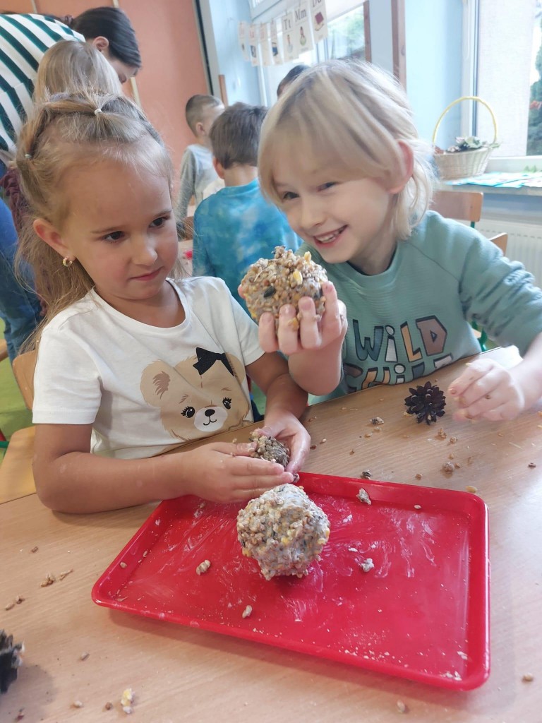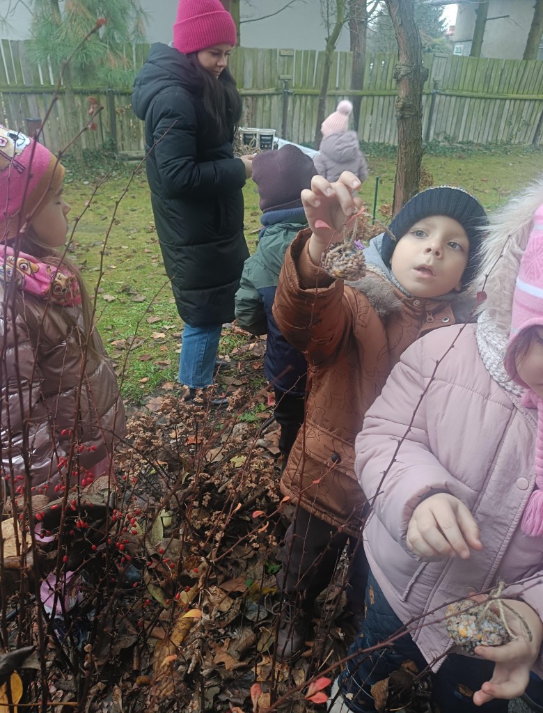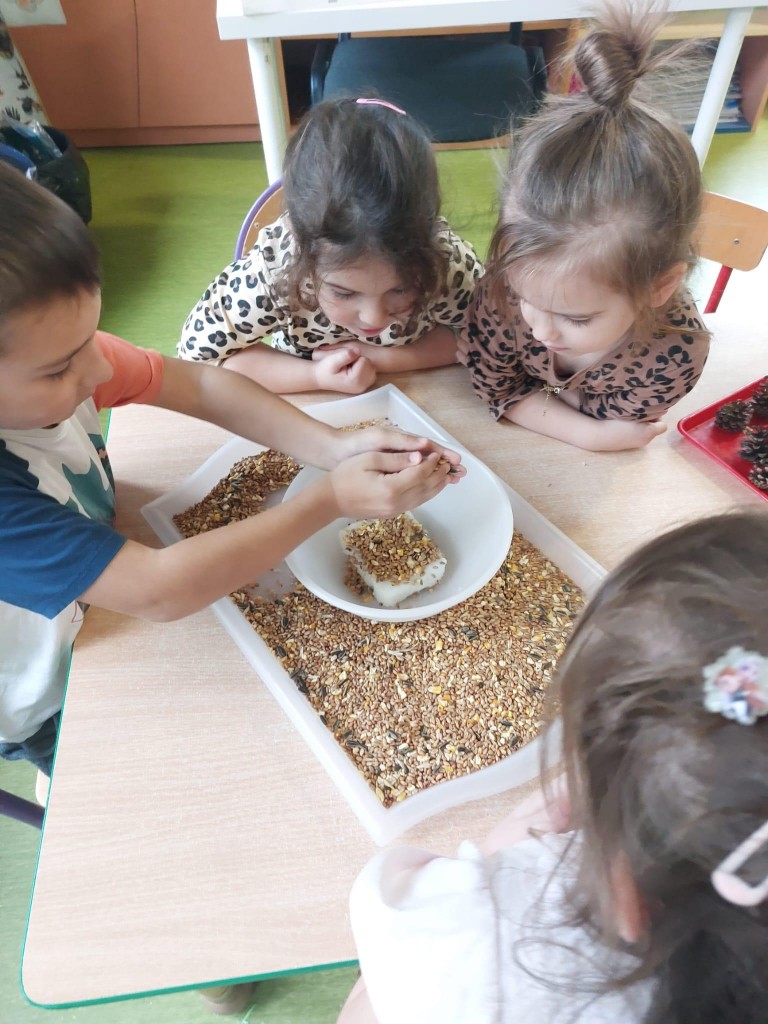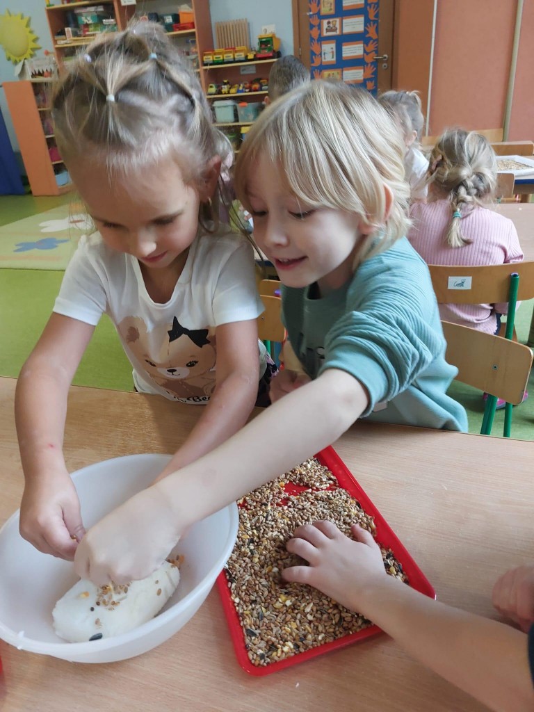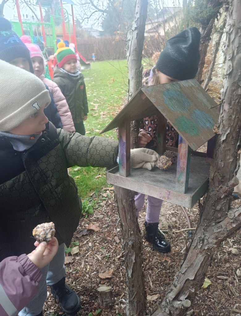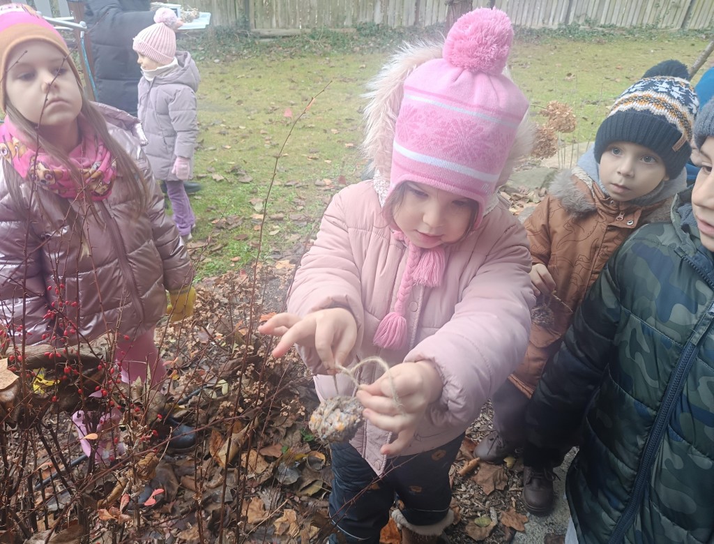 W minionym tygodniu 4/5 latki mówiły o zwierzętach i ich sposobach na to,aby przetrwać zbliżającą się zimę. Na podsumowanie zdobytych wiadomości, postanowiliśmy przygotować ptakom,które zostały w naszym kraju tłuszczowe kule z mieszanką ziaren, które dzieci rozwiesiły na na naszym przedszkolnym podwórku.