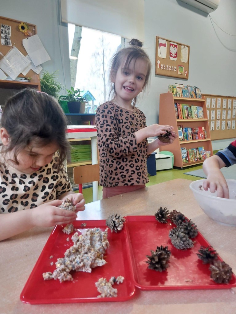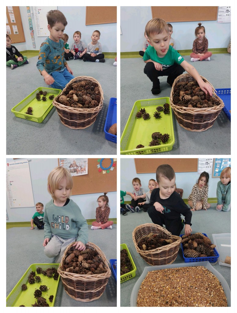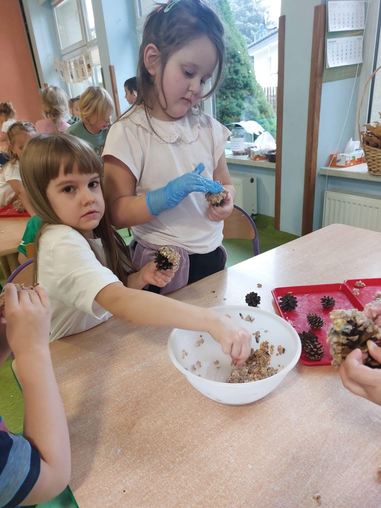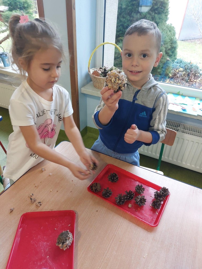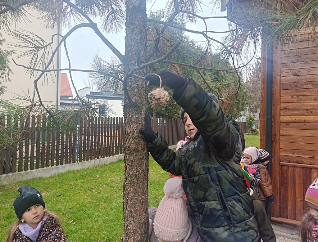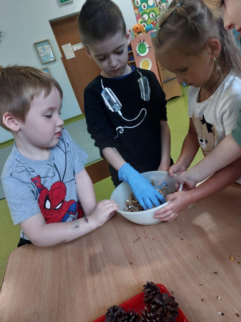 W minionym tygodniu 4/5 latki mówiły o zwierzętach i ich sposobach na to,aby przetrwać zbliżającą się zimę. Na podsumowanie zdobytych wiadomości, postanowiliśmy przygotować ptakom,które zostały w naszym kraju tłuszczowe kule z mieszanką ziaren, które dzieci rozwiesiły na na naszym przedszkolnym podwórku.