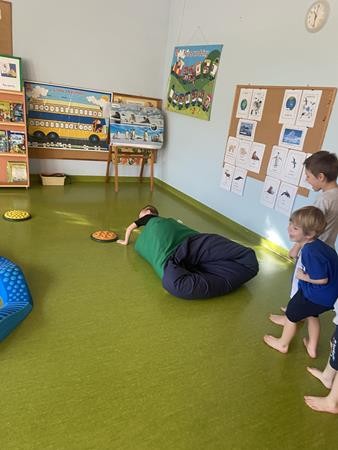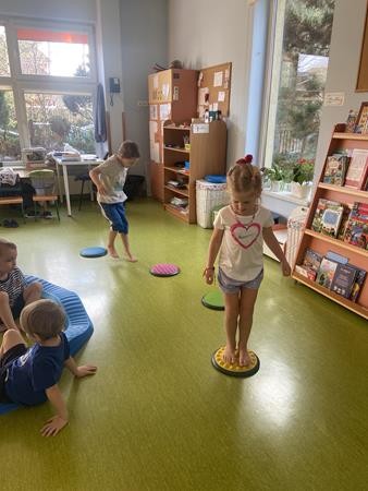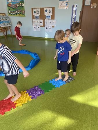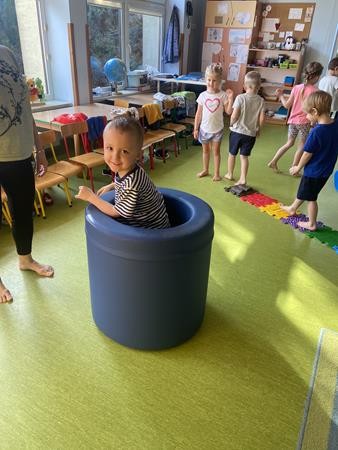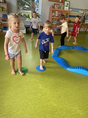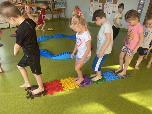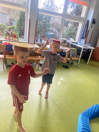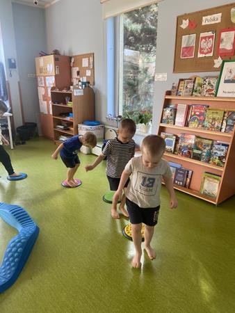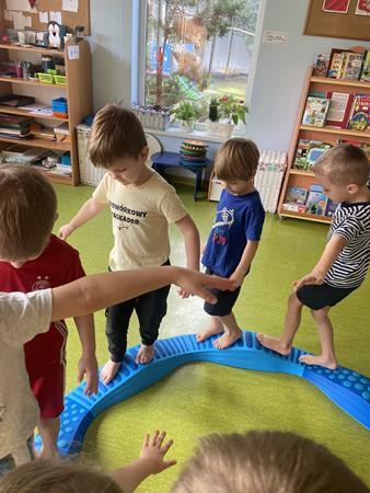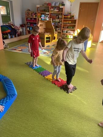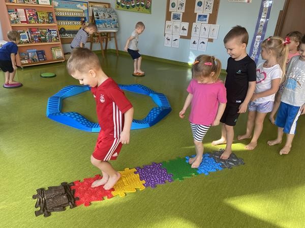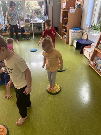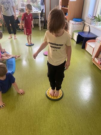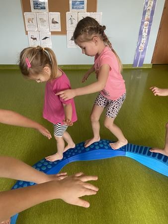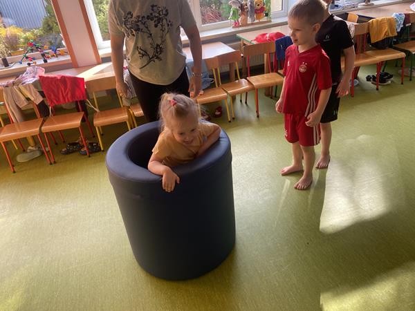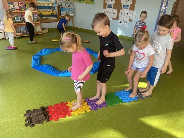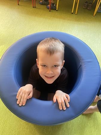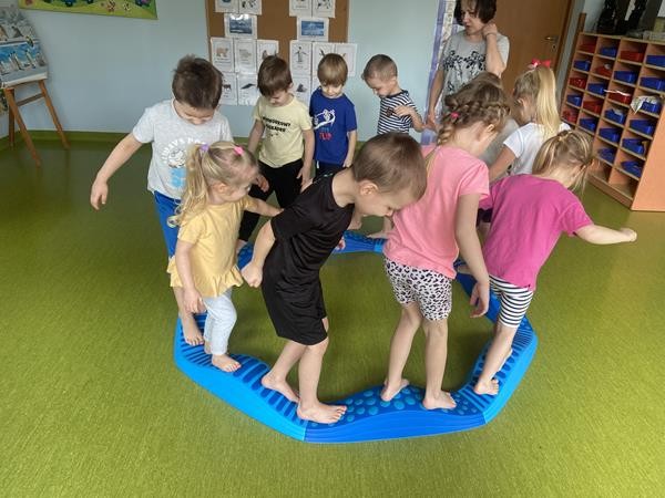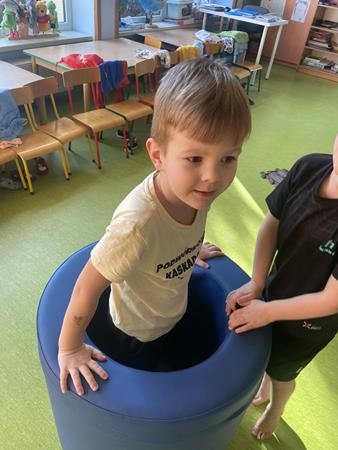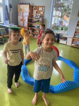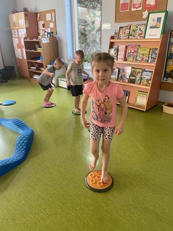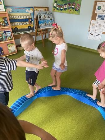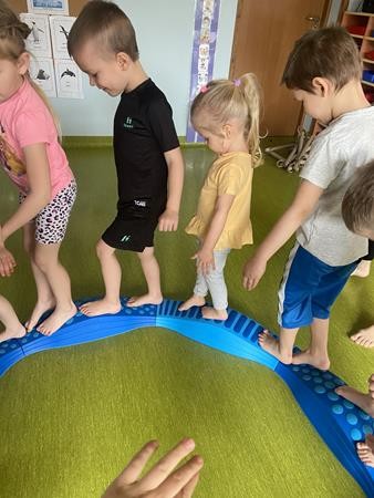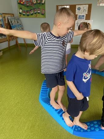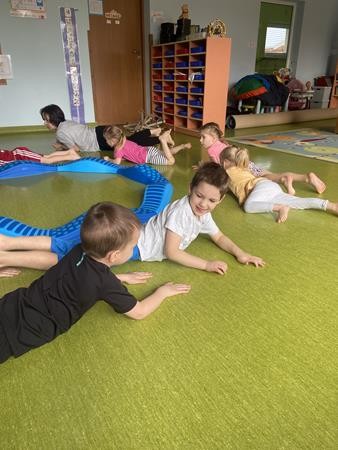 Każdy przedszkolak Wam powie, że ruch to zdrowie! Dlatego nasze przedszkolaki, chętnie uczestniczą w róznych formach aktywności ruchowej. Tym razem wykorzystaliśmy sprzęt sportowy do terapii integracji sensorycznej. Dzieciom bardzo się podobało, a uśmiechnięte buzie mówią wszystko.