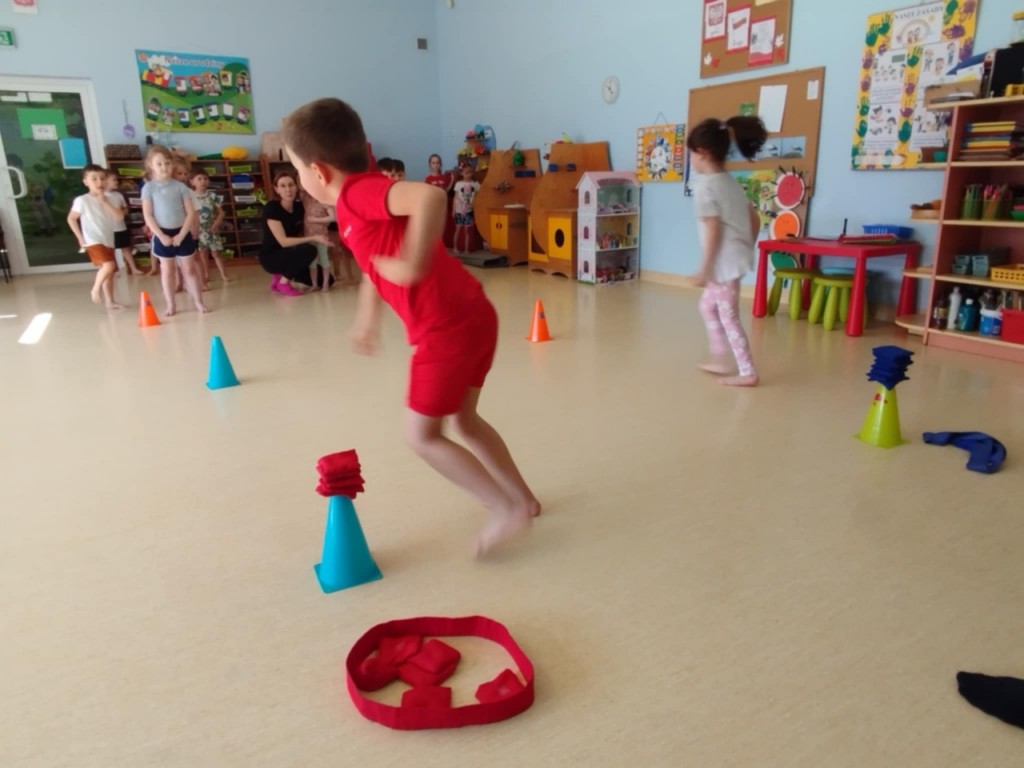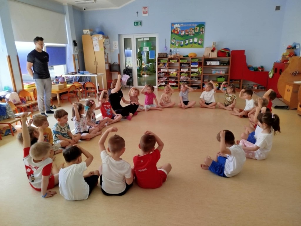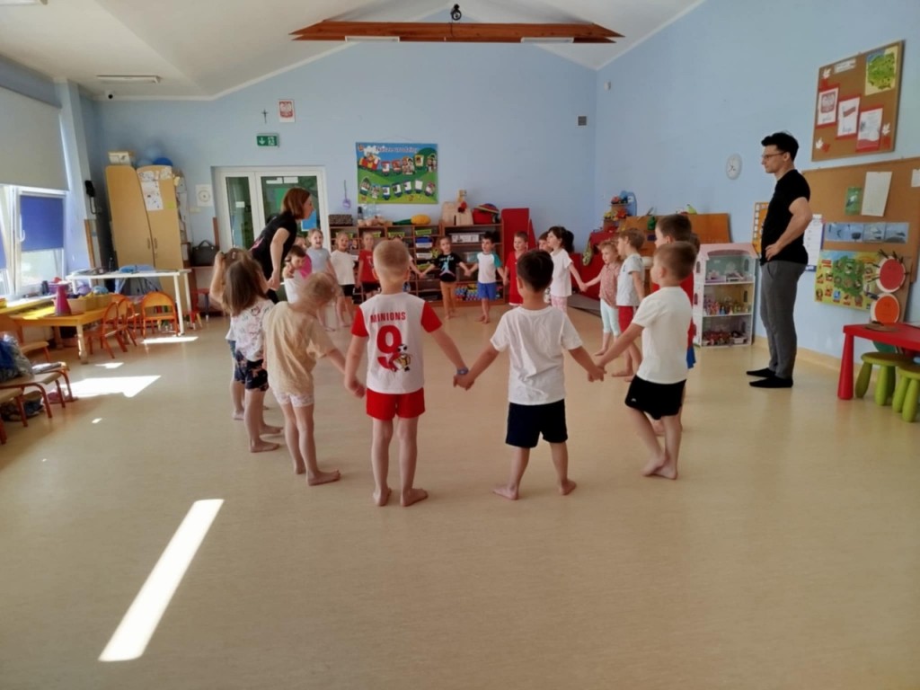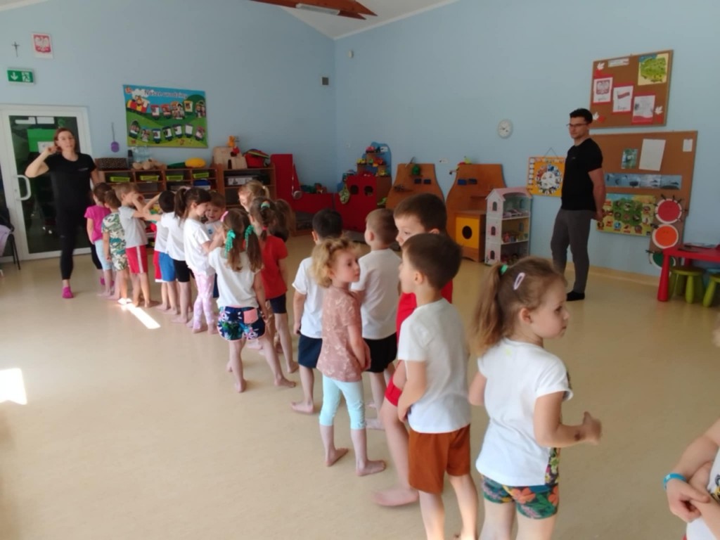 Dnia 4 kwietnia mieliśmy zaszczyt gościć panią Magdalenę wraz z panem Pawłem z Awf-u, którzy poprowadzili dla nas ciekawe zabawy ruchowe. Nie było czasu na nudę – każdy aktywnie spędził ten czas. Najbardziej podobały nam się zabawy z szarfami a proponowane ćwiczenia wykonywaliśmy zgodnie z instrukcją oraz na miarę własnych możliwości. Poprzez różnorodne ćwiczenia rozwijaliśmy swoje umiejętności ruchowe, koordynację, równowagę i siłę mięśni.