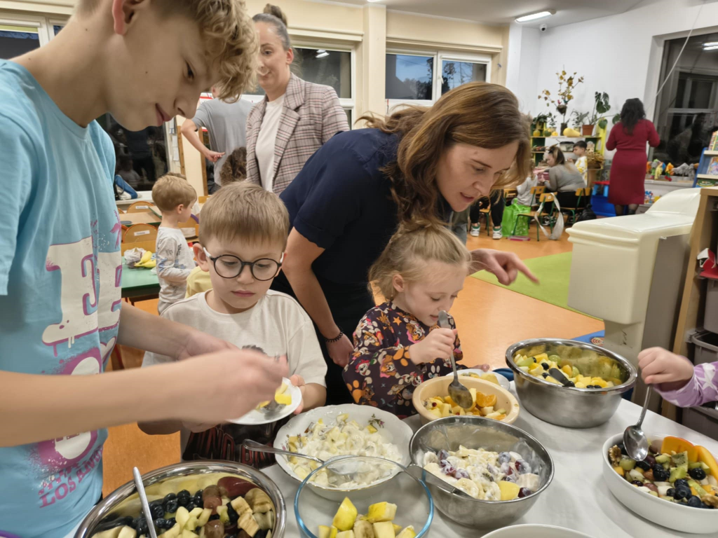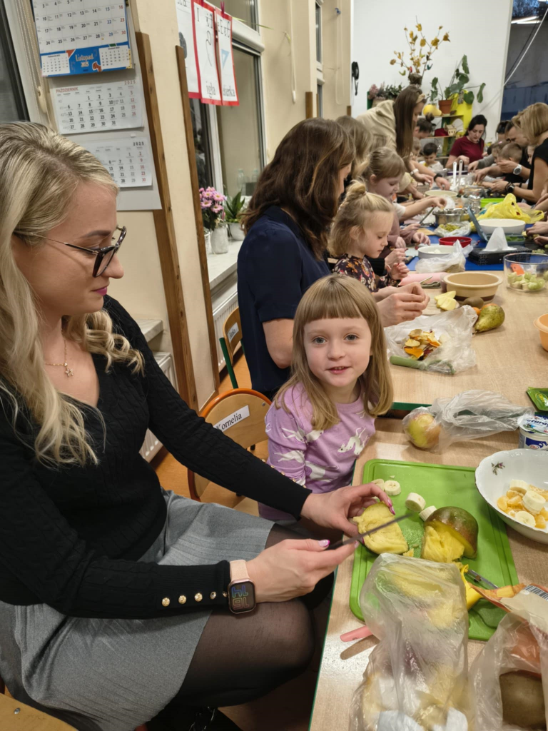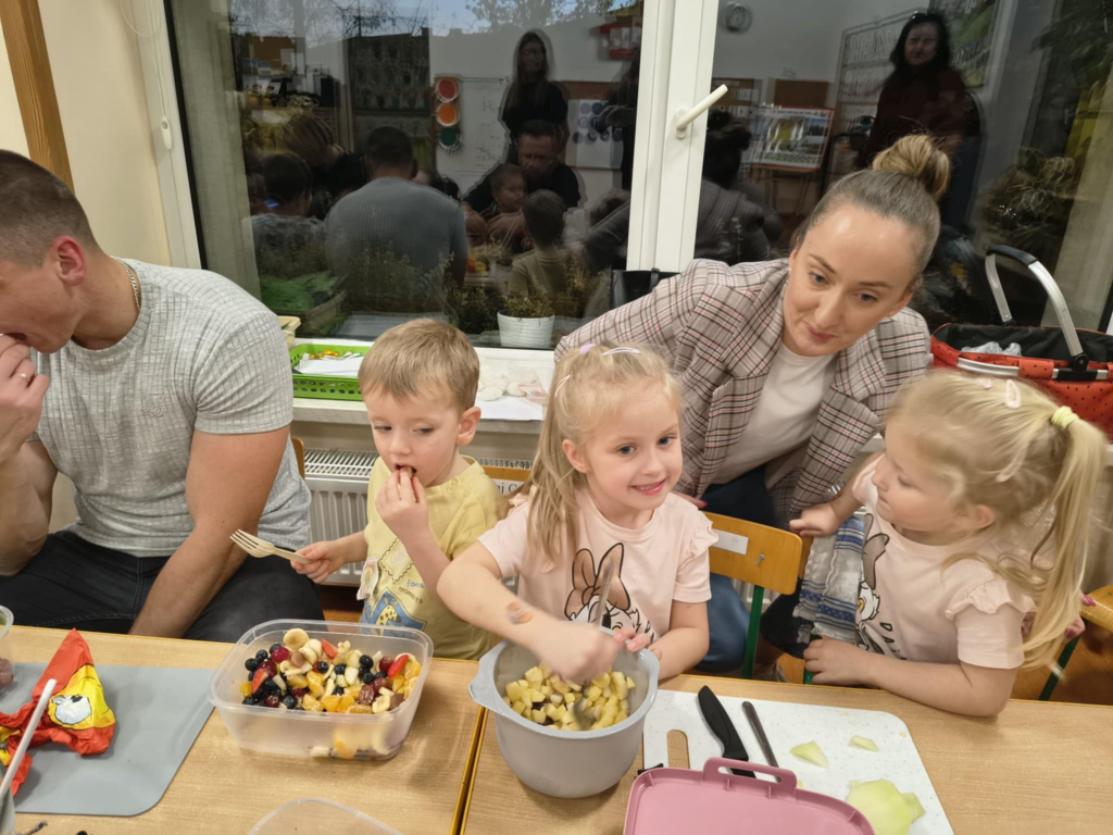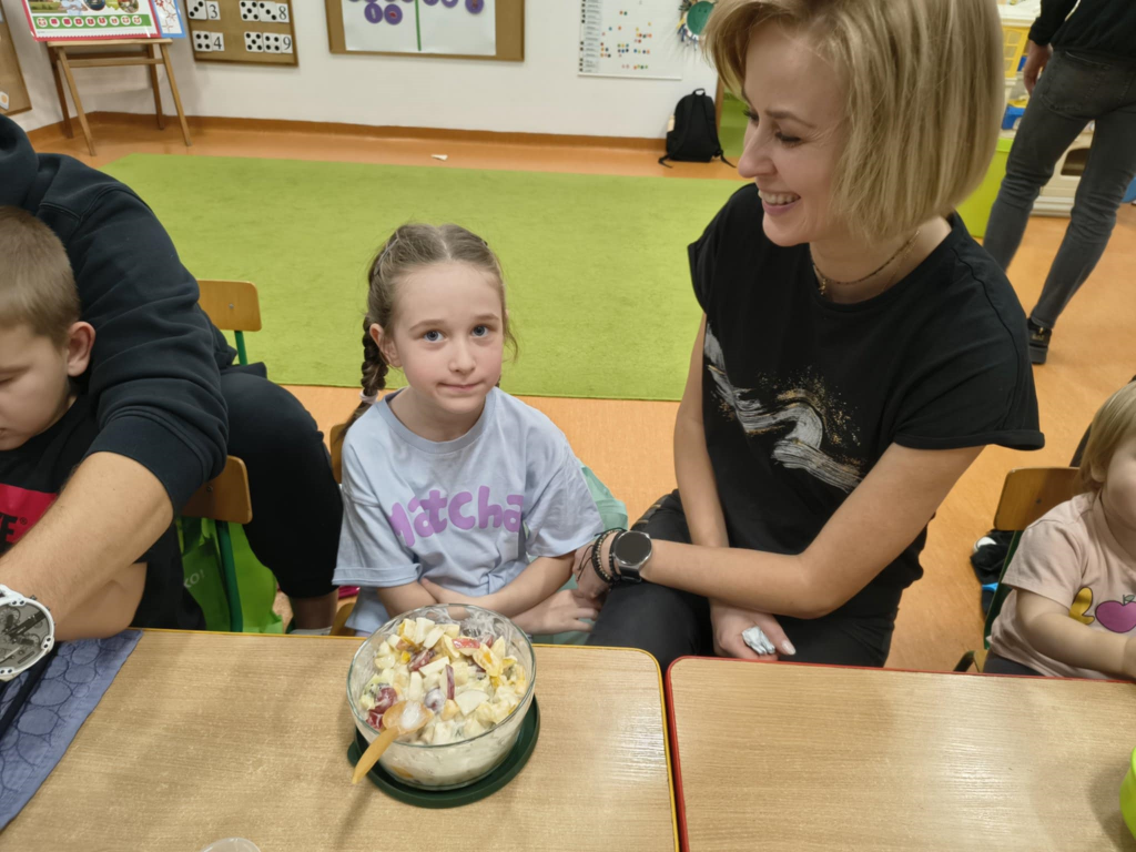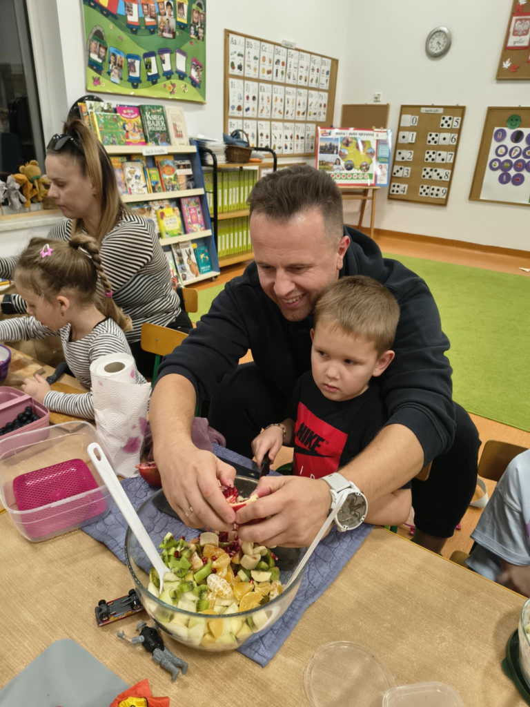 W listopadzie zaprosiliśmy naszych rodziców na zajęcia otwarte, których tematyka dotyczyła zdrowego odżywiania. Podczas zajęć utrwaliliśmy zasady zdrowego odżywania - co jeść a czego unikać aby być zdrowym, rozpoznawaliśmy po dotyku wybrane owoce i warzywa. Na zakończenie spotkania z przyniesionych przez rodziców owoców i warzyw powstały przepyszne i zdrowe sałatki. Każda inna, każda wyjątkowa i bardzo smaczna. To była niezapomniana uczta pełna witamin.