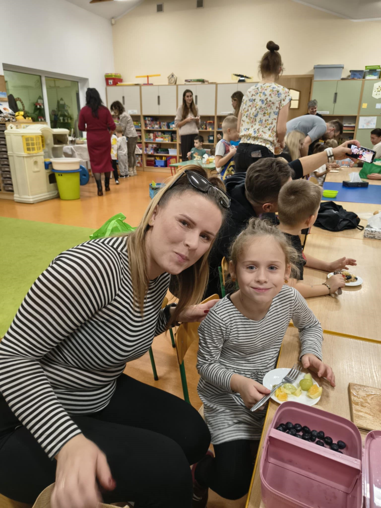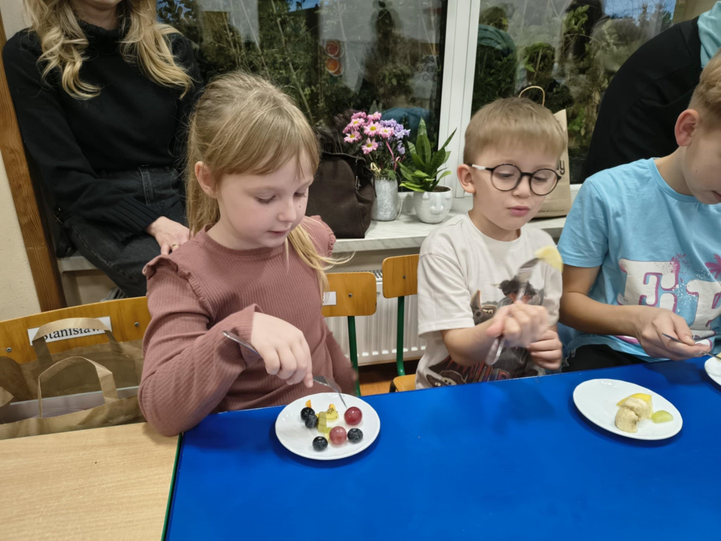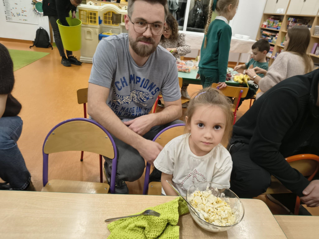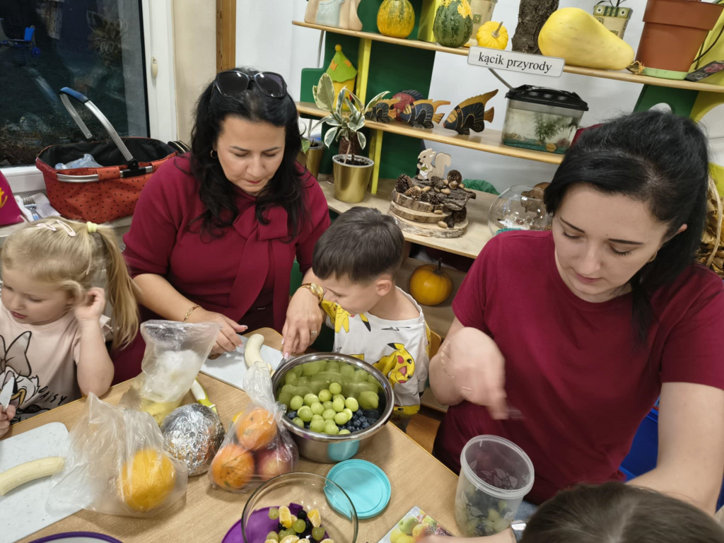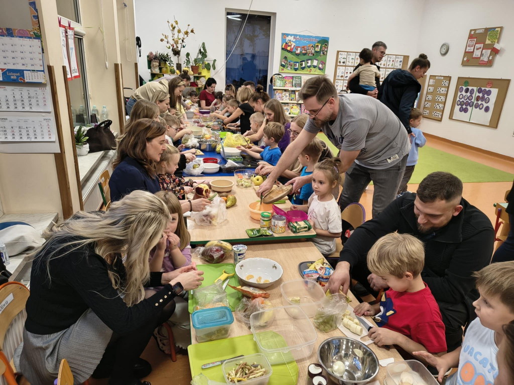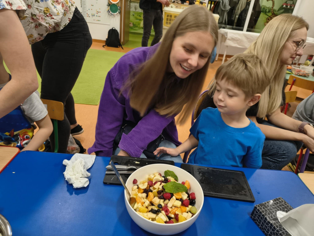 W listopadzie zaprosiliśmy naszych rodziców na zajęcia otwarte, których tematyka dotyczyła zdrowego odżywiania. Podczas zajęć utrwaliliśmy zasady zdrowego odżywania - co jeść a czego unikać aby być zdrowym, rozpoznawaliśmy po dotyku wybrane owoce i warzywa. Na zakończenie spotkania z przyniesionych przez rodziców owoców i warzyw powstały przepyszne i zdrowe sałatki. Każda inna, każda wyjątkowa i bardzo smaczna. To była niezapomniana uczta pełna witamin.