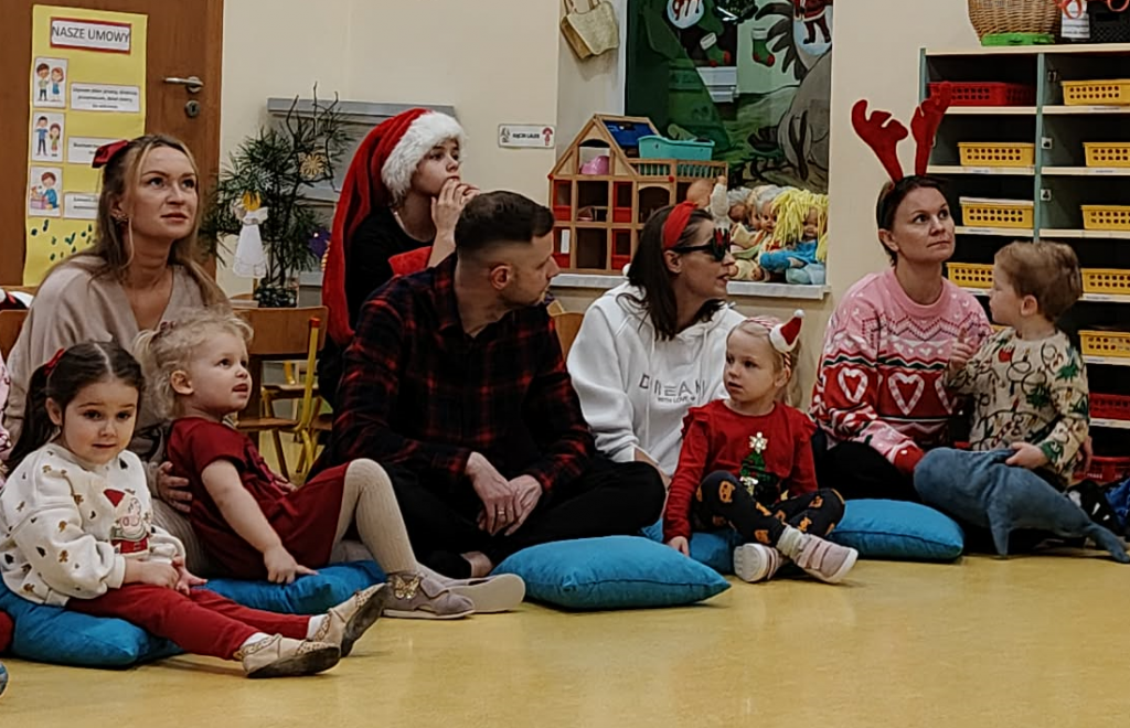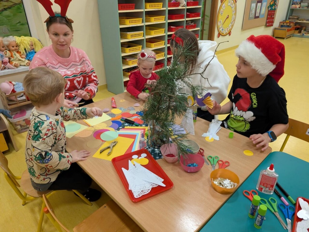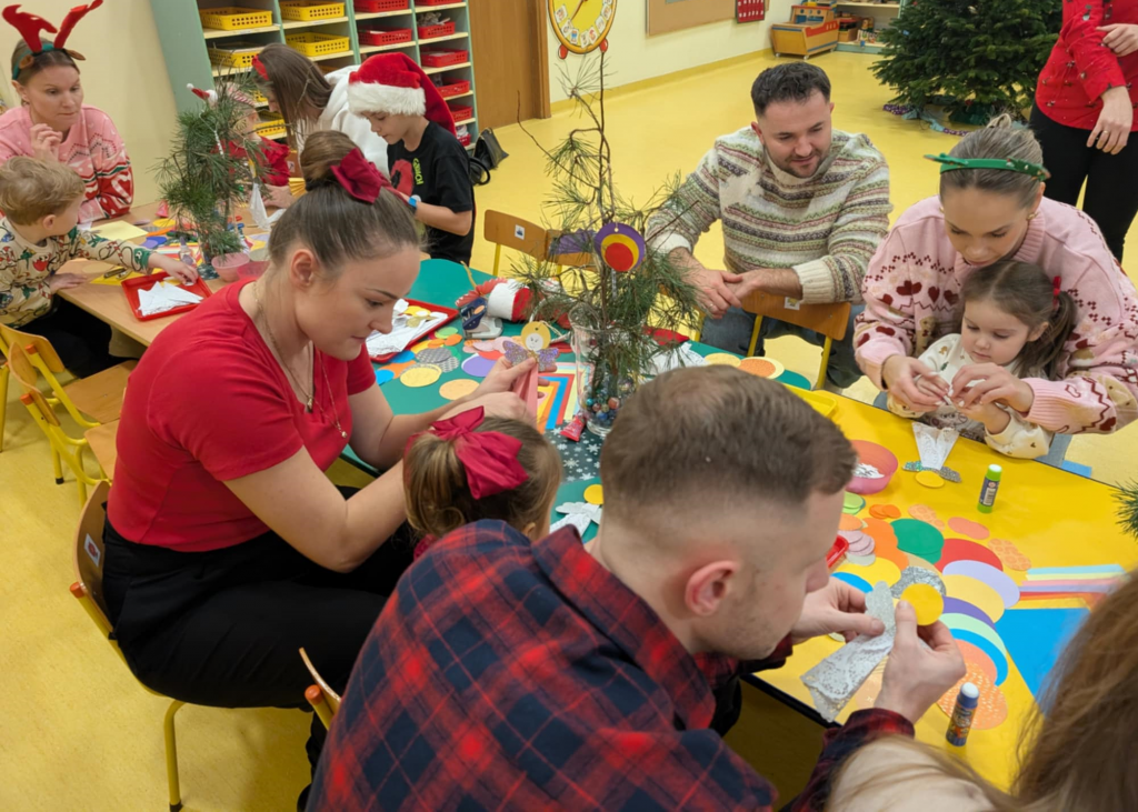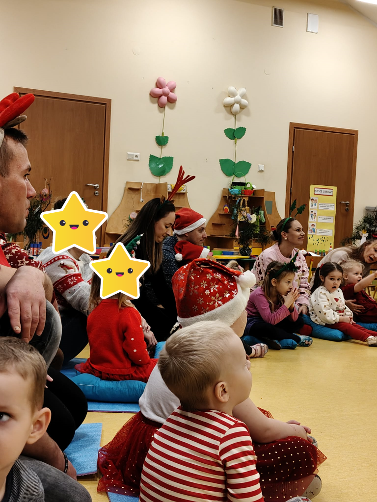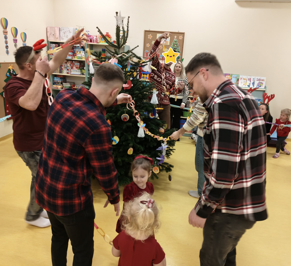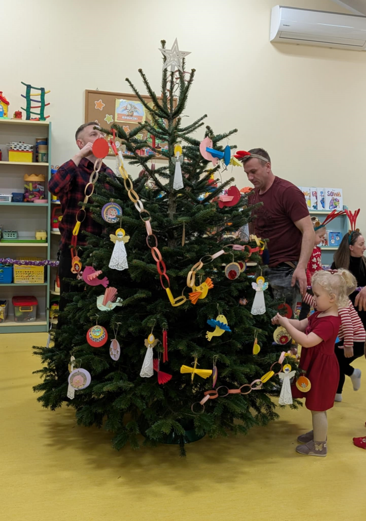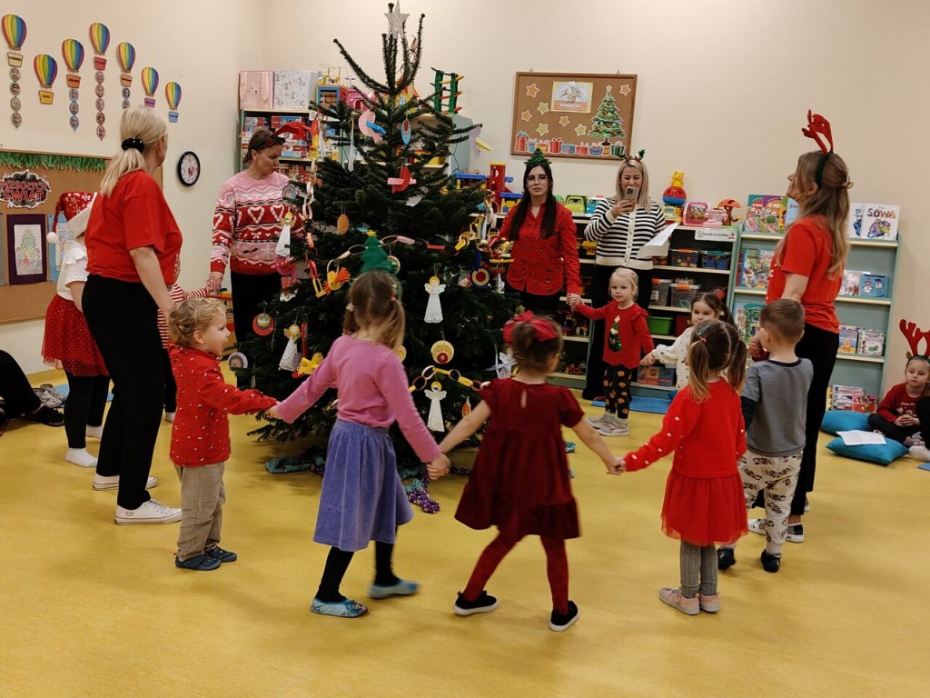 Już grudzień, a jak grudzień to i święta... Wszyscy czekamy na nie z wypiekami na twarzach przygotowując ozdoby, dekorując przedszkole, poznając tradycje związane ze świętami Bożego Narodzenia. W dniu 10 grudnia w naszej grupie odbyły się zajęcia otwarte dla rodziców pt.: „Spotkanie z choinką”. Głównym celem było wzbogacenie wiadomości na temat tradycji związanych ze świętami – ubieranie choinki – oraz wzmacnianie wzajemnych relacji w rodzinie. Podczas spotkania wspólnie z naszymi rodzicami z wielkim zapałem wykonywaliśmy przepiękne ozdoby choinkowe wykazując przy tym wiele kreatywności. Nasze kolorowe ozdoby zawisły na świątecznym drzewku, przy którym wspólnie z rodzicami uczestniczyliśmy we wspólnych zabawach tanecznych i mini koncercie kolęd. Był to naprawdę mile spędzony czas, który wprowadził zarówno dla dzieci i rodziców w świąteczny nastrój. Serdecznie dziękujemy wszystkim za przybycie i wspólną zabawę.