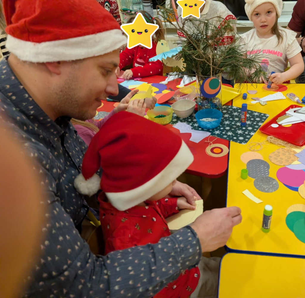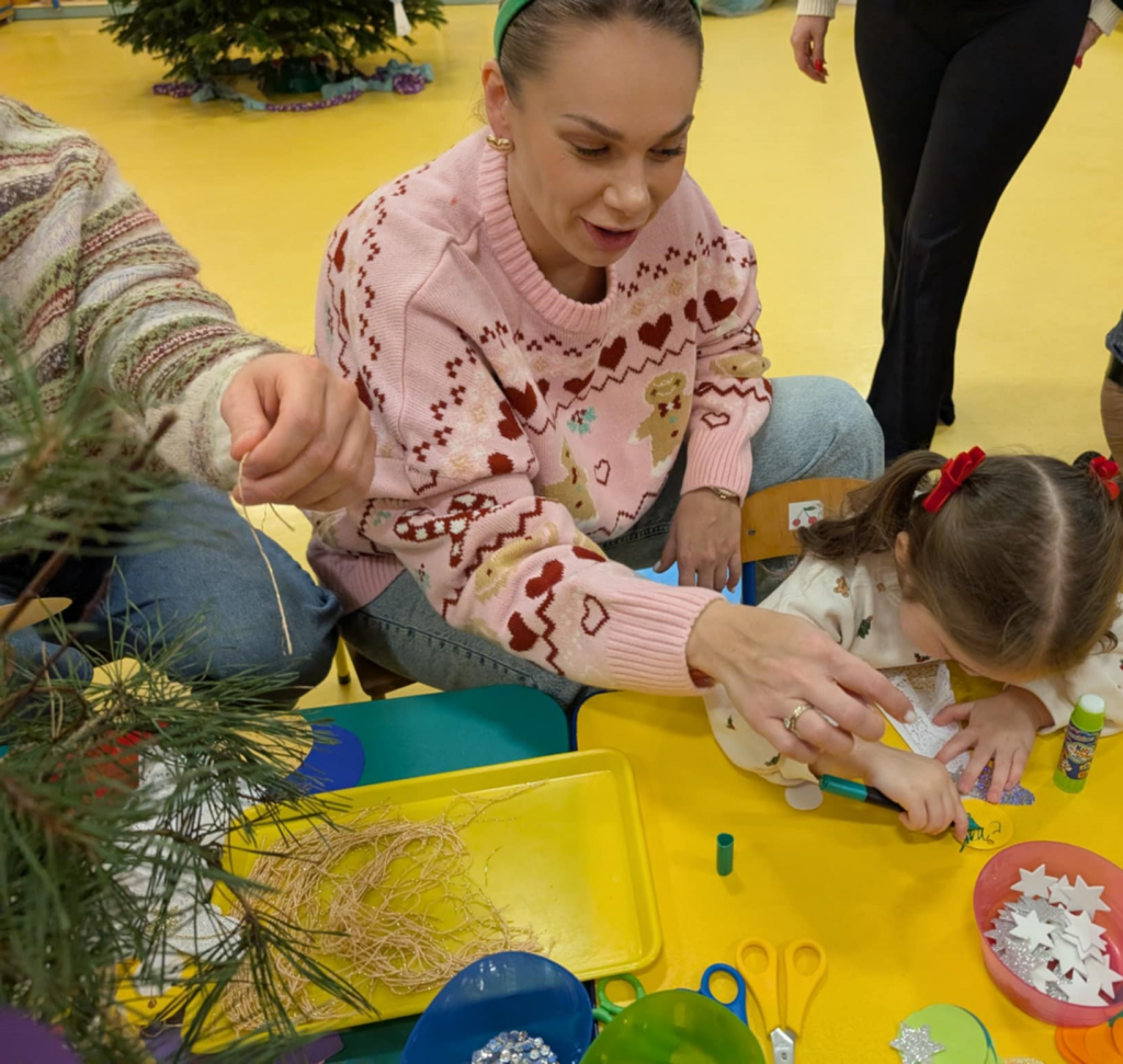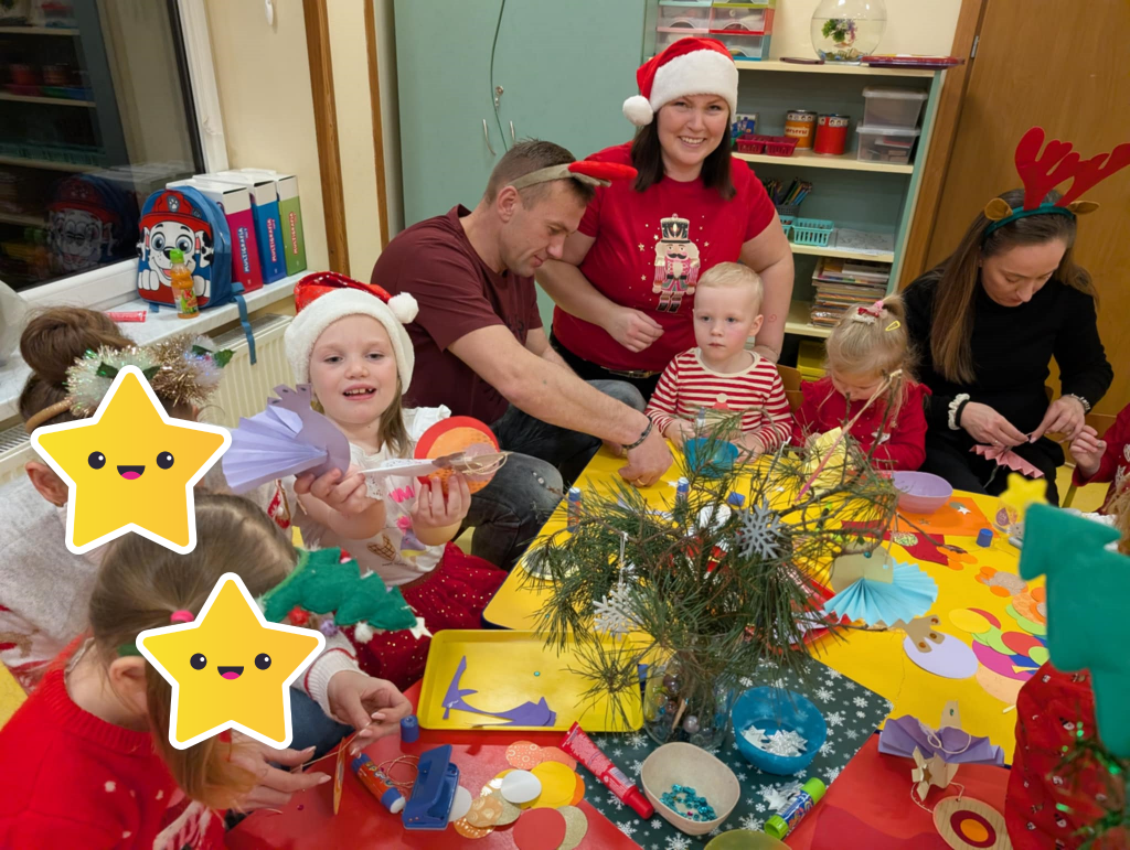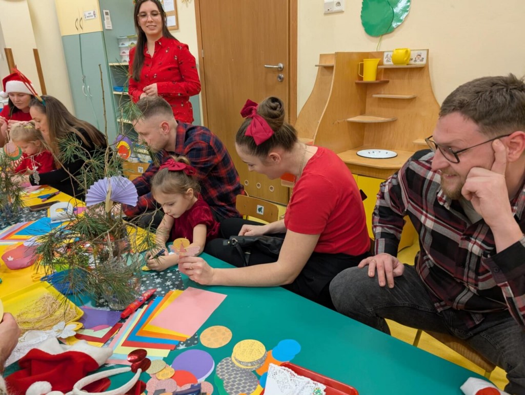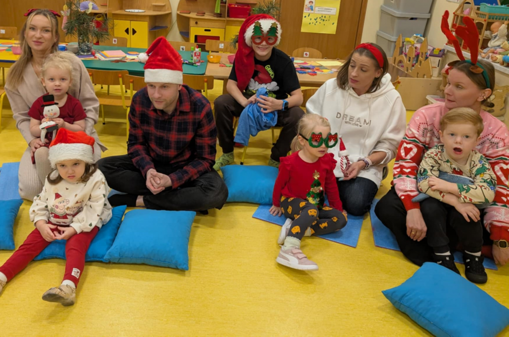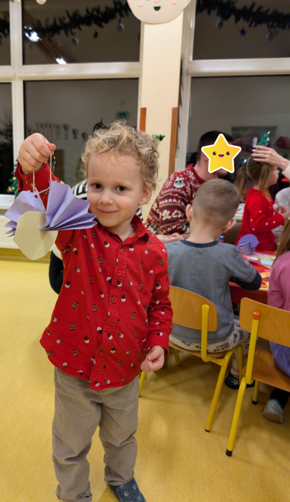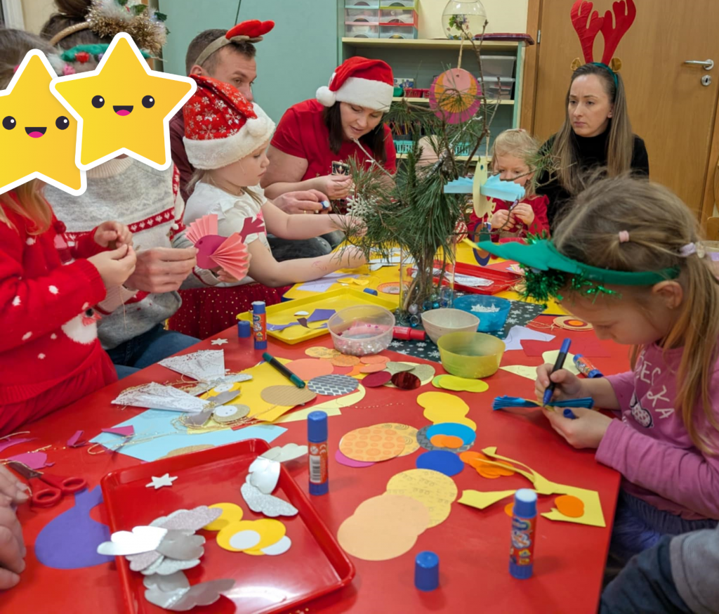 Już grudzień, a jak grudzień to i święta... Wszyscy czekamy na nie z wypiekami na twarzach przygotowując ozdoby, dekorując przedszkole, poznając tradycje związane ze świętami Bożego Narodzenia. W dniu 10 grudnia w naszej grupie odbyły się zajęcia otwarte dla rodziców pt.: „Spotkanie z choinką”. Głównym celem było wzbogacenie wiadomości na temat tradycji związanych ze świętami – ubieranie choinki – oraz wzmacnianie wzajemnych relacji w rodzinie. Podczas spotkania wspólnie z naszymi rodzicami z wielkim zapałem wykonywaliśmy przepiękne ozdoby choinkowe wykazując przy tym wiele kreatywności. Nasze kolorowe ozdoby zawisły na świątecznym drzewku, przy którym wspólnie z rodzicami uczestniczyliśmy we wspólnych zabawach tanecznych i mini koncercie kolęd. Był to naprawdę mile spędzony czas, który wprowadził zarówno dla dzieci i rodziców w świąteczny nastrój. Serdecznie dziękujemy wszystkim za przybycie i wspólną zabawę.