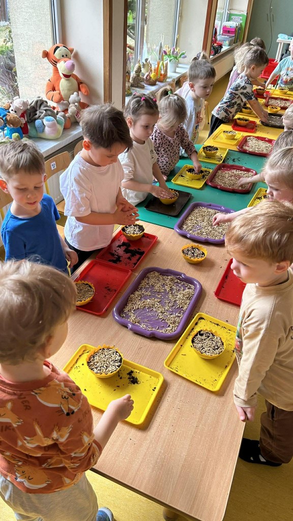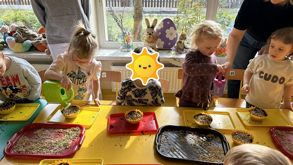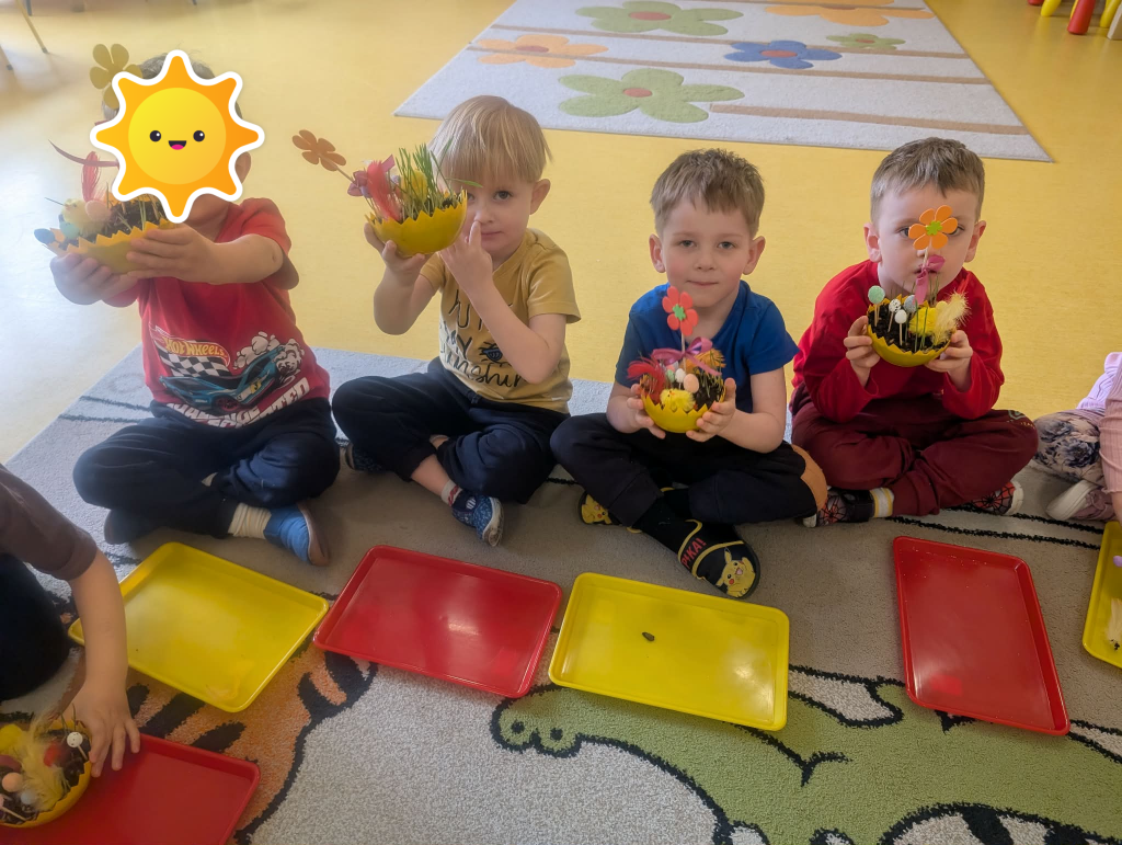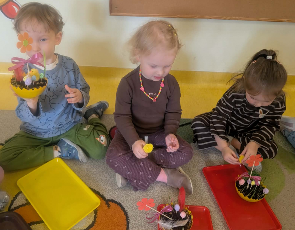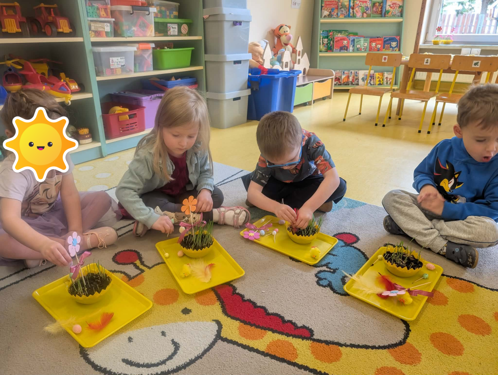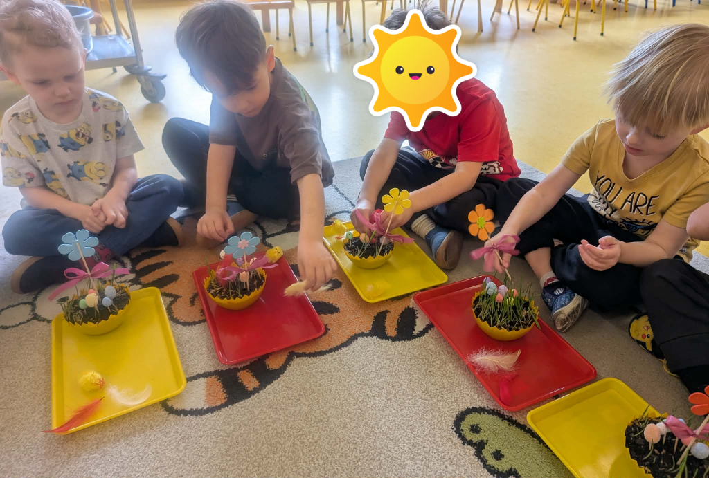 W ramach tematyki związanej z przygotowaniami do Świąt Wielkanocnych samodzielnie wykonaliśmy stroiki wielkanocne. Wysieliśmy owies do doniczek, następnie podlewaliśmy i sprawdzaliśmy, jak rośnie. Gdy już trochę podrósł, ozdobiłyśmy doniczki świątecznymi dekoracjami. Nie zabrakło wśród nich kolorowych pisanek, wiosennych kwiatków i puszystych kurczaczków.
