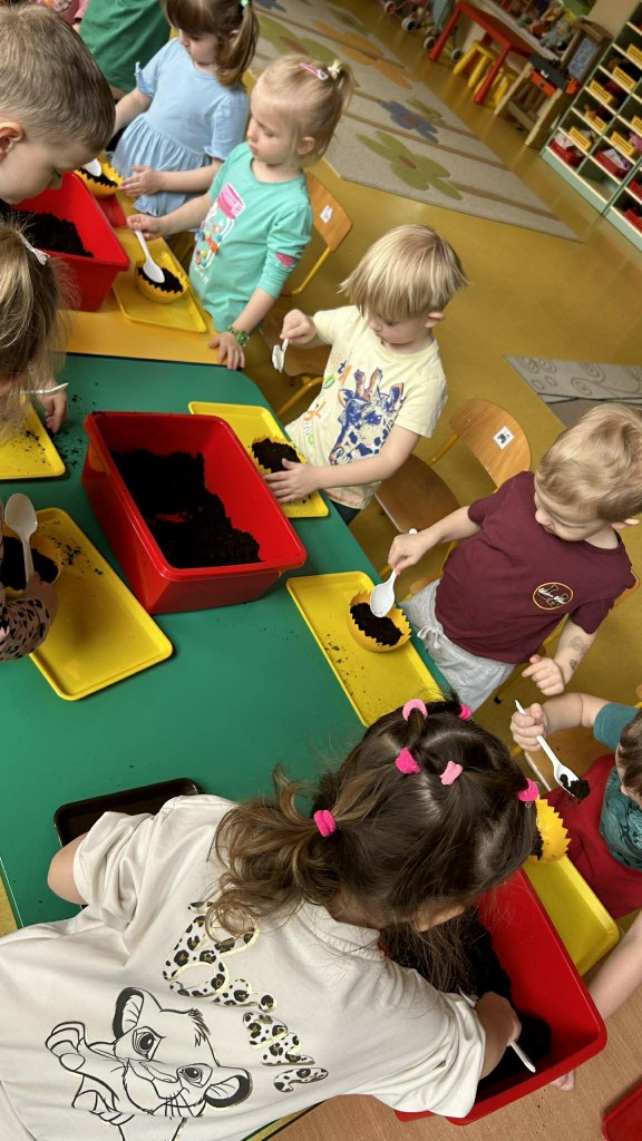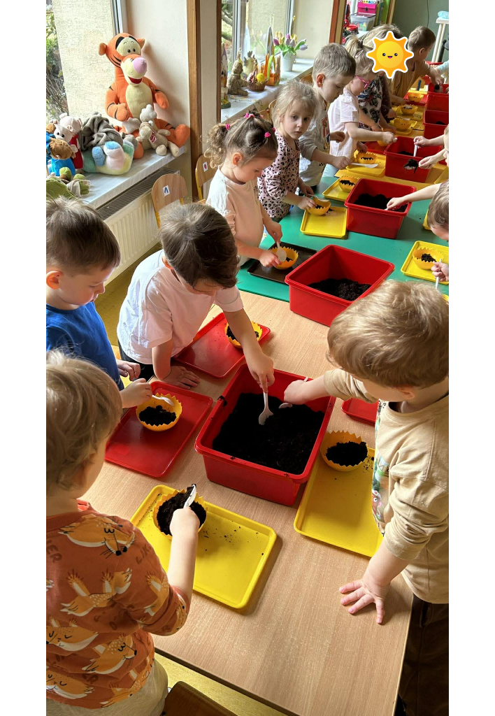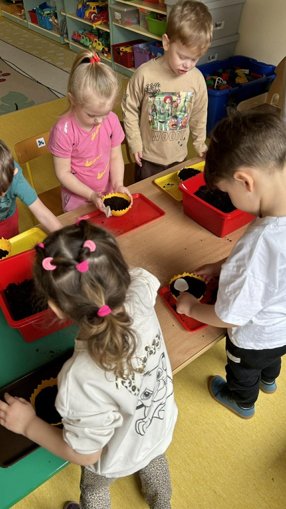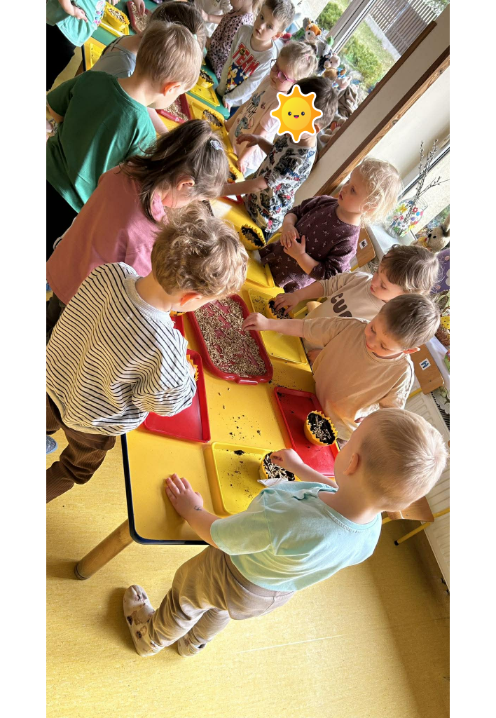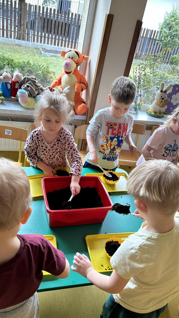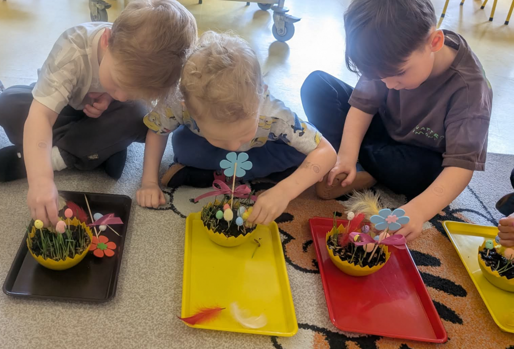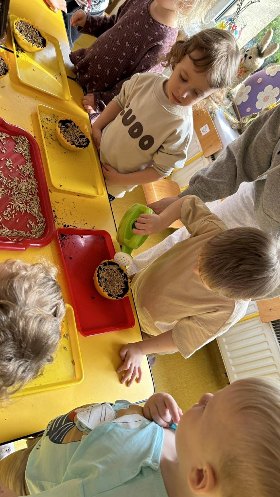 W ramach tematyki związanej z przygotowaniami do Świąt Wielkanocnych samodzielnie wykonaliśmy stroiki wielkanocne. Wysieliśmy owies do doniczek, następnie podlewaliśmy i sprawdzaliśmy, jak rośnie. Gdy już trochę podrósł, ozdobiłyśmy doniczki świątecznymi dekoracjami. Nie zabrakło wśród nich kolorowych pisanek, wiosennych kwiatków i puszystych kurczaczków.