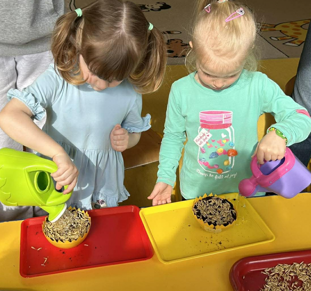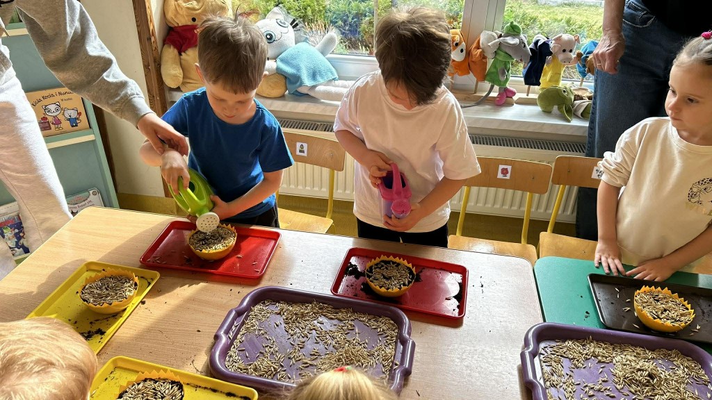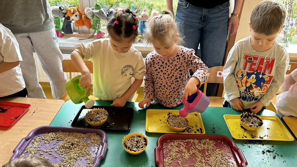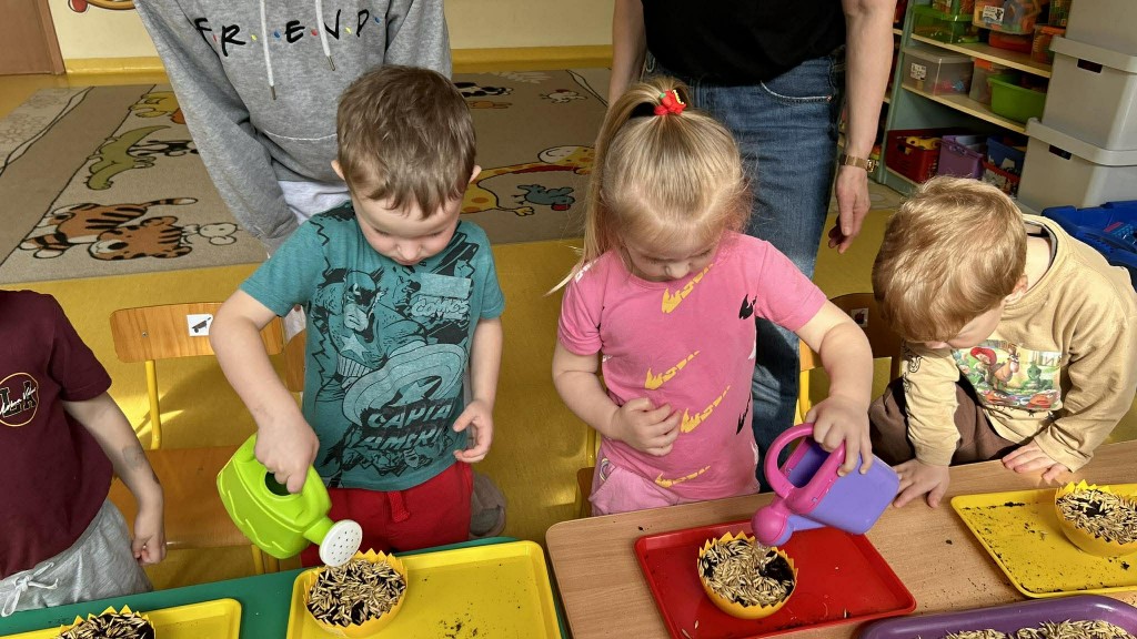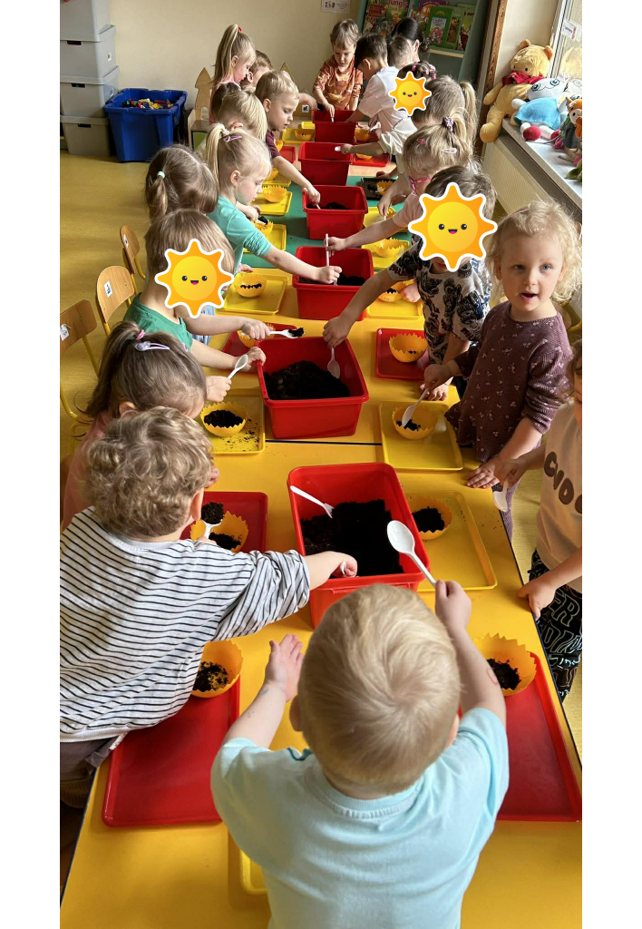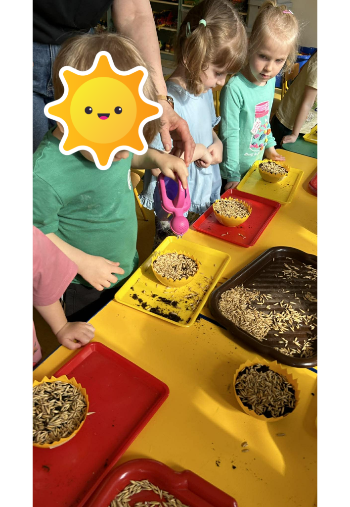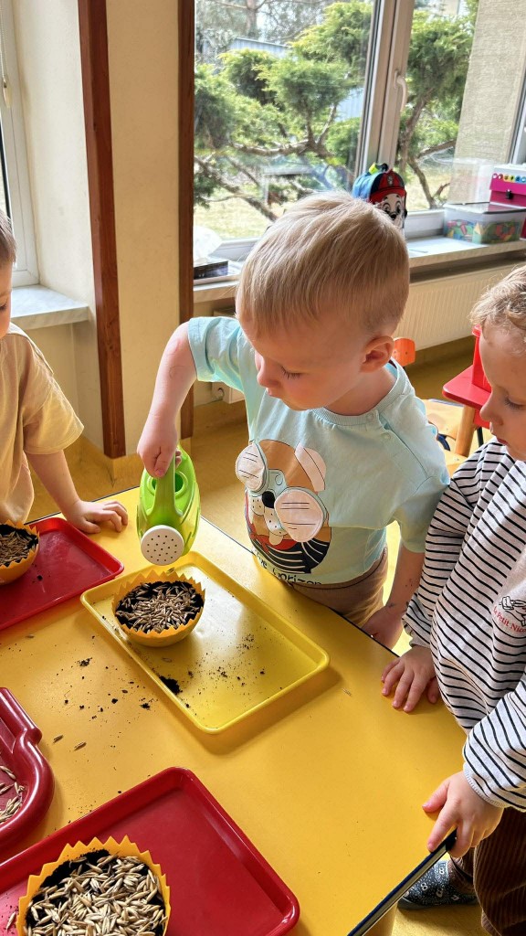 W ramach tematyki związanej z przygotowaniami do Świąt Wielkanocnych samodzielnie wykonaliśmy stroiki wielkanocne. Wysieliśmy owies do doniczek, następnie podlewaliśmy i sprawdzaliśmy, jak rośnie. Gdy już trochę podrósł, ozdobiłyśmy doniczki świątecznymi dekoracjami. Nie zabrakło wśród nich kolorowych pisanek, wiosennych kwiatków i puszystych kurczaczków.