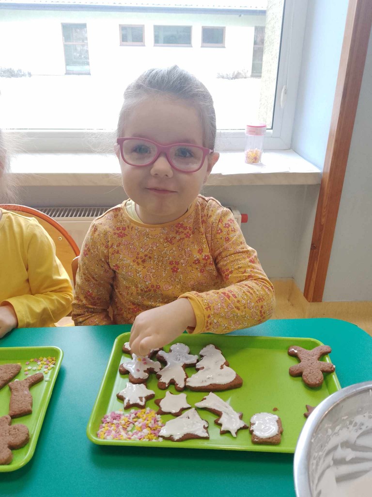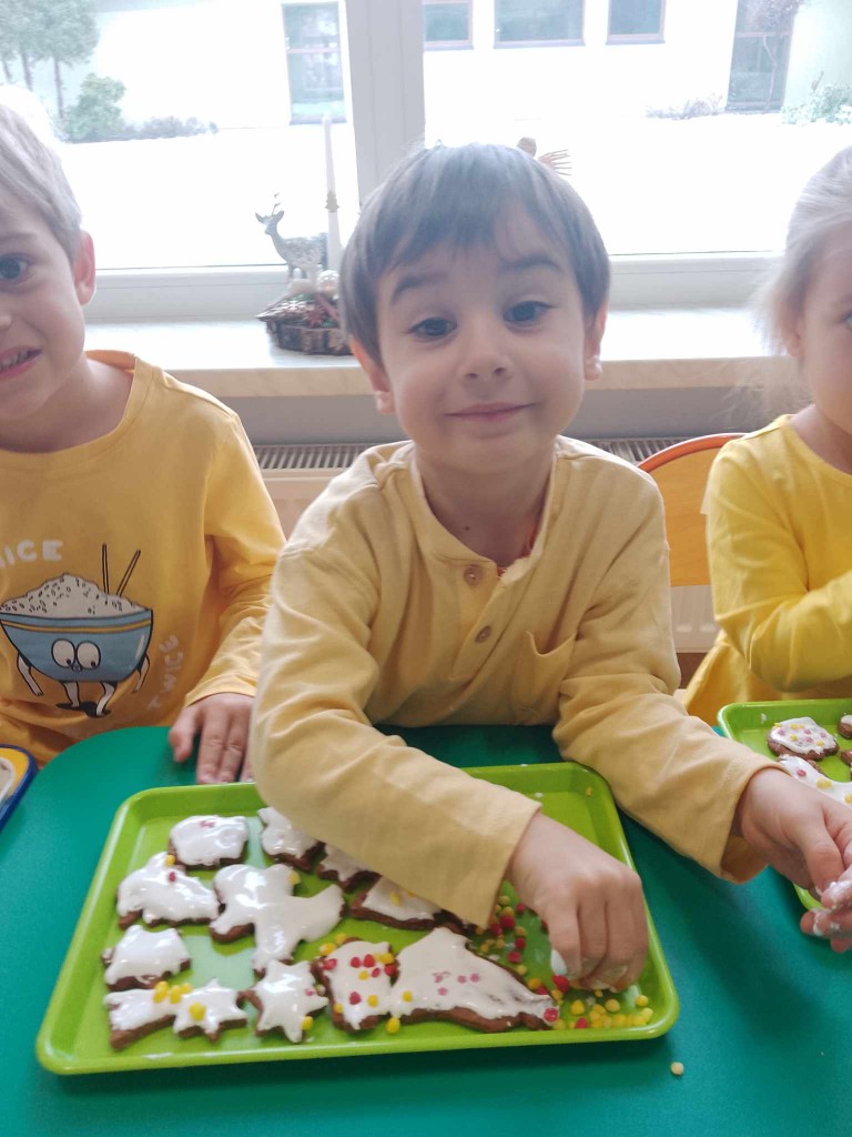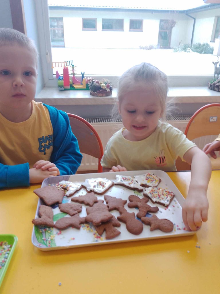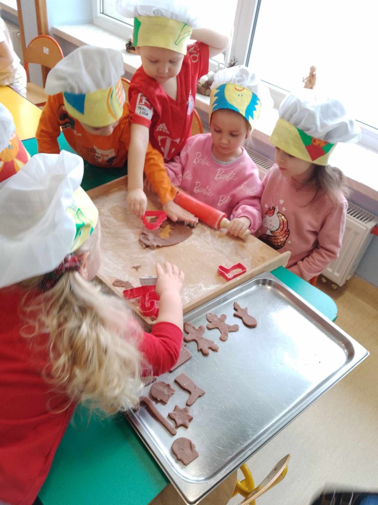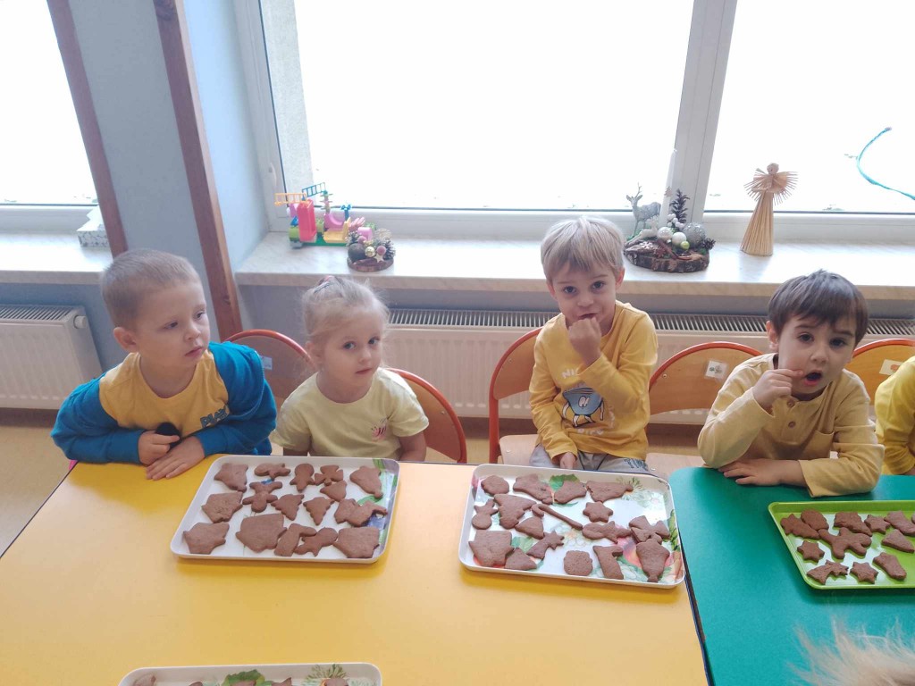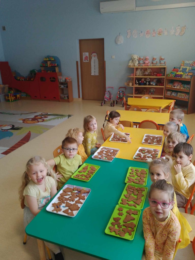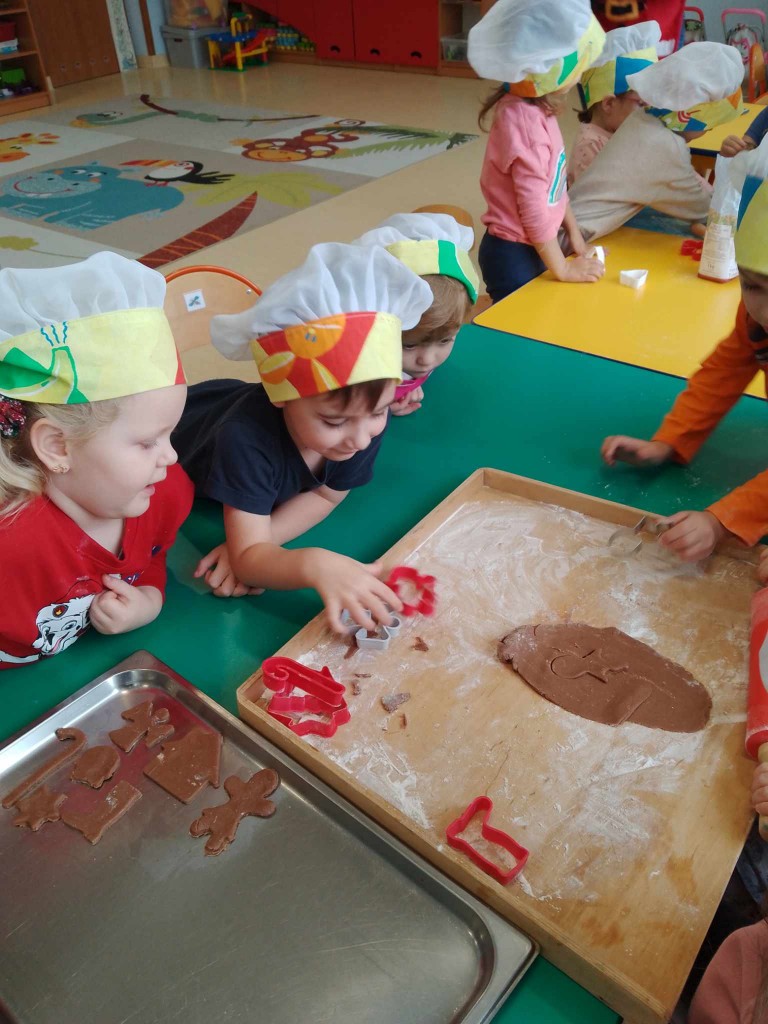 Przedświąteczne przygotowania nasza grupa rozpoczęła od upieczenia pierniczków. Z pomocą pań praca z przygotowaniem wypieków szła sprawnie. Bez trudu szło nam wałkowanie ciasta i wykrawanie różnych kształtów przy pomocy foremek. Nie zabrakło choinek, reniferów, misiów, dzwonków, gwiazdek i wielu, wielu innych. Po włożeniu wyciętych ciastek do piekarnika w całym przedszkolu zaczął unosić się słodki zapach korzennych pierników, przywołujący na myśl dom, święta i rodzinną atmosferę. Wspólne pieczenie i dekorowanie pierników było doskonałą zabawą. Pięknie przyozdobione pierniki będą wspaniałą dekoracją świątecznego stołu, a ich wyjątkowo intensywny aromat będzie nam towarzyszyć przez cały okres Świat Bożego Narodzenia.