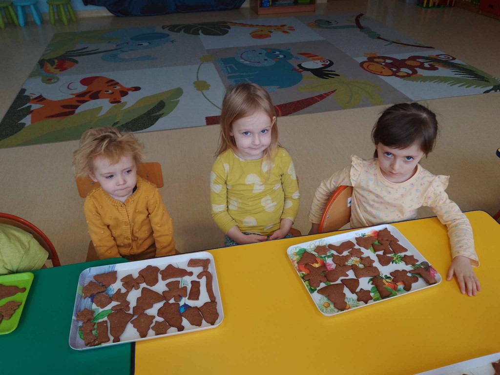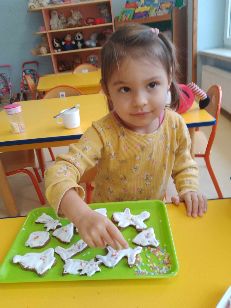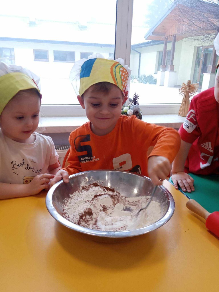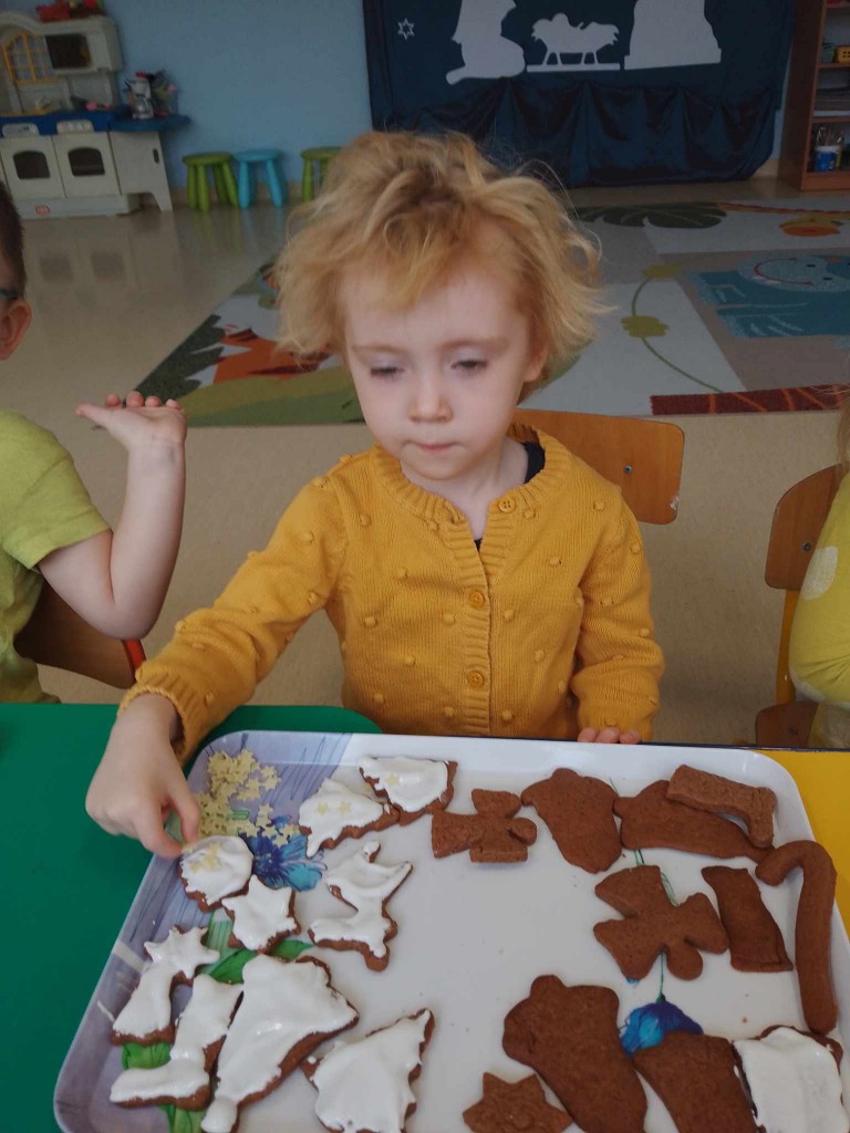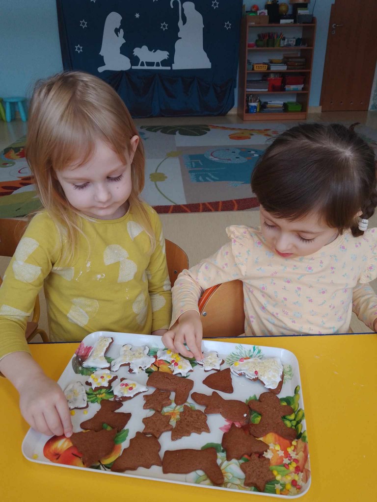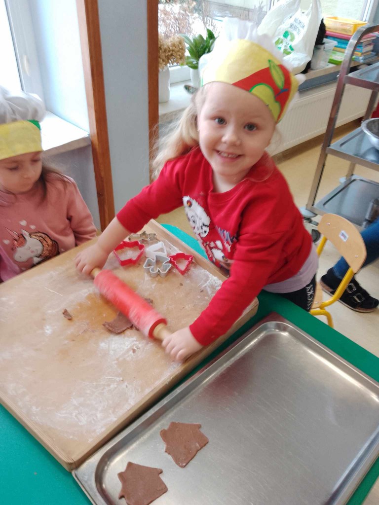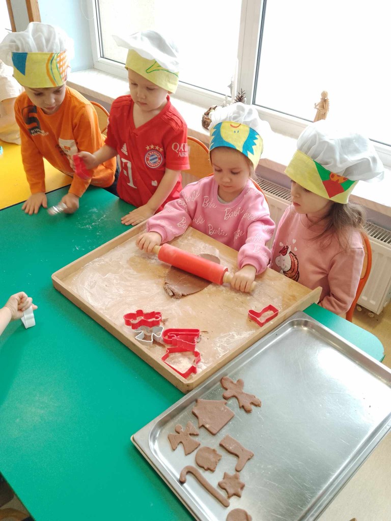 Przedświąteczne przygotowania nasza grupa rozpoczęła od upieczenia pierniczków. Z pomocą pań praca z przygotowaniem wypieków szła sprawnie. Bez trudu szło nam wałkowanie ciasta i wykrawanie różnych kształtów przy pomocy foremek. Nie zabrakło choinek, reniferów, misiów, dzwonków, gwiazdek i wielu, wielu innych. Po włożeniu wyciętych ciastek do piekarnika w całym przedszkolu zaczął unosić się słodki zapach korzennych pierników, przywołujący na myśl dom, święta i rodzinną atmosferę. Wspólne pieczenie i dekorowanie pierników było doskonałą zabawą. Pięknie przyozdobione pierniki będą wspaniałą dekoracją świątecznego stołu, a ich wyjątkowo intensywny aromat będzie nam towarzyszyć przez cały okres Świat Bożego Narodzenia.