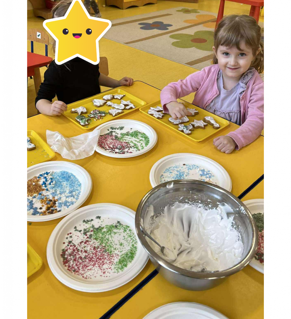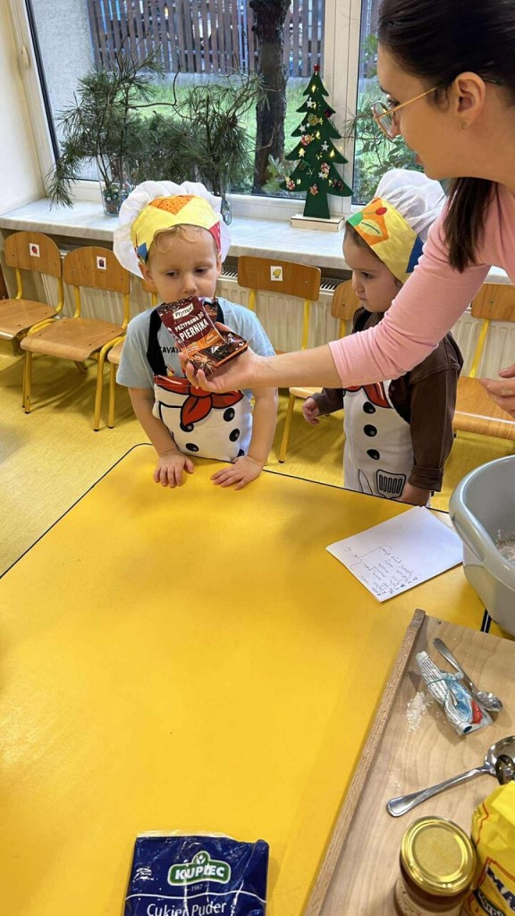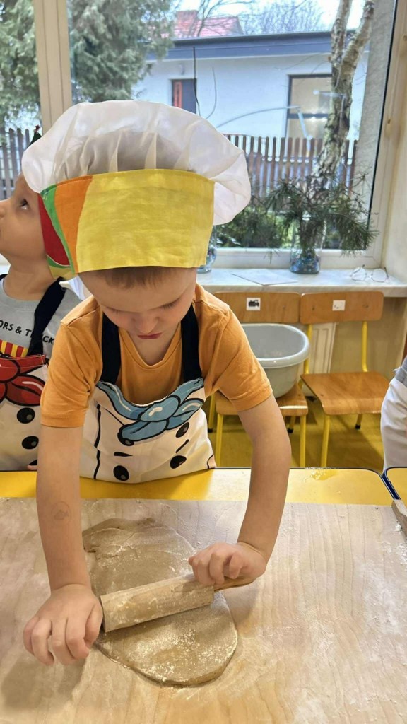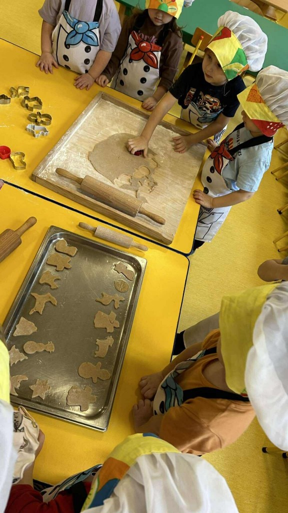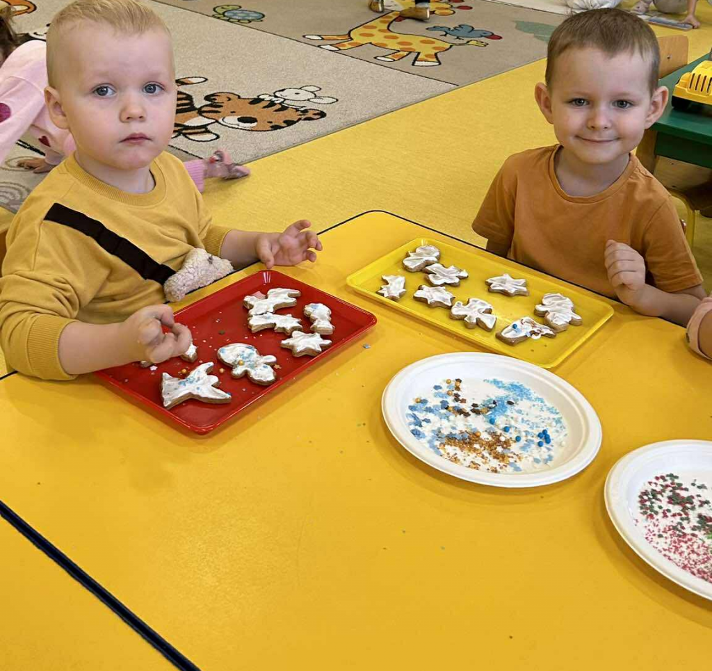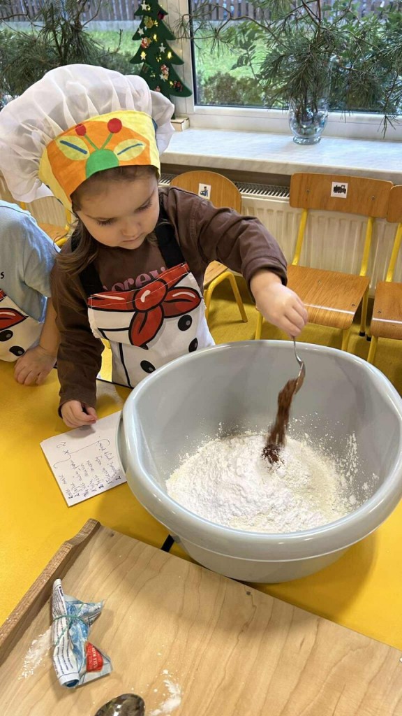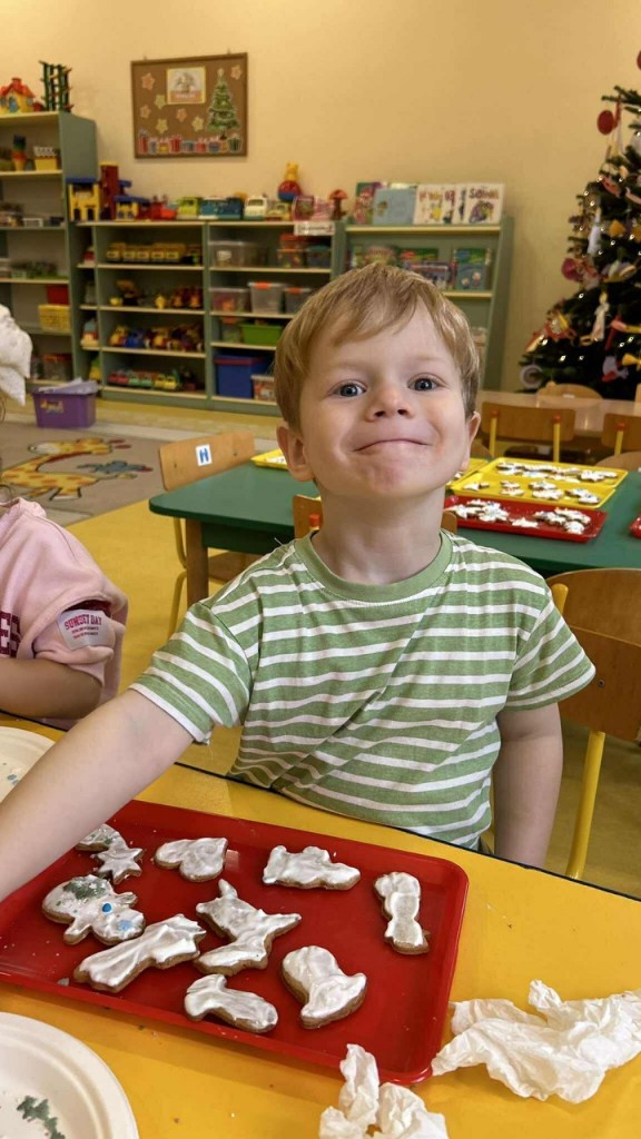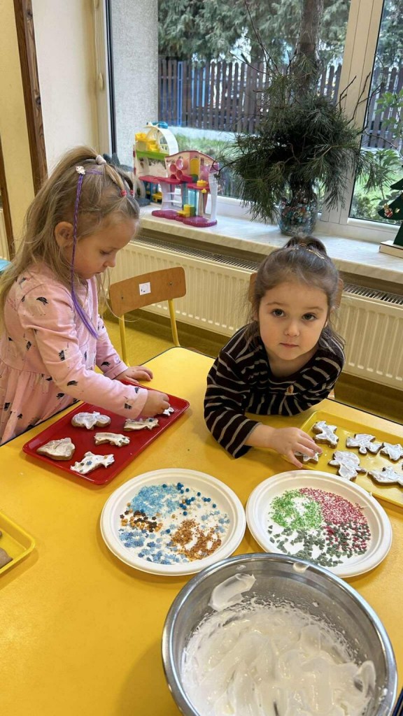 Święta tuż, tuż… czas więc na różne świąteczne działania. Uwielbiamy świąteczne prace plastyczne i tak właśnie powsatły nasze przepięnkne, papierowe choineczki. Najwięcej jednak satysfakci przyniosło nam pieczenie pierników. Dnia 11 grudnia nasza grupa zabrała się z wielkim zapałem do świątecznych wypieków. Wałkowaliśmy ciasto, wykrawaliśmy ciasteczka. Efektem naszego kunsztu piekarskiego były blaszki pełne pierniczków, które zanieśliśmy do kuchni. Dekaracją pierniczków zajęliśmy się kolejnego dnia ozdabiając je lukrem i barwnymi posypkami. Przygotowanie ciasteczek bardzo nam się podobało, a w przedszkolu unosił się wspaniały aromat korzennych przypraw, który wprawiał wszystkich w cudowny, świąteczny nastrój.