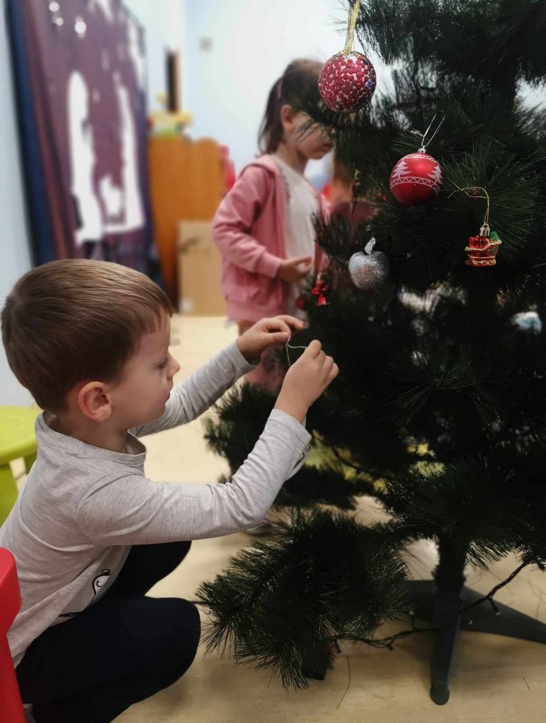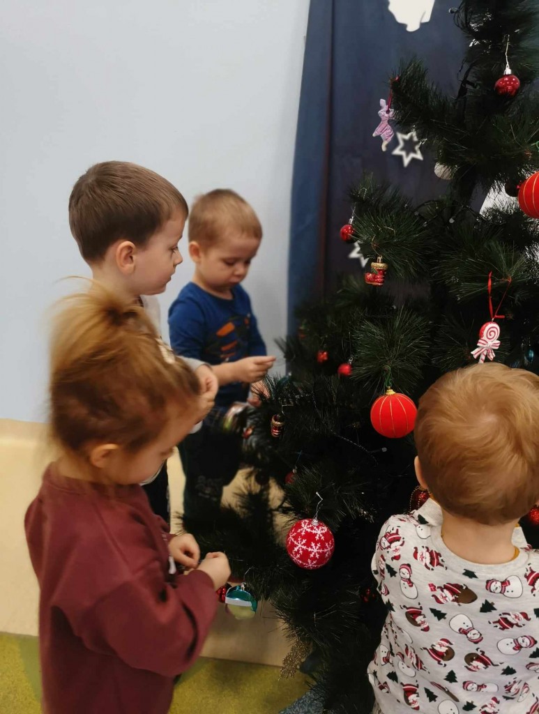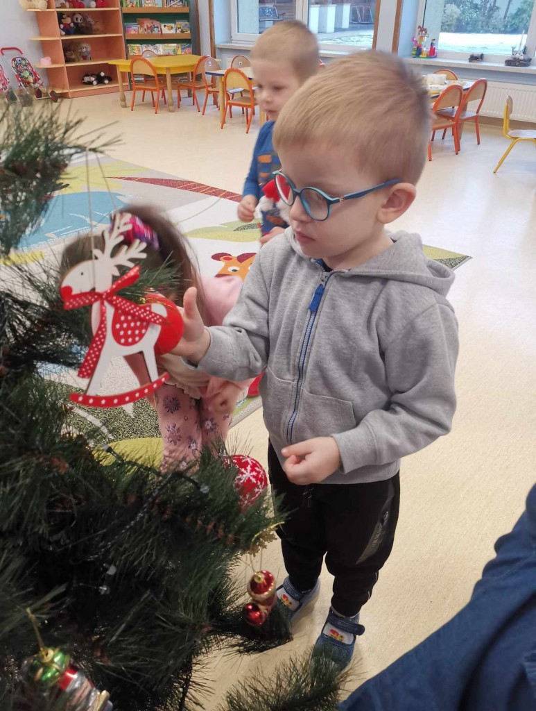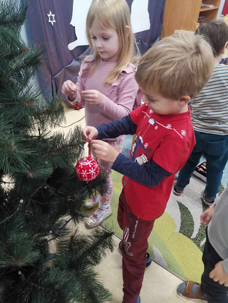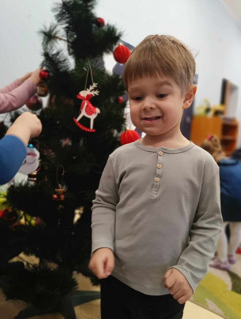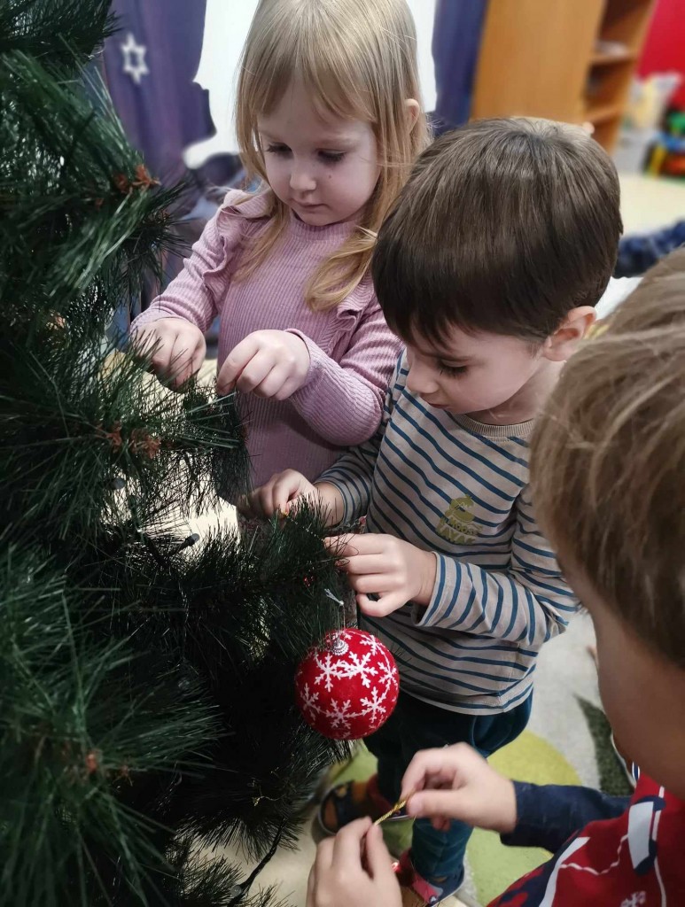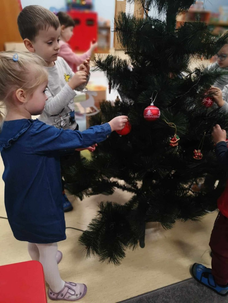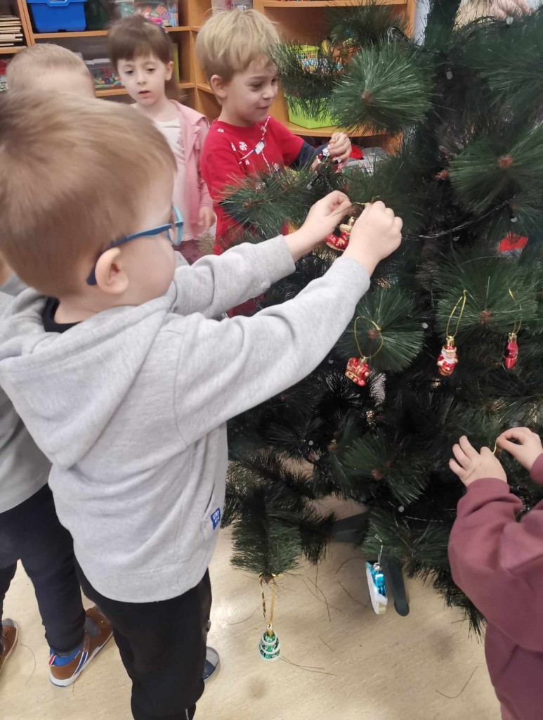 Ubieranie choinki to moment, na który z niecierpliwością czekaliśmy. Z wielkim zaangażowaniem zawieszaliśmy kolorowe bombki, łańcuch oraz lampeczki. Gdy nasze drzewko zostało już przystrojone, wspólnie zaśpiewaliśmy kolędy. W naszej sali zrobiło się świątecznie i wyjątkowo. Choinka wygląda pięknie i przypomina nam, że już niebawem będziemy świętować Boże Narodzenie.