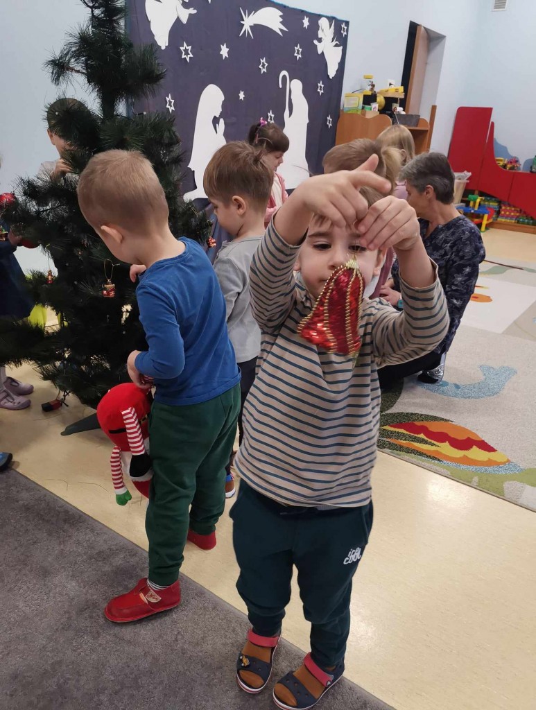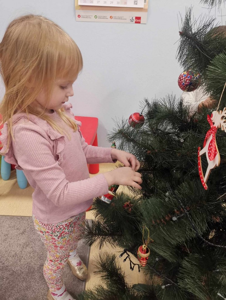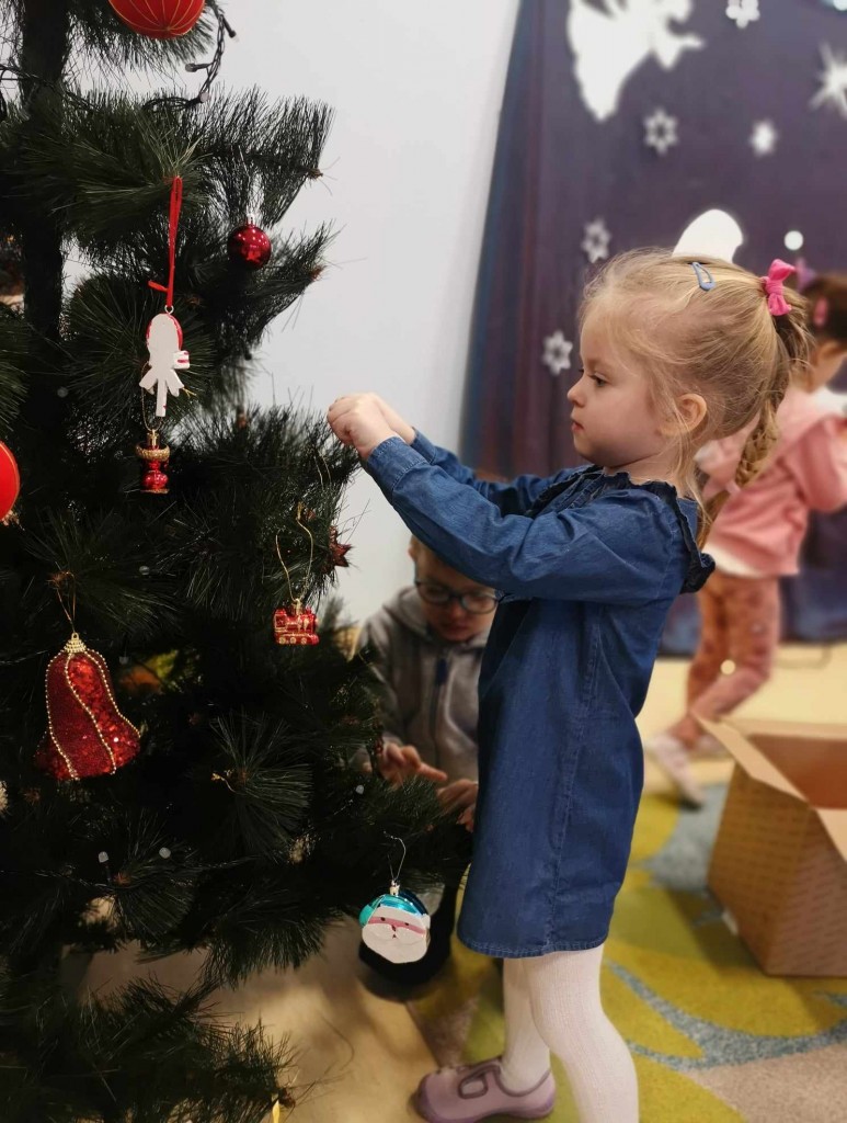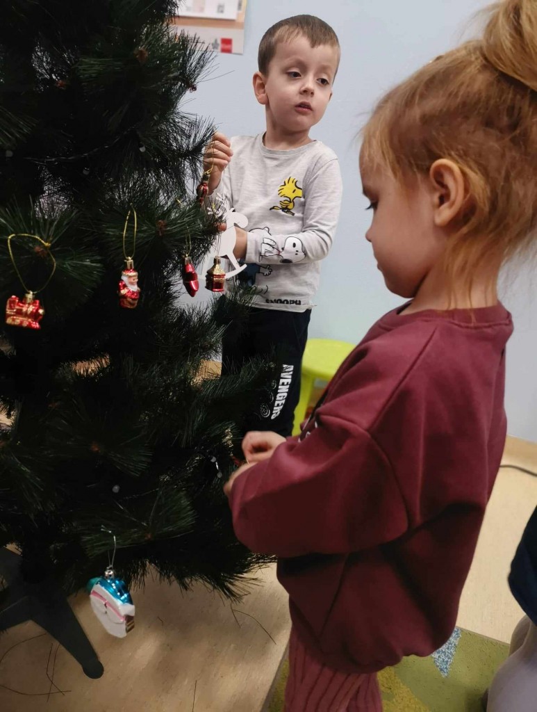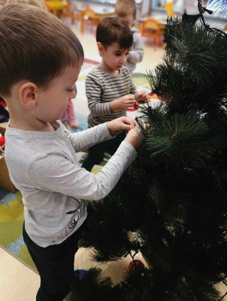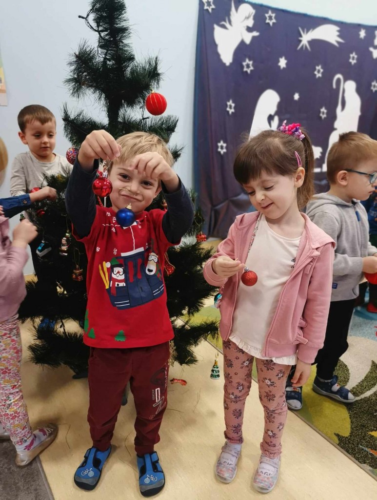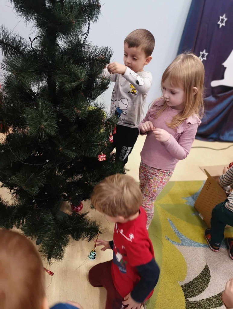 Ubieranie choinki to moment, na który z niecierpliwością czekaliśmy. Z wielkim zaangażowaniem zawieszaliśmy kolorowe bombki, łańcuch oraz lampeczki. Gdy nasze drzewko zostało już przystrojone, wspólnie zaśpiewaliśmy kolędy. W naszej sali zrobiło się świątecznie i wyjątkowo. Choinka wygląda pięknie i przypomina nam, że już niebawem będziemy świętować Boże Narodzenie.
