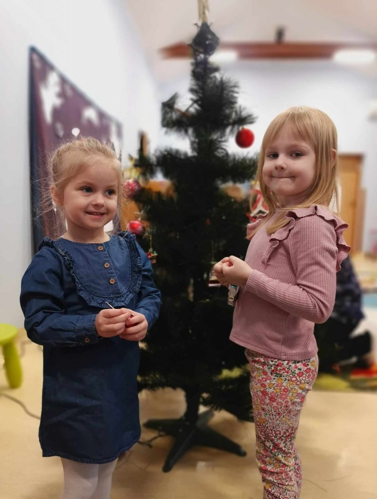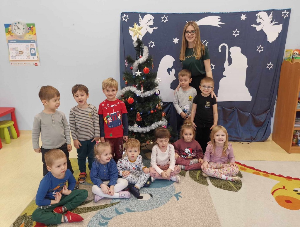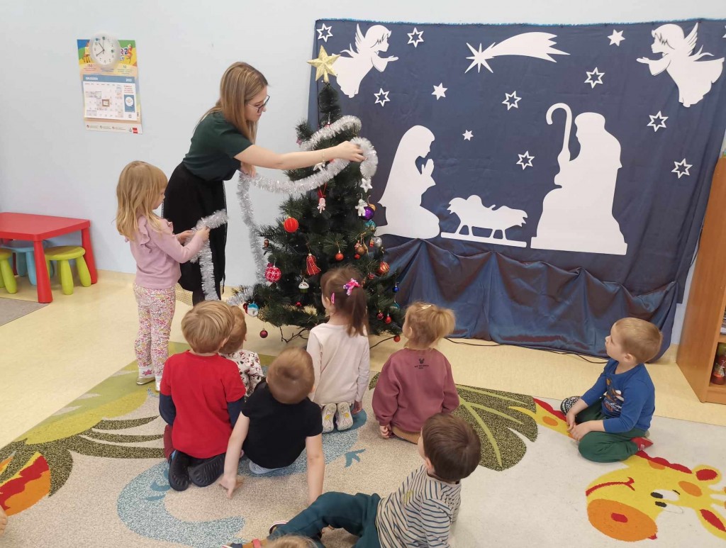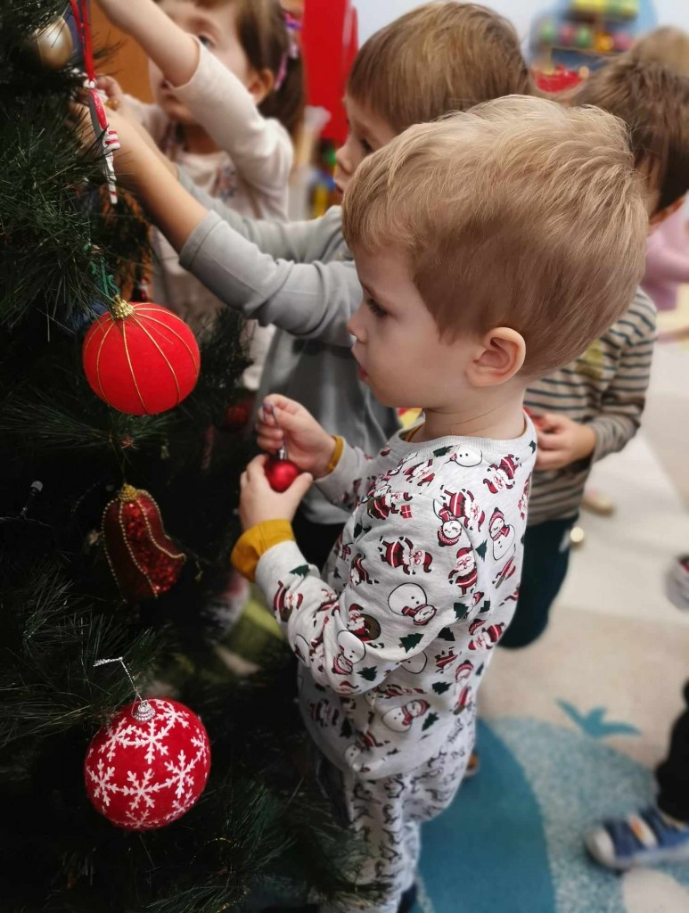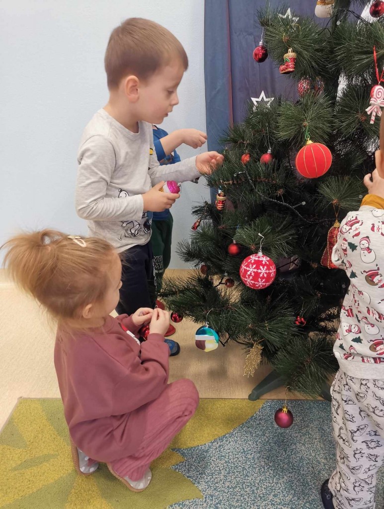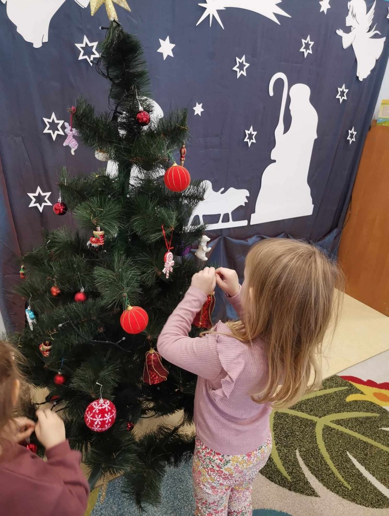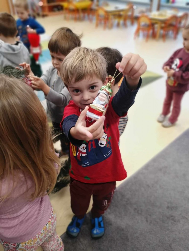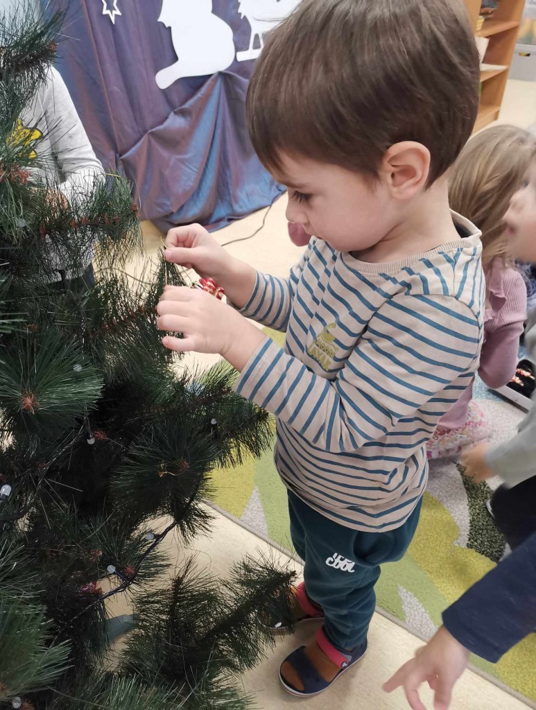 Ubieranie choinki to moment, na który z niecierpliwością czekaliśmy. Z wielkim zaangażowaniem zawieszaliśmy kolorowe bombki, łańcuch oraz lampeczki. Gdy nasze drzewko zostało już przystrojone, wspólnie zaśpiewaliśmy kolędy. W naszej sali zrobiło się świątecznie i wyjątkowo. Choinka wygląda pięknie i przypomina nam, że już niebawem będziemy świętować Boże Narodzenie.