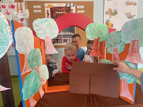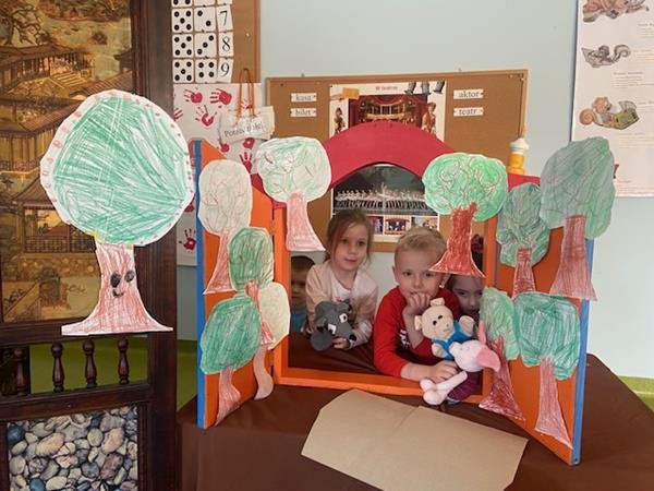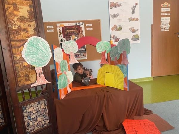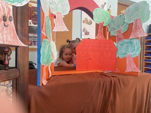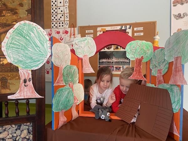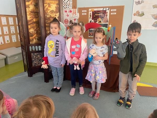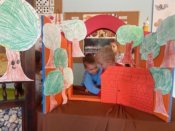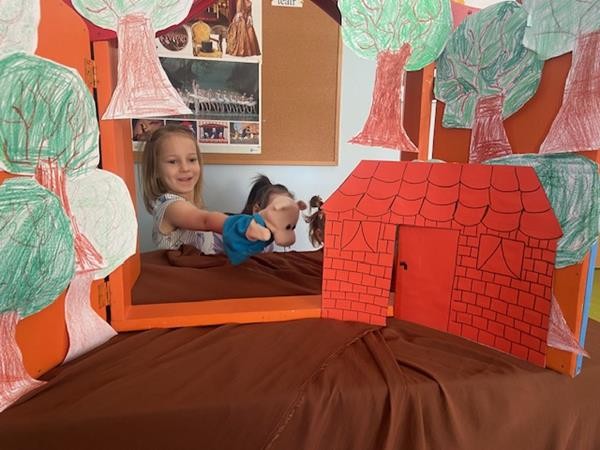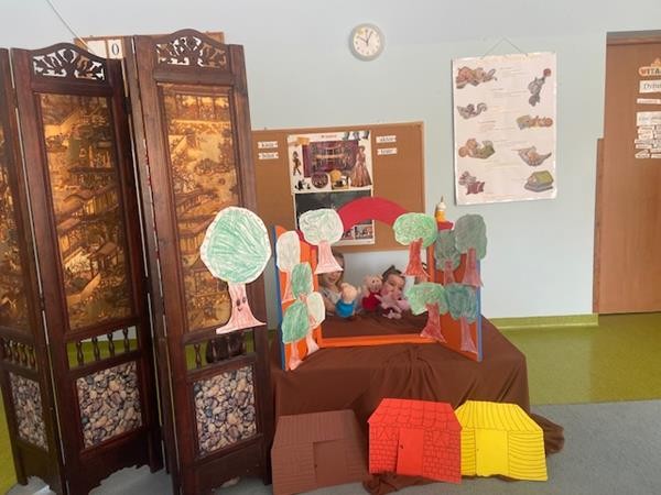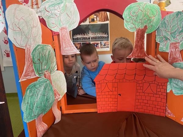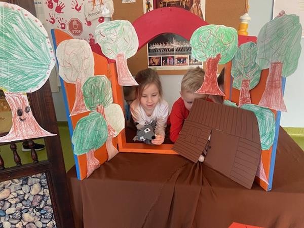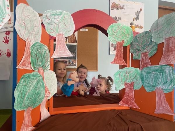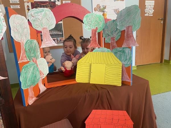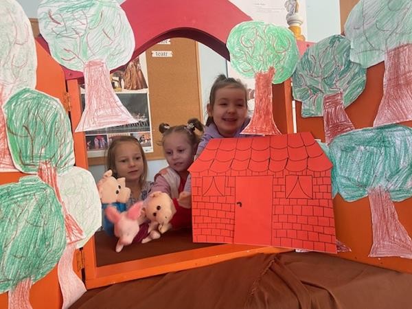 W ramach realizacji tematyki dotyczącej ulubionych baśni i bajek, 5 latki wcieliły się w role bohaterów z bajki "Trzy świnki", odgrywając role w teatrzyku pacynkowym.