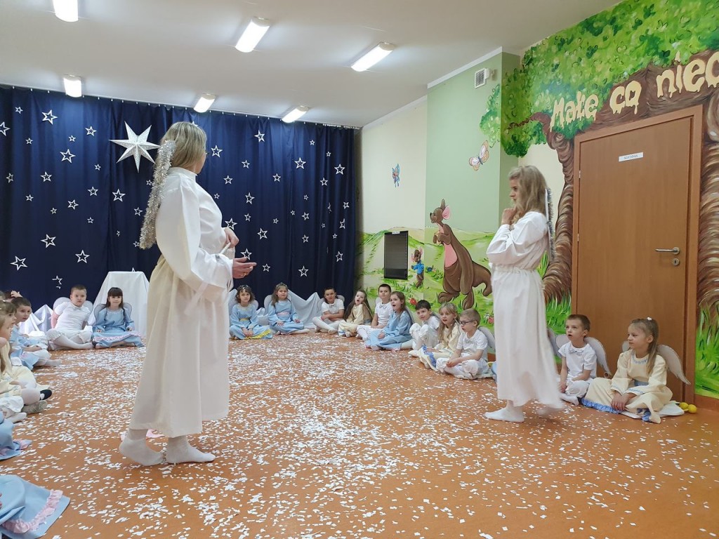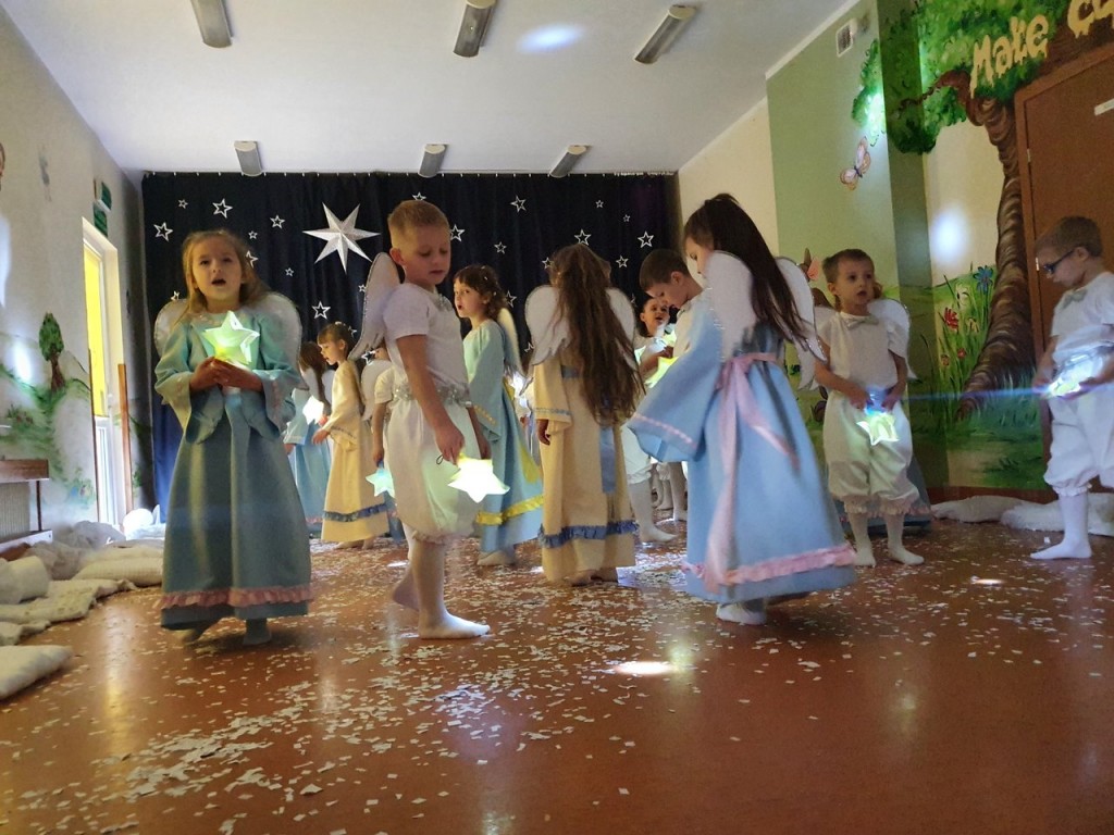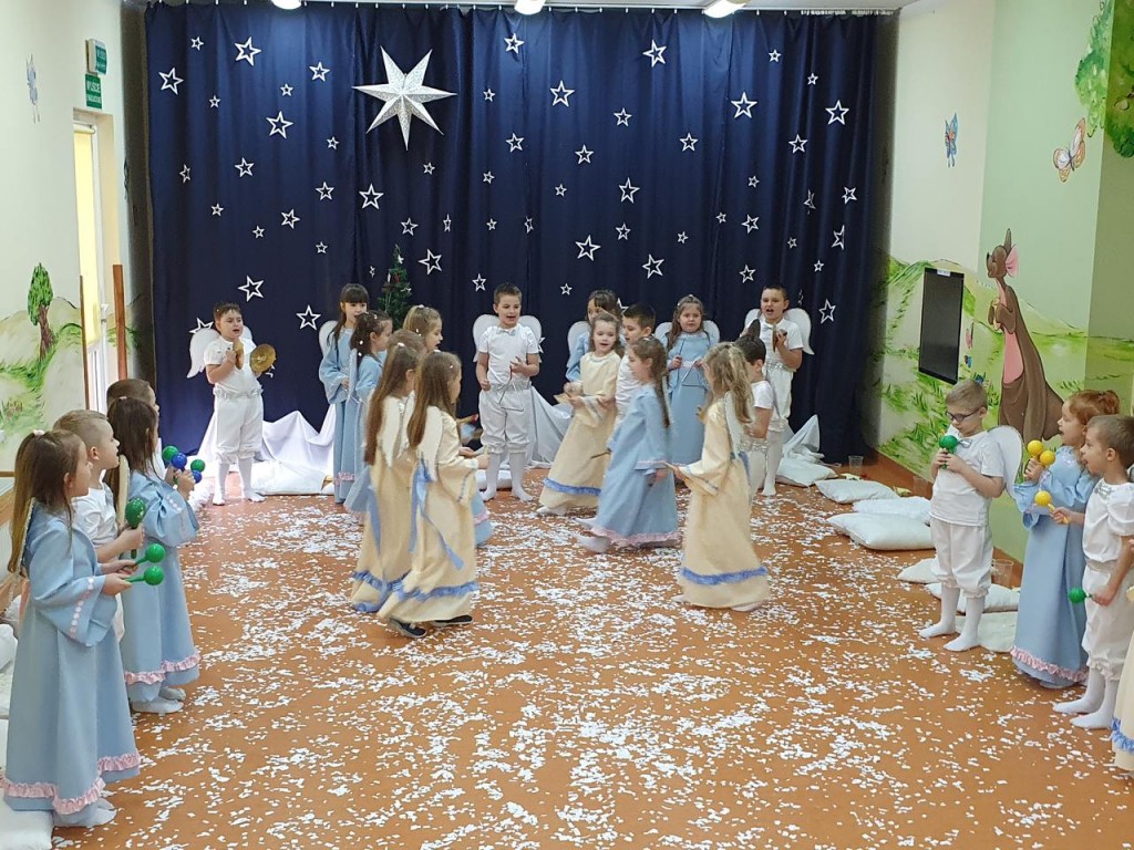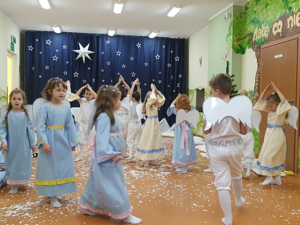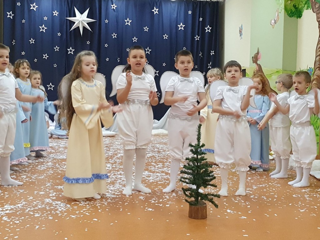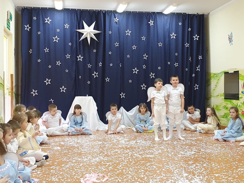 Pierniczki już przygotowane, świąteczne dekoracje również, choinka, ubrana teraz pora na miłą niespodziankę świąteczną, która wszystkich naszych bliskich wprowadzi w atmosferę świąt Bożego Narodzenia – Jasełka. W tym roku nietypowe bo przygotowane w formie filmu. W niezwykle uroczej scenerii przypominającej niebiański raj wszyscy z dużym przejęciem i zaangażowaniem wiernie odtwarzaliśmy swoje role oraz prezentowaliśmy umiejętności recytatorskie i wokalne na chwałę małego Pana Jezusa. Fabuła przedstawienia opowiadała o tym, jak aniołki przygotowywały się na przyjście Pana Jezusa by godnie Go przywitać. Zrobiły porządki w niebie, przygotowały piękną choinkę, przywitały Maleńkiego grając na instrumentach.