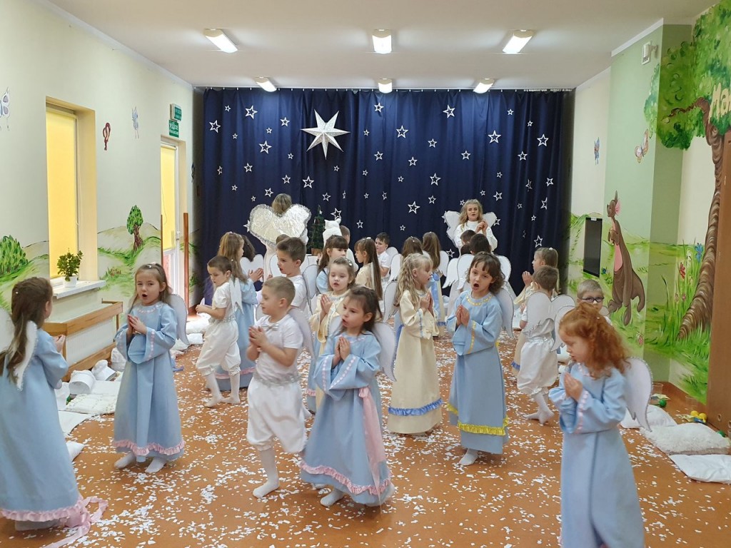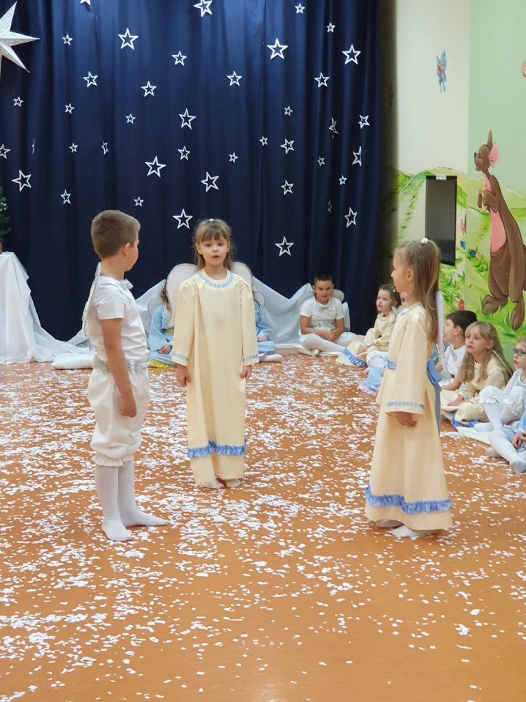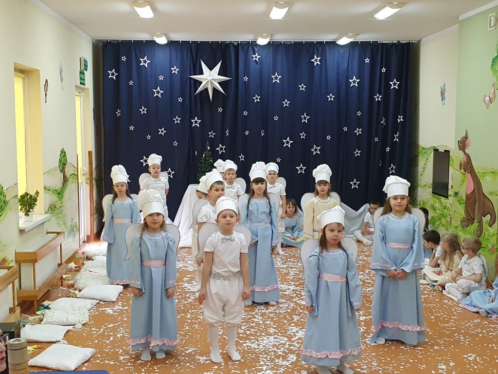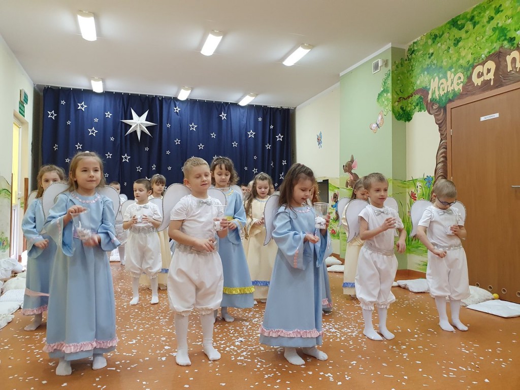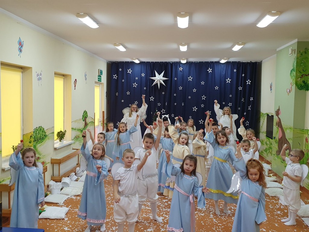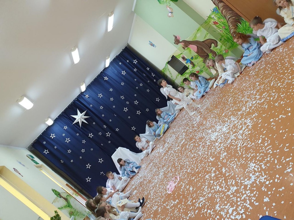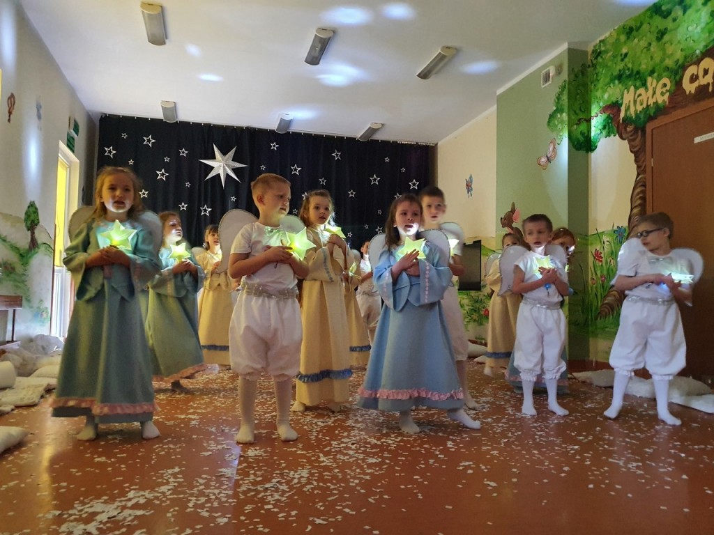 Pierniczki już przygotowane, świąteczne dekoracje również, choinka, ubrana teraz pora na miłą niespodziankę świąteczną, która wszystkich naszych bliskich wprowadzi w atmosferę świąt Bożego Narodzenia – Jasełka. W tym roku nietypowe bo przygotowane w formie filmu. W niezwykle uroczej scenerii przypominającej niebiański raj wszyscy z dużym przejęciem i zaangażowaniem wiernie odtwarzaliśmy swoje role oraz prezentowaliśmy umiejętności recytatorskie i wokalne na chwałę małego Pana Jezusa. Fabuła przedstawienia opowiadała o tym, jak aniołki przygotowywały się na przyjście Pana Jezusa by godnie Go przywitać. Zrobiły porządki w niebie, przygotowały piękną choinkę, przywitały Maleńkiego grając na instrumentach.