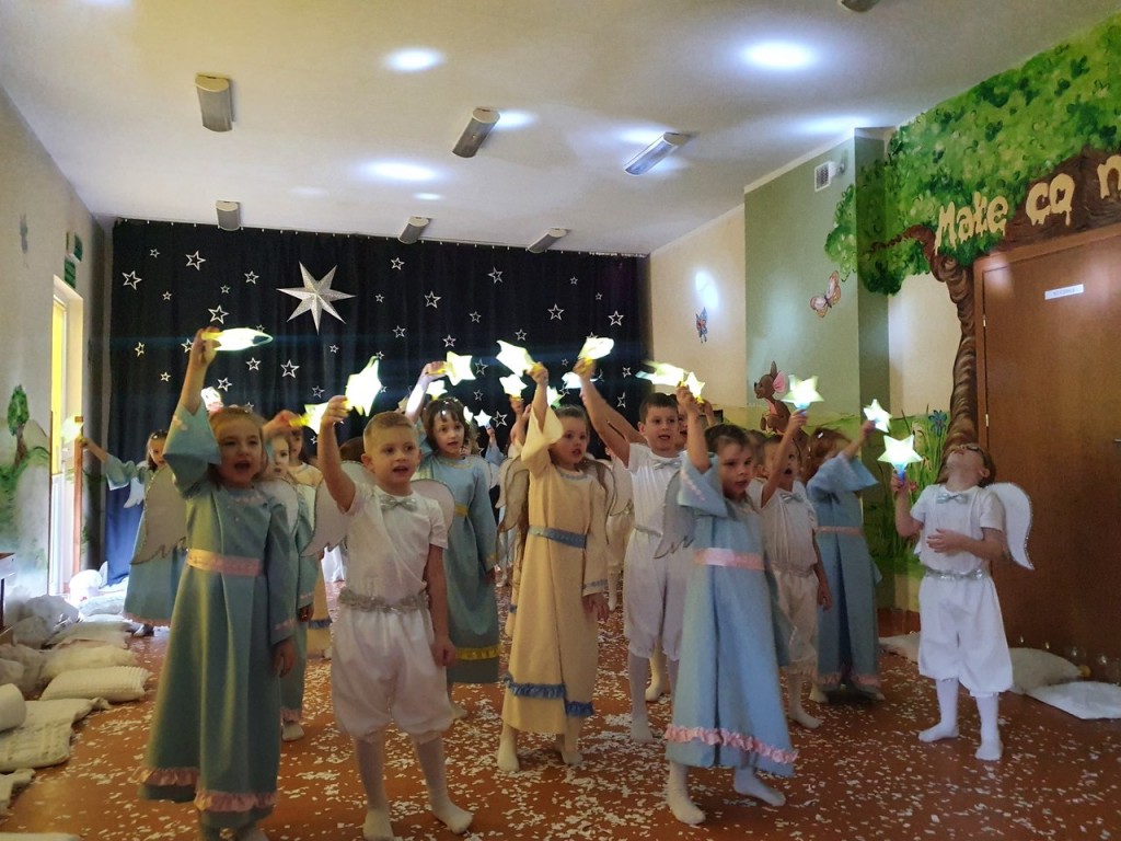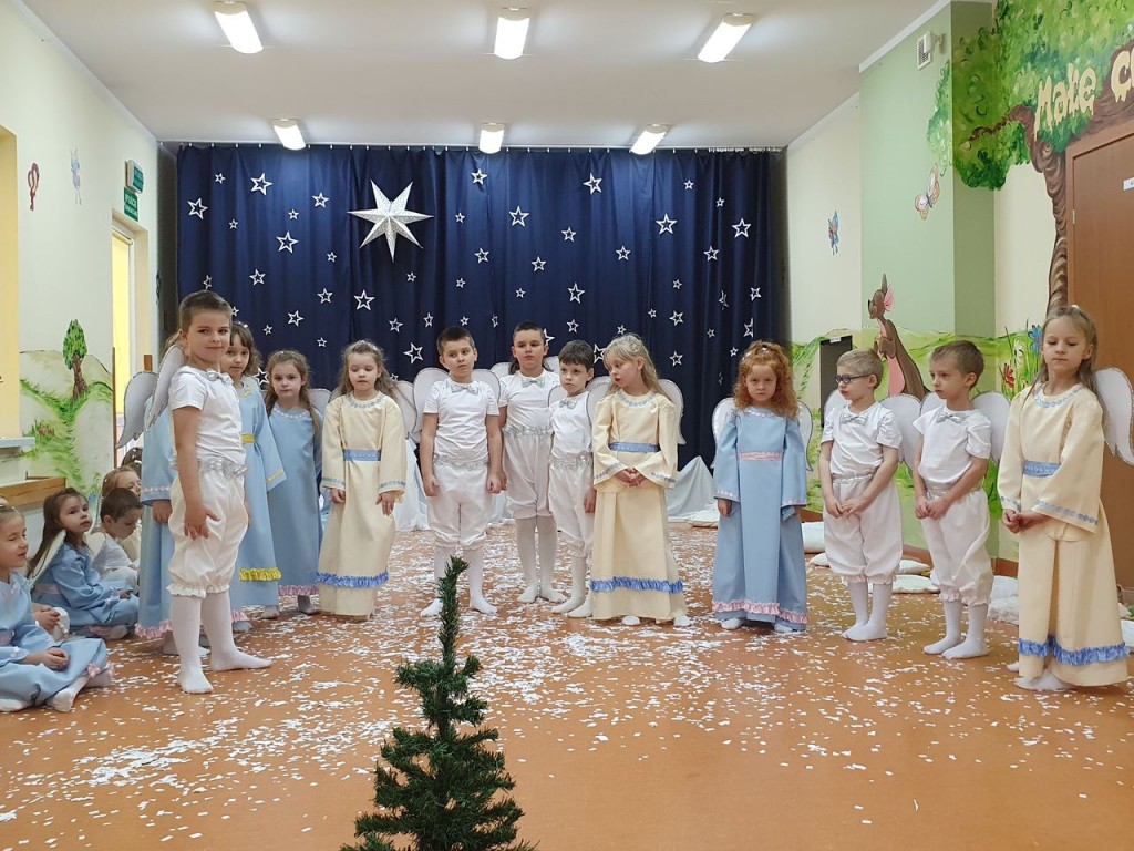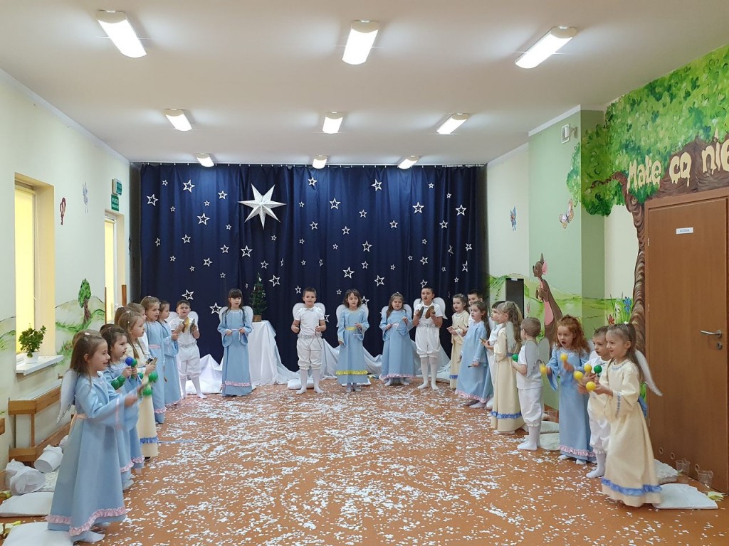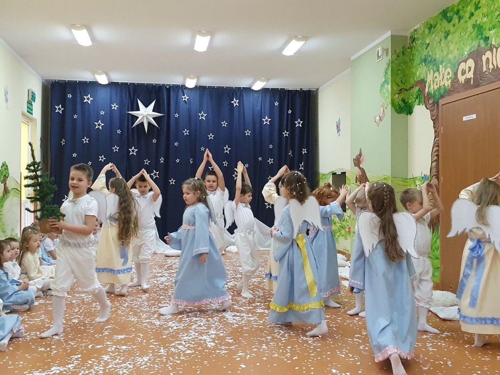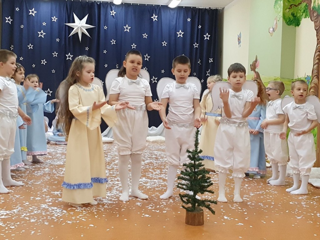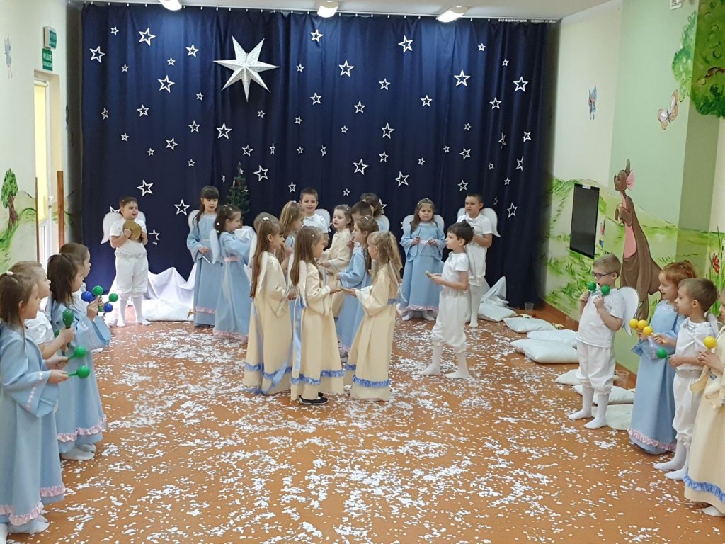 Pierniczki już przygotowane, świąteczne dekoracje również, choinka, ubrana teraz pora na miłą niespodziankę świąteczną, która wszystkich naszych bliskich wprowadzi w atmosferę świąt Bożego Narodzenia – Jasełka. W tym roku nietypowe bo przygotowane w formie filmu. W niezwykle uroczej scenerii przypominającej niebiański raj wszyscy z dużym przejęciem i zaangażowaniem wiernie odtwarzaliśmy swoje role oraz prezentowaliśmy umiejętności recytatorskie i wokalne na chwałę małego Pana Jezusa. Fabuła przedstawienia opowiadała o tym, jak aniołki przygotowywały się na przyjście Pana Jezusa by godnie Go przywitać. Zrobiły porządki w niebie, przygotowały piękną choinkę, przywitały Maleńkiego grając na instrumentach.