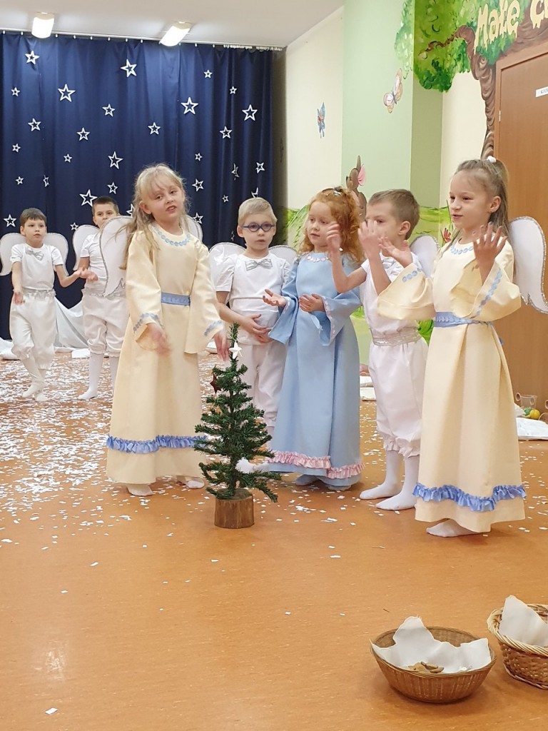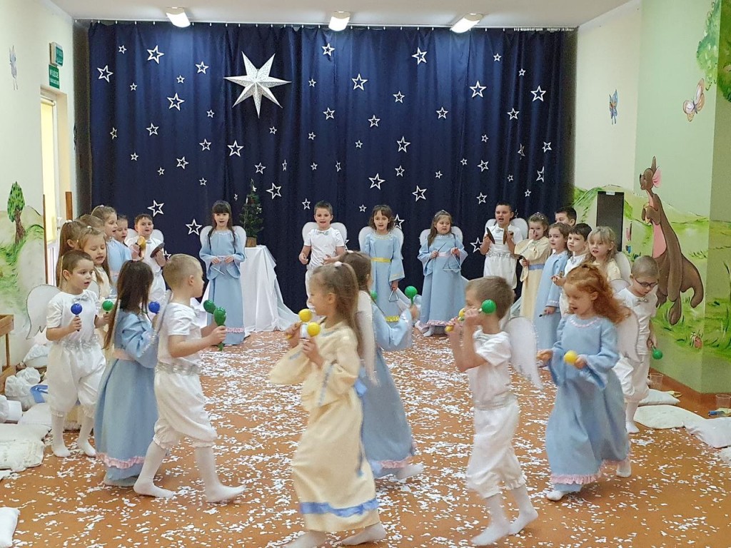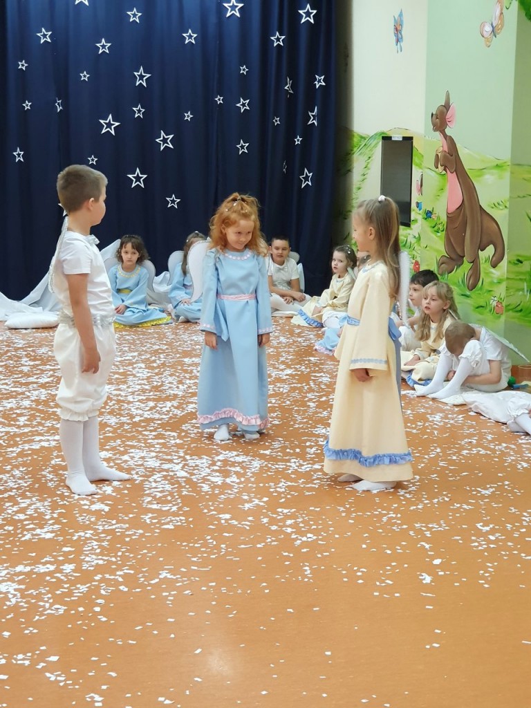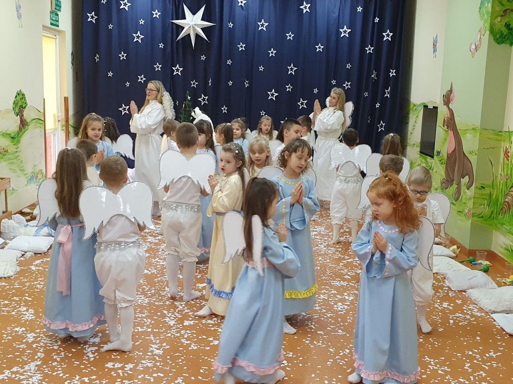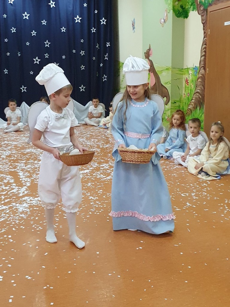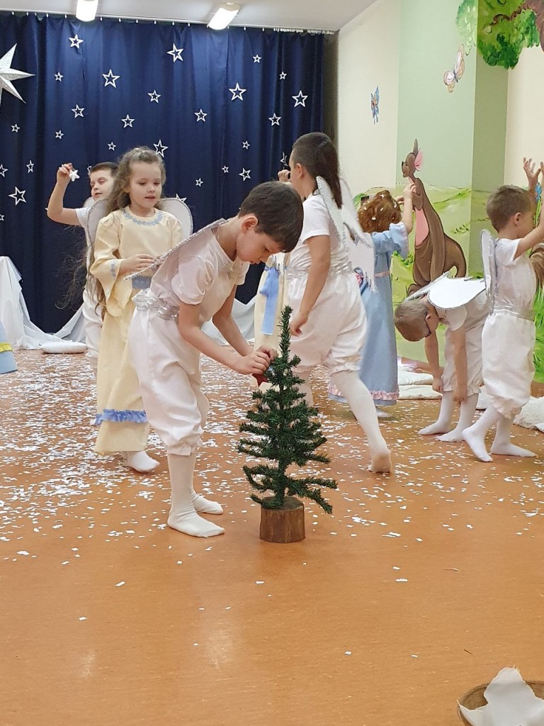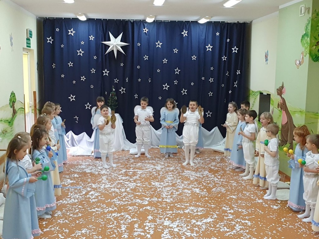 Pierniczki już przygotowane, świąteczne dekoracje również, choinka, ubrana teraz pora na miłą niespodziankę świąteczną, która wszystkich naszych bliskich wprowadzi w atmosferę świąt Bożego Narodzenia – Jasełka. W tym roku nietypowe bo przygotowane w formie filmu. W niezwykle uroczej scenerii przypominającej niebiański raj wszyscy z dużym przejęciem i zaangażowaniem wiernie odtwarzaliśmy swoje role oraz prezentowaliśmy umiejętności recytatorskie i wokalne na chwałę małego Pana Jezusa. Fabuła przedstawienia opowiadała o tym, jak aniołki przygotowywały się na przyjście Pana Jezusa by godnie Go przywitać. Zrobiły porządki w niebie, przygotowały piękną choinkę, przywitały Maleńkiego grając na instrumentach.