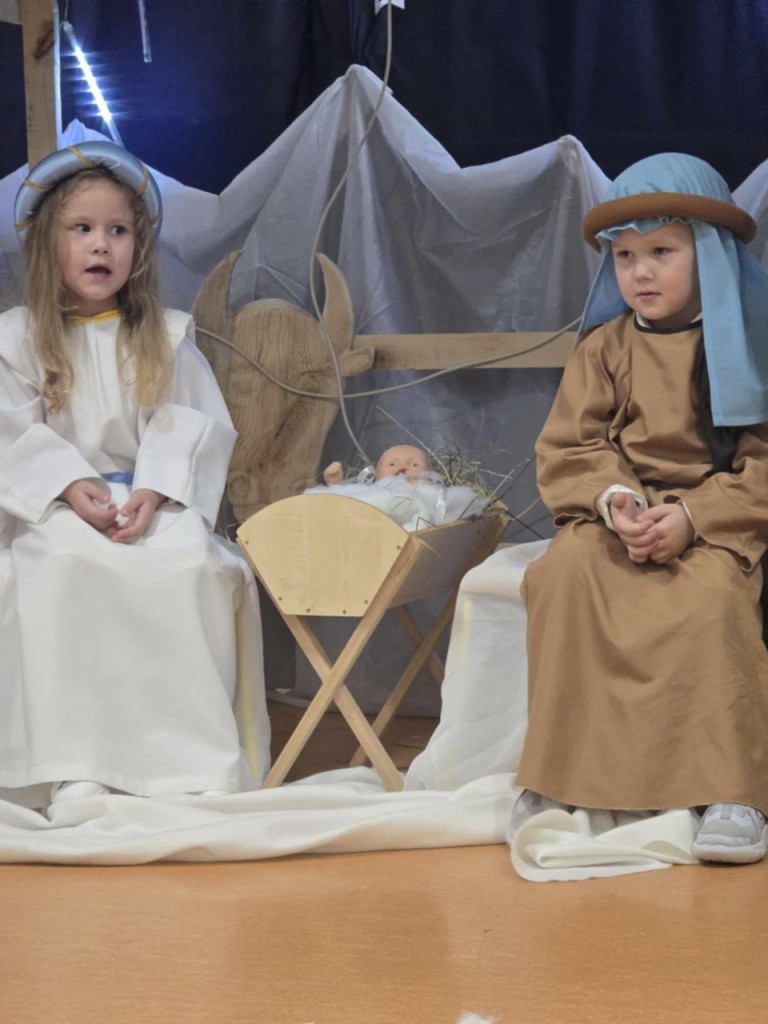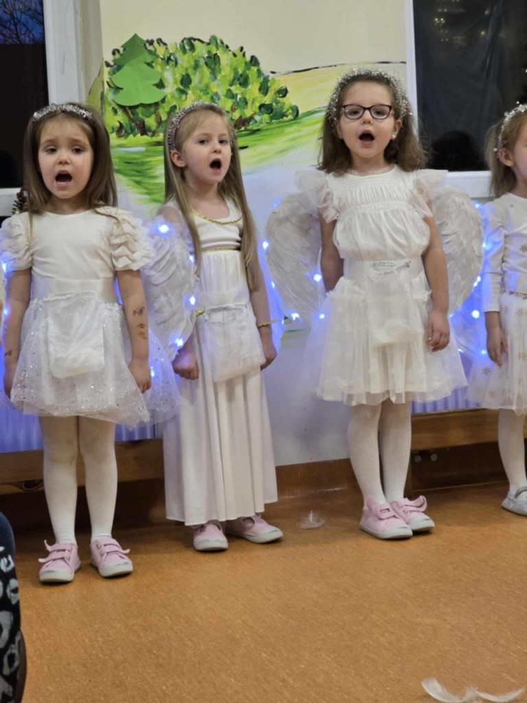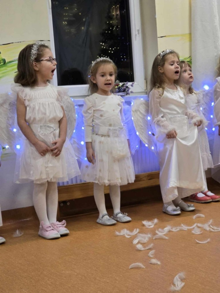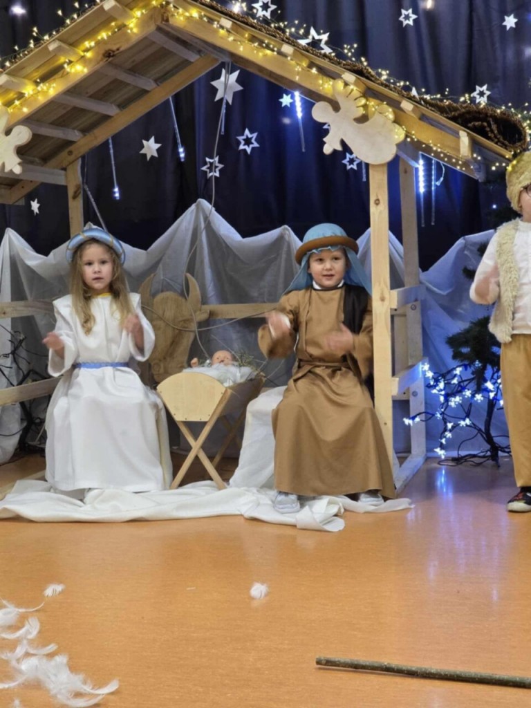 Dnia 19 grudnia odbyły się w naszej grupie Jasełka dla rodziców. Głównym celem tej uroczystości było wprowadzenie w radosną atmosferę, jaką przynoszą święta Bożego Narodzenia. Przedstawienie było wyjątkowe. My -Mali aktorzy, we wspaniałych strojach prezentowaliśmy się doskonale. Sala wypełniona była aniołkami i pasterzami, którzy wspólnie śpiewali kolędy oraz wspaniale recytowali przygotowane wierszyki. Takie podniosłe chwile nie tylko utrwalają nam znajomość tradycji i zwyczajów świątecznych, lecz wzmacniają serdeczne relacje między nami.