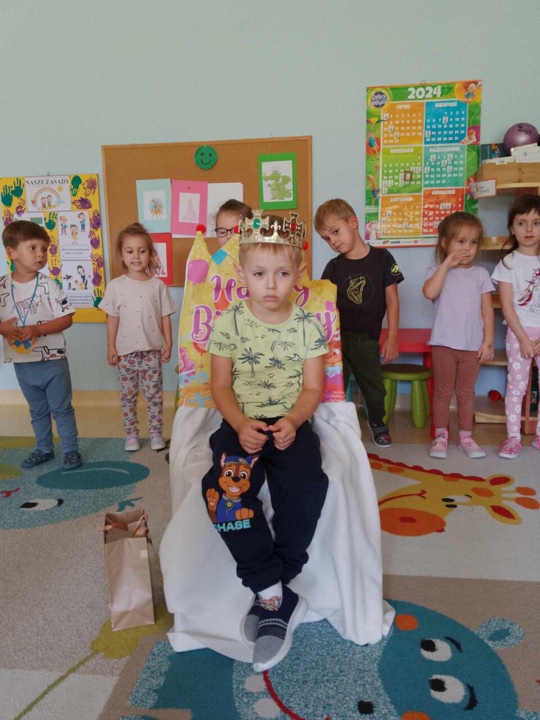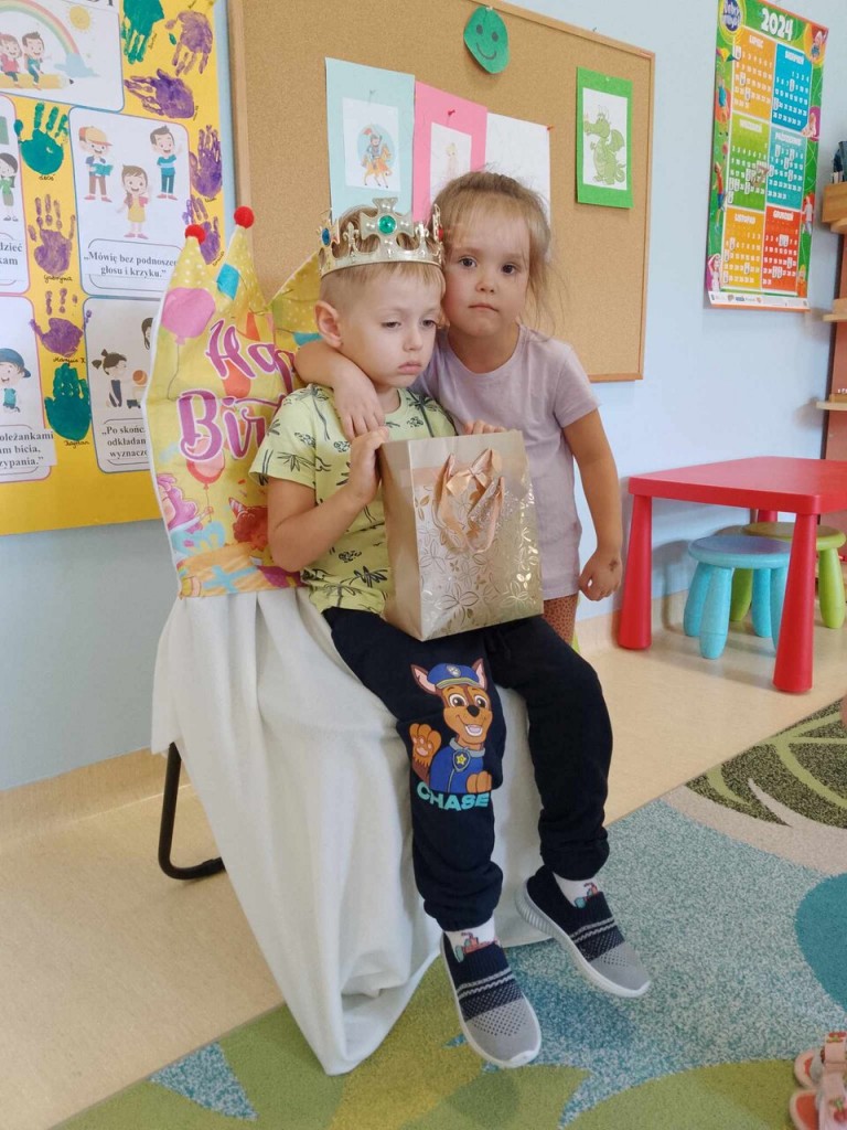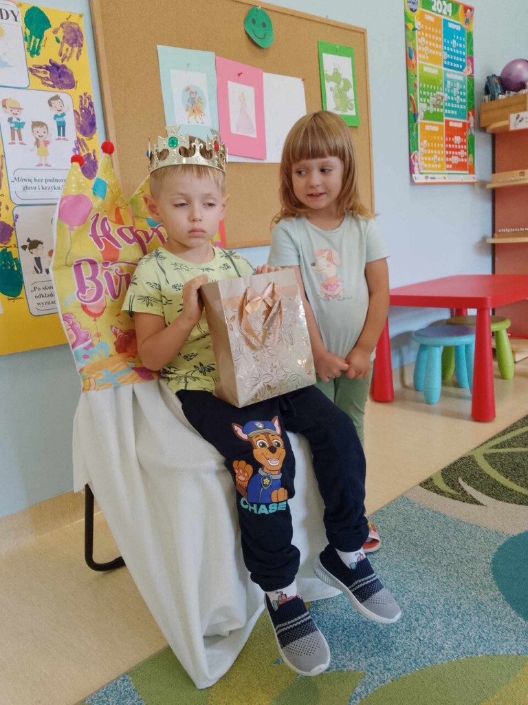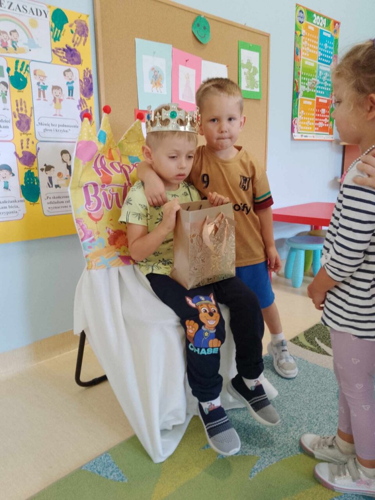 We wrześniu swoje urodzinki obchodzili: Jan i Mikołaj Cz.. Z tej okazji przynieśli do przedszkola pyszne cukierki. A my życzyliśmy im dużo zdrowia, uśmiechu i radości. To był ważny dzień dlatego nasi jubilaci siedzieli na honorowym krześle i na głowie mieli korony. W prezencie od nas otrzymali książkę pełną życzeń. Jeszcze raz wszystkiego najlepszego.