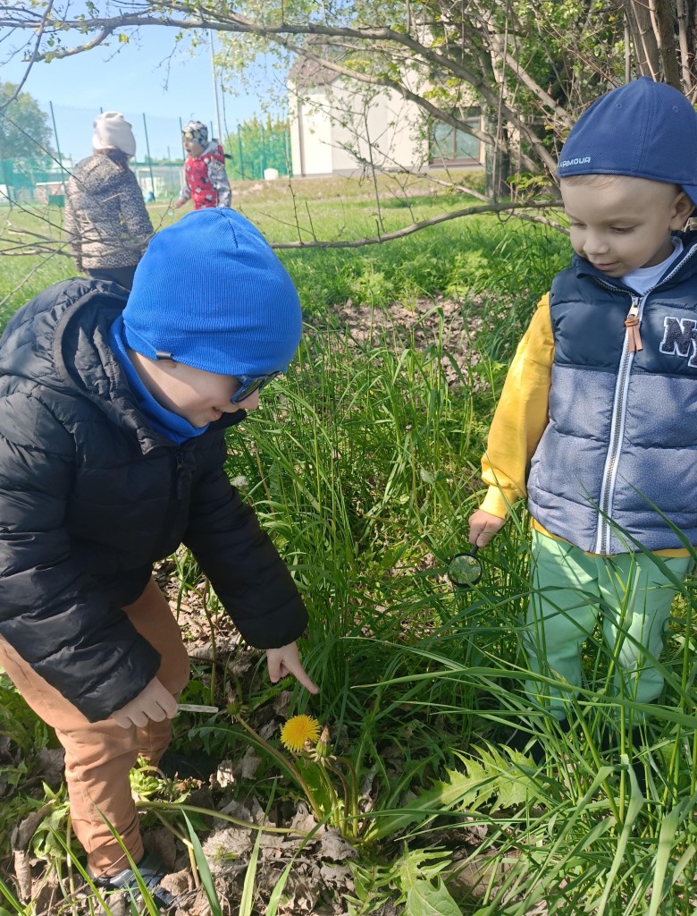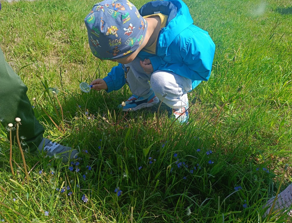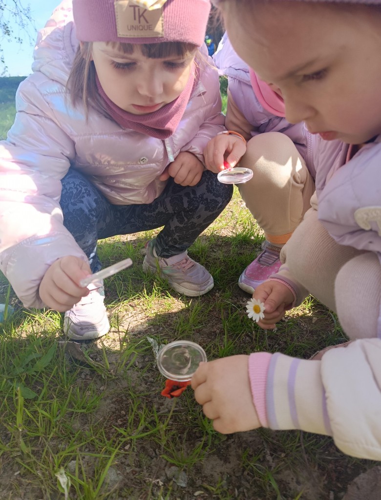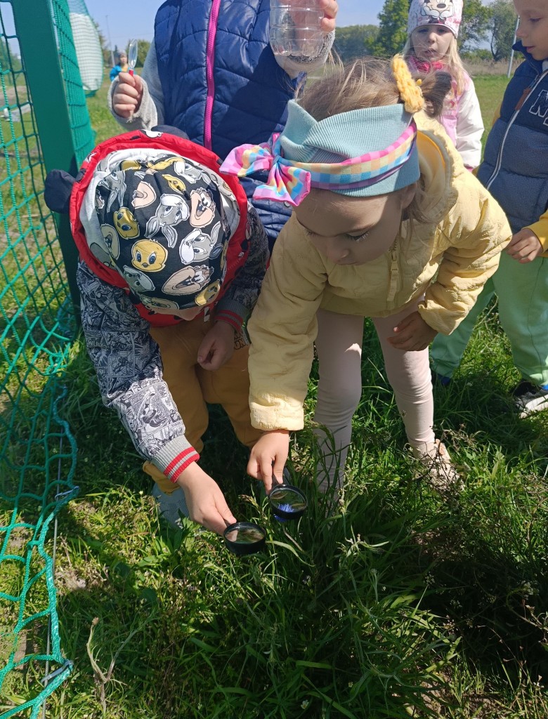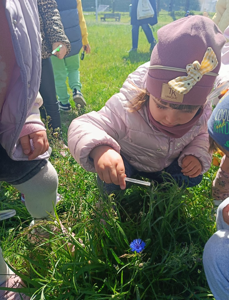 Korzystając ze słonecznej pogody dzieci wybrały się na spacer na pobliską łąkę. Ciekawe otaczającego je świata chętnie brały udział w poszukiwaniu roślin i zwierząt żyjących na łące. Przedszkolaki miały do dyspozycji lupy, przez które wypatrywały owady, a także obserwowały kwiaty w powiększeniu. Wyprawa ta, miała na celu kształtowanie umiejętności obserwacji roślin i owadów, a także rozbudzanie zainteresowań przyrodą i otoczeniem.
