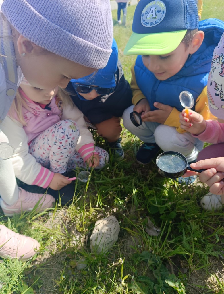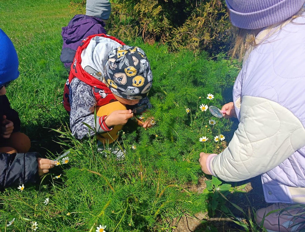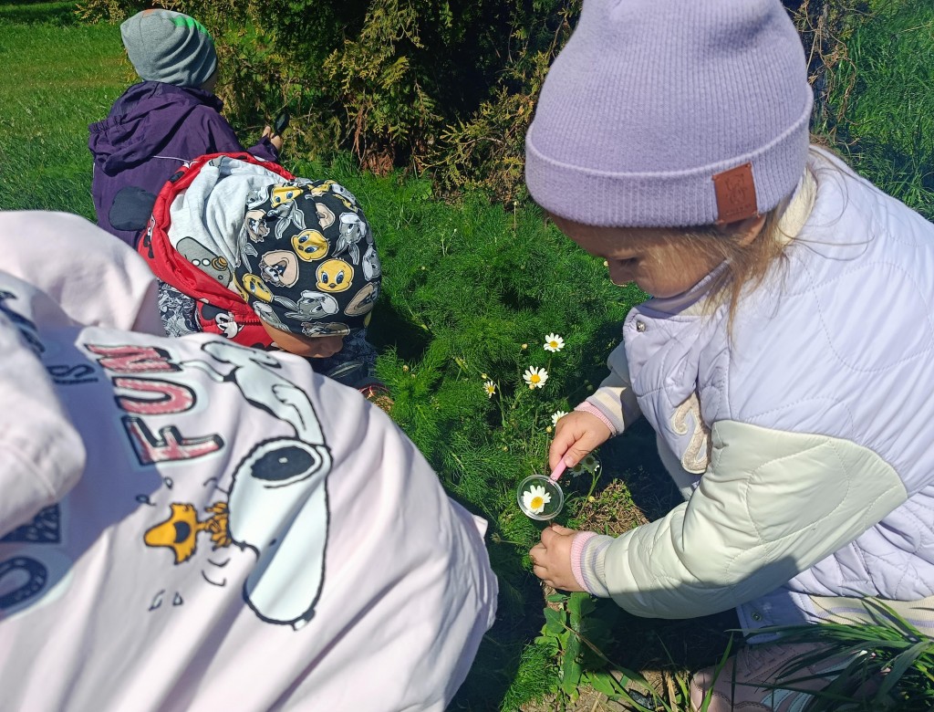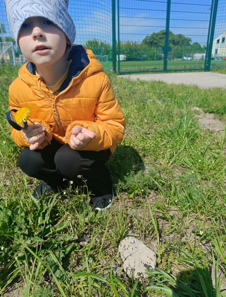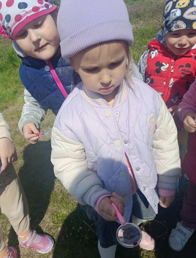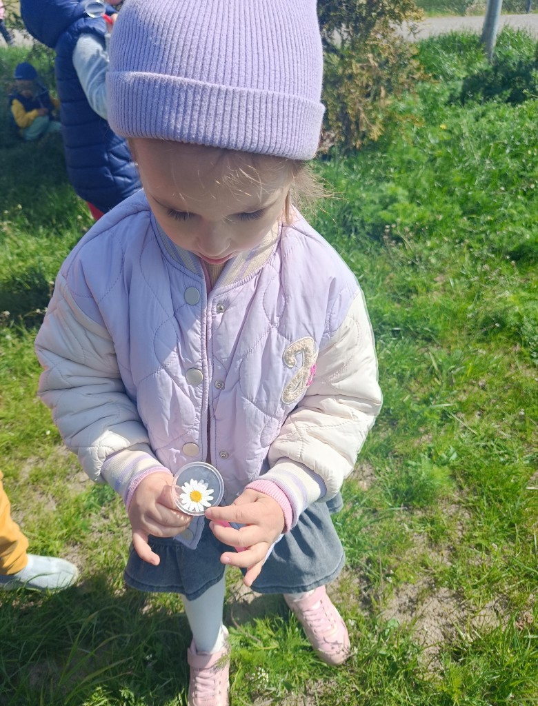 Korzystając ze słonecznej pogody dzieci wybrały się na spacer na pobliską łąkę. Ciekawe otaczającego je świata chętnie brały udział w poszukiwaniu roślin i zwierząt żyjących na łące. Przedszkolaki miały do dyspozycji lupy, przez które wypatrywały owady, a także obserwowały kwiaty w powiększeniu. Wyprawa ta, miała na celu kształtowanie umiejętności obserwacji roślin i owadów, a także rozbudzanie zainteresowań przyrodą i otoczeniem.