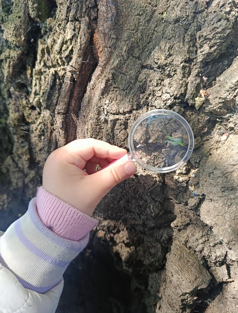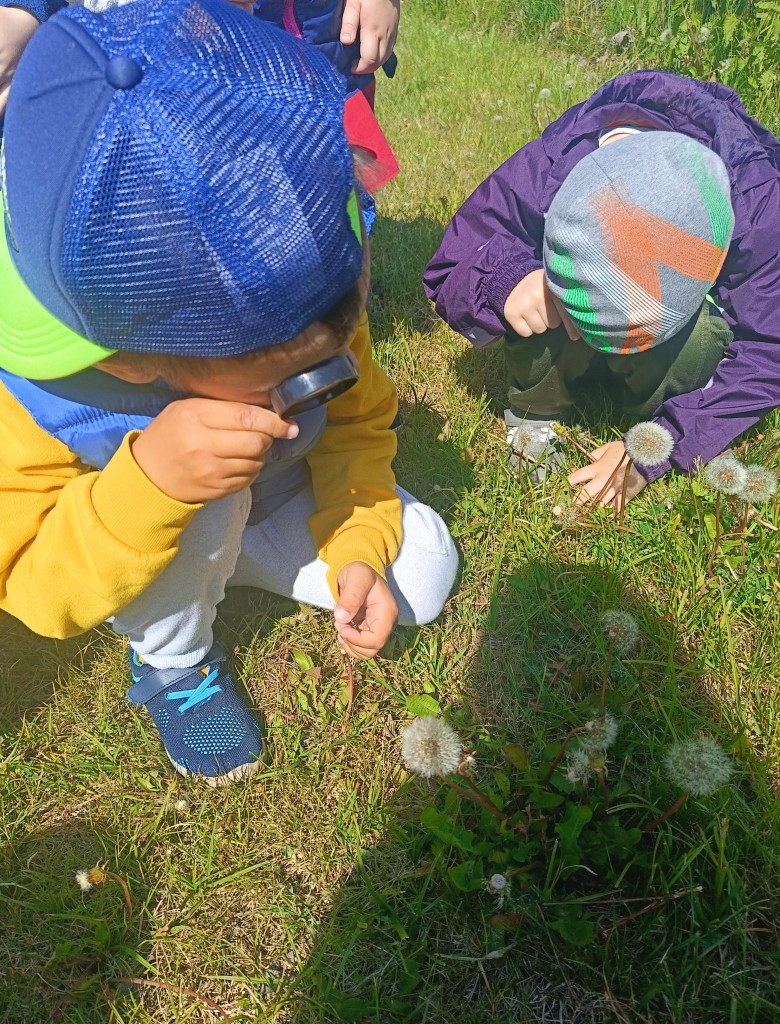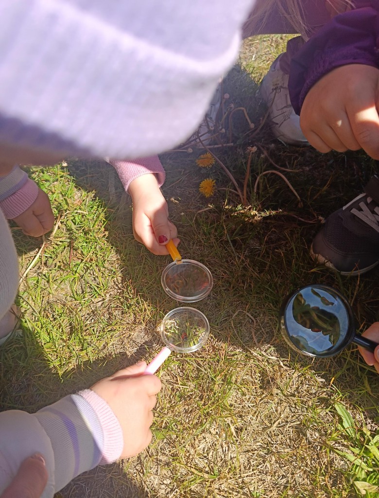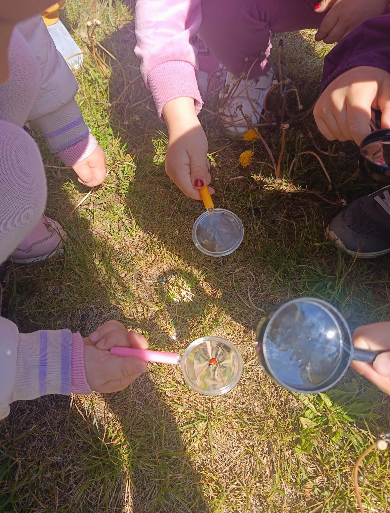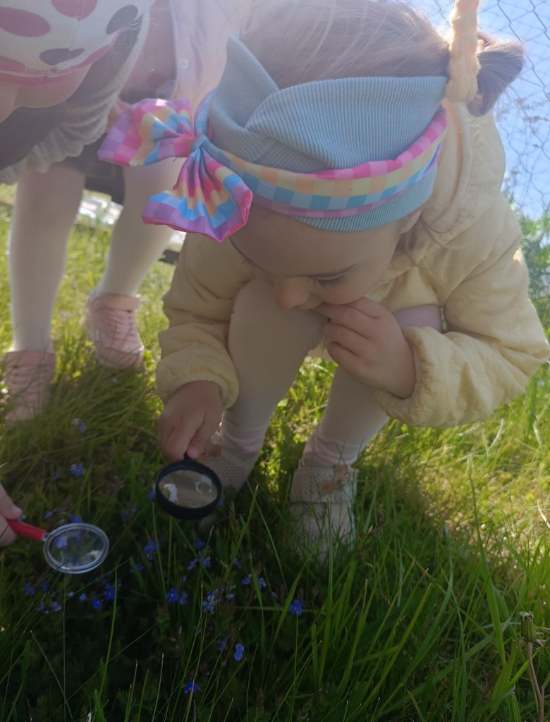 Korzystając ze słonecznej pogody dzieci wybrały się na spacer na pobliską łąkę. Ciekawe otaczającego je świata chętnie brały udział w poszukiwaniu roślin i zwierząt żyjących na łące. Przedszkolaki miały do dyspozycji lupy, przez które wypatrywały owady, a także obserwowały kwiaty w powiększeniu. Wyprawa ta, miała na celu kształtowanie umiejętności obserwacji roślin i owadów, a także rozbudzanie zainteresowań przyrodą i otoczeniem.